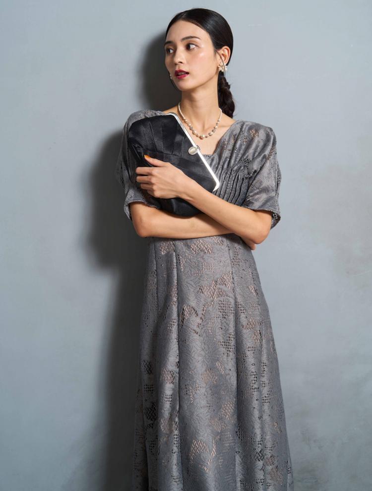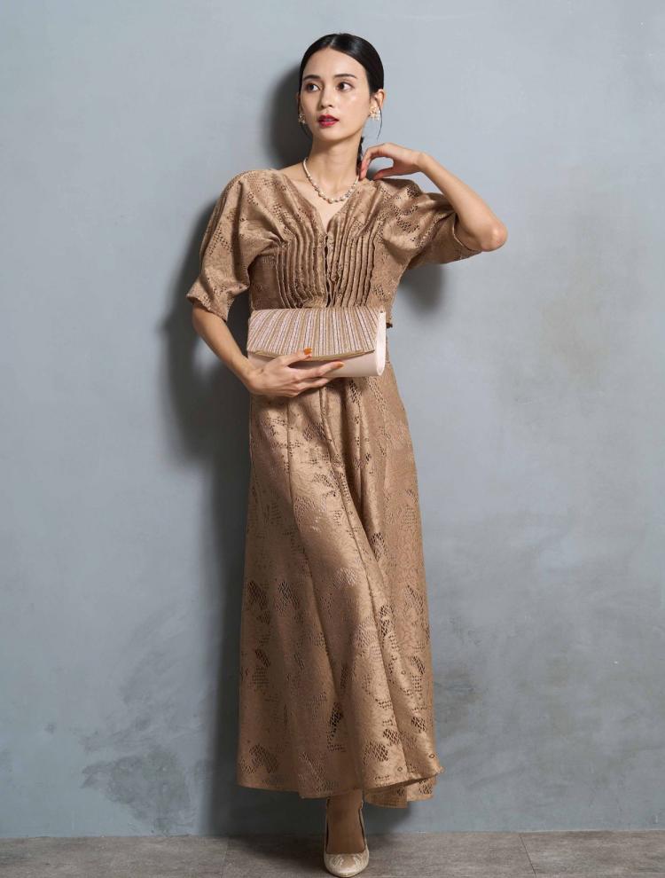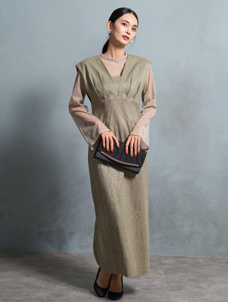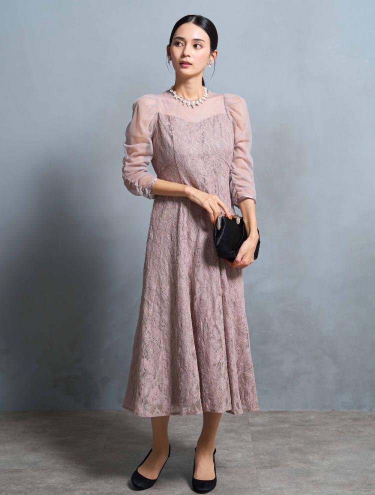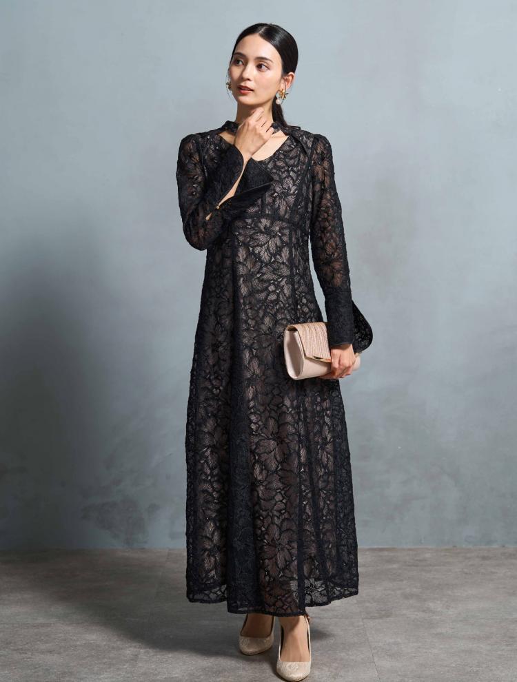 袖ありのデザインでロング丈のドレスは、露出が少なく上品に見えるので、30代には絶対おすすめ。首元が詰まったデザインは、クラシカルな印象に。デコルテやお袖に適度に透け感があると、華やかさが増して重たく見えません。