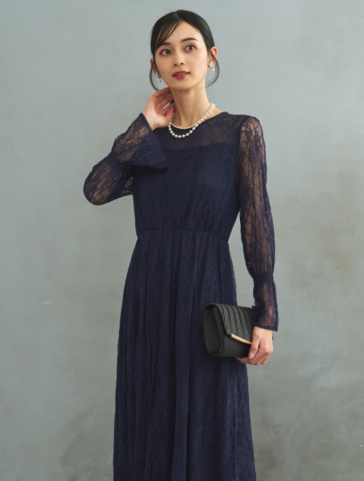派手に見えないのに暗くも見えないネイビードレスは、親族ドレスの定番カラー。透け感のあるレースやシアー素材でも下品に見えないので、ドレスのデザインも楽しみたい30代既婚者におすすめのカラーです。