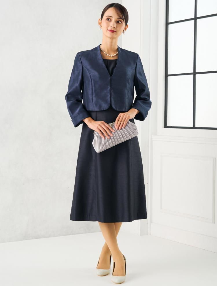 ネイビーのドレスにネイビーのシャンタンジャケットを合わせた、フォーマル度の高い単色ジャケットコーデをピックアップ!フォーマルな場面では、カラーの多用は避けた方が◎。ネイビー×ネイビーの単色コーデなら、格式のある会場や結婚式にもおすすめです。