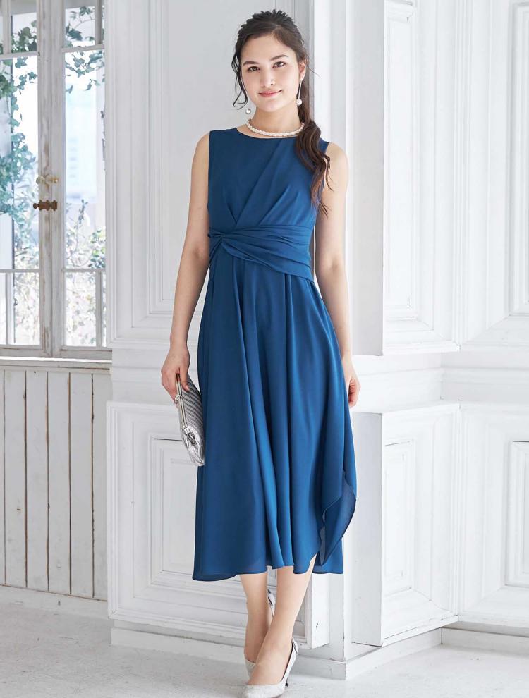 【M〜5L】ベルト付きプリーツミモレ丈ドレス(ネイビー)