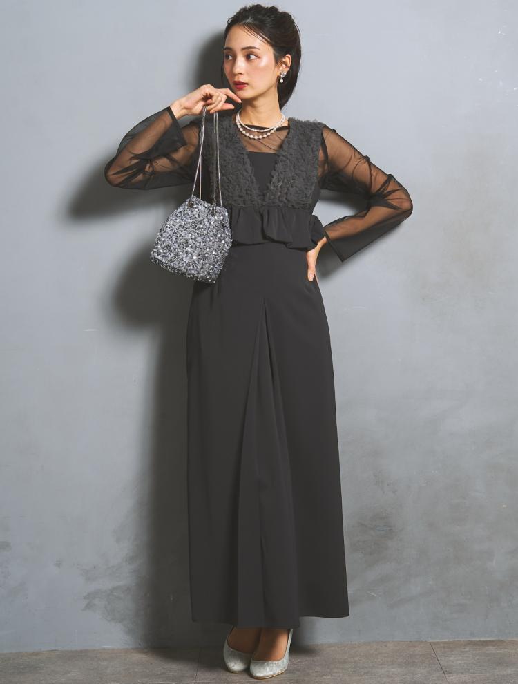 大学生に人気のシアー素材は、トレンドのレイヤードスタイルをドレスでも楽しめます。透け感が大人っぽい印象で謝恩会にもぴったりです。ベロアも大学生に人気!シックな素材の光沢感がワンランク上のドレスです。
