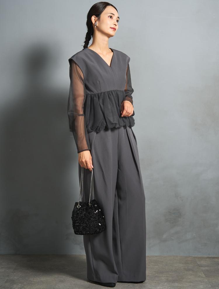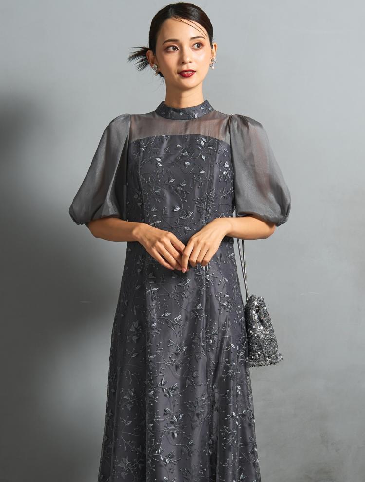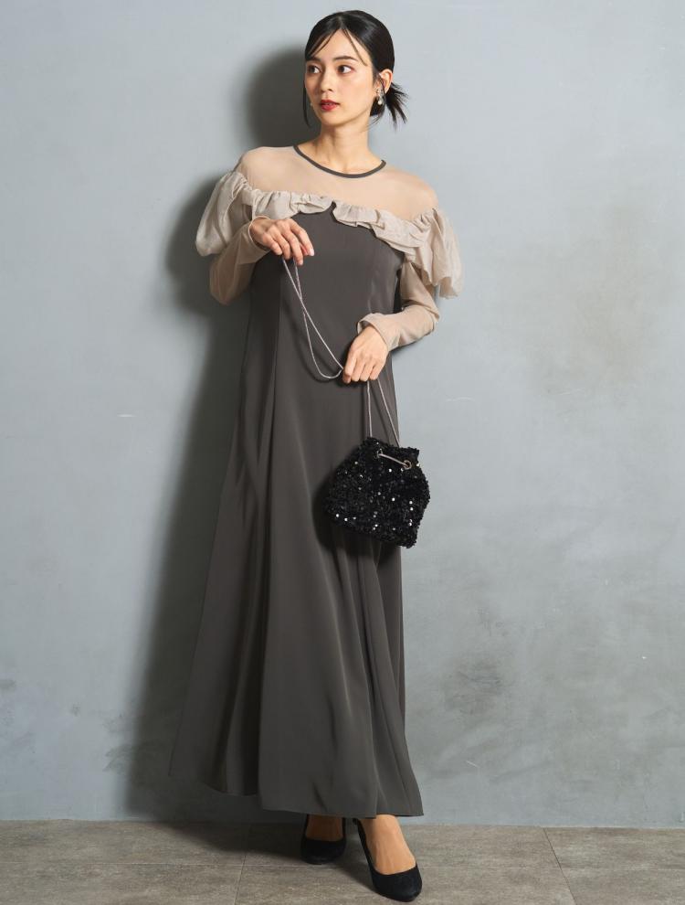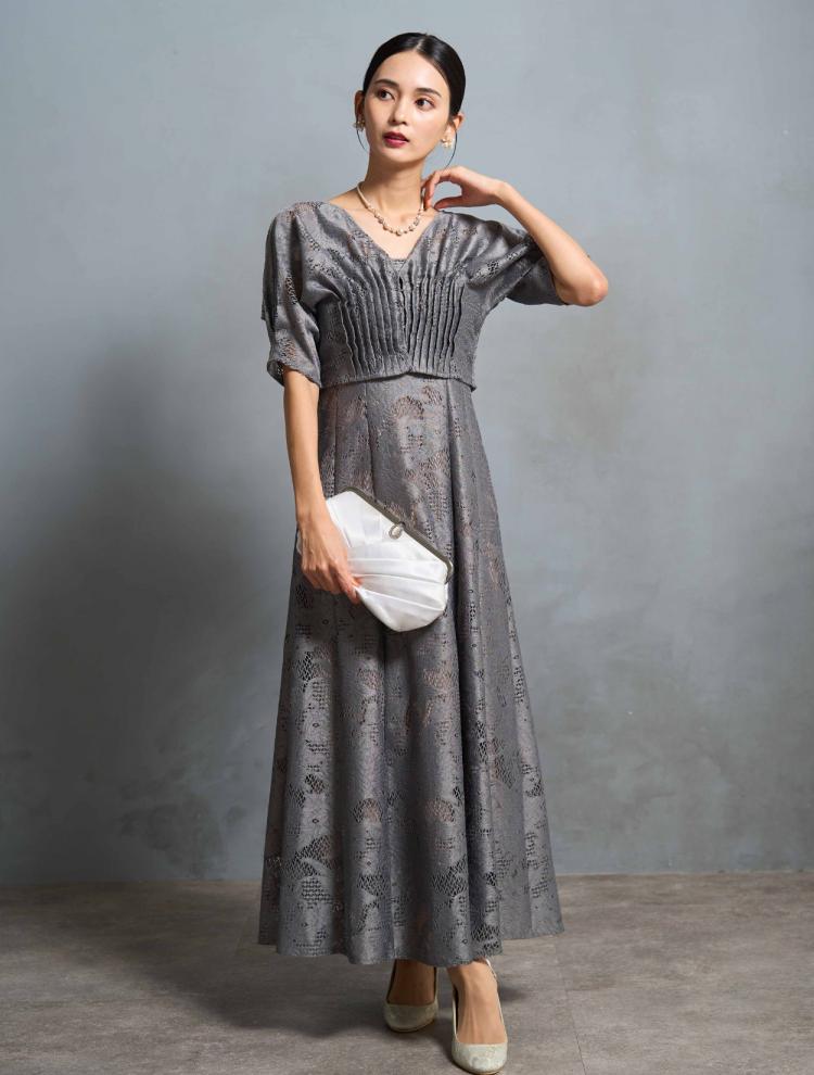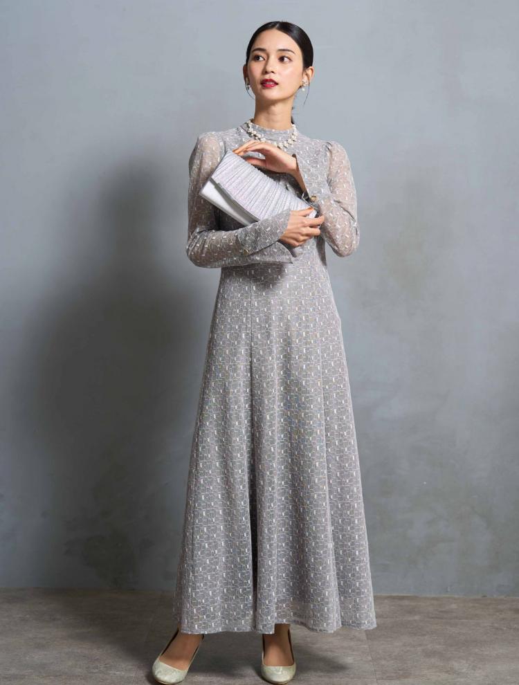 雪景色を思わせるような、シルバー系の装飾にぴったりのグレードレス。無機質グレーやライトグレー、大人っぽいチャコールグレーにシルバーのバッグやパンプスを合わせるコーデが人気。