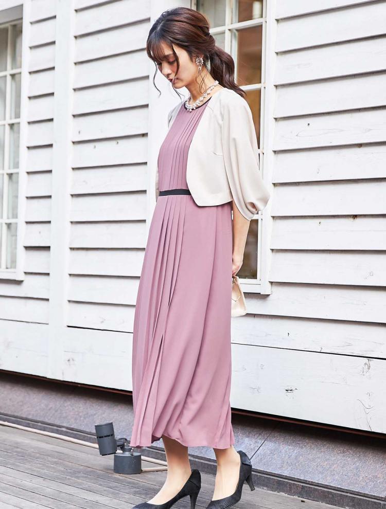 冬には暖色系のピンクドレスもおすすめ。くすみのあるダスティピンクやグレイッシュピンクなら、フェミニンになり過ぎず冬らしい重みのある着こなしが叶います。
