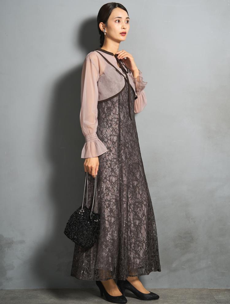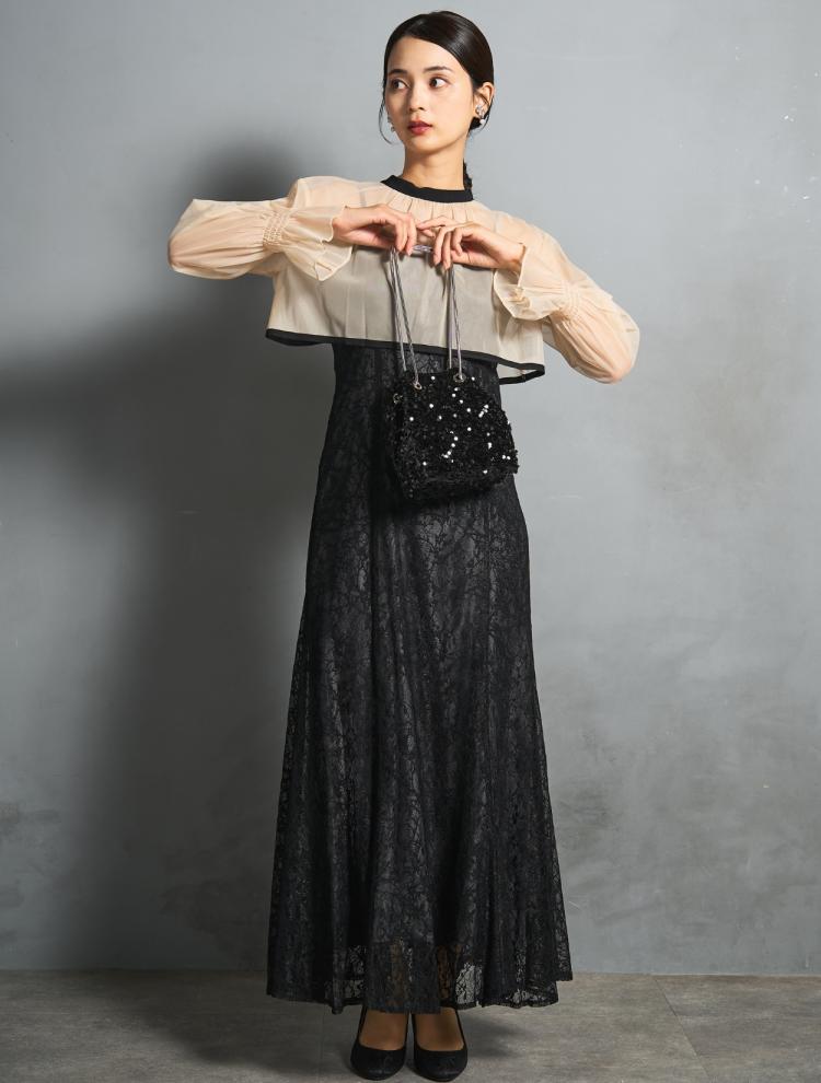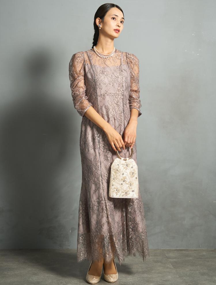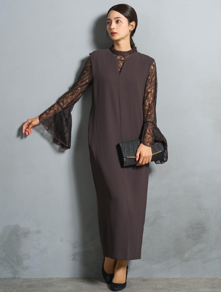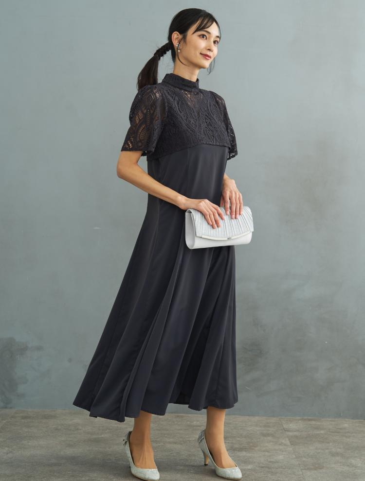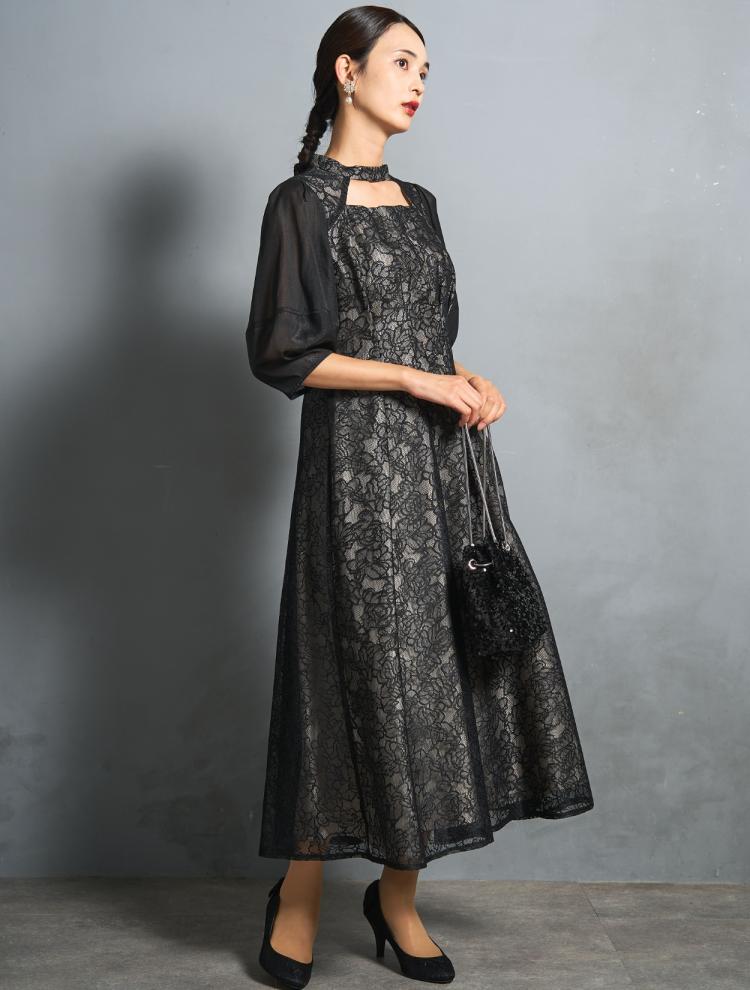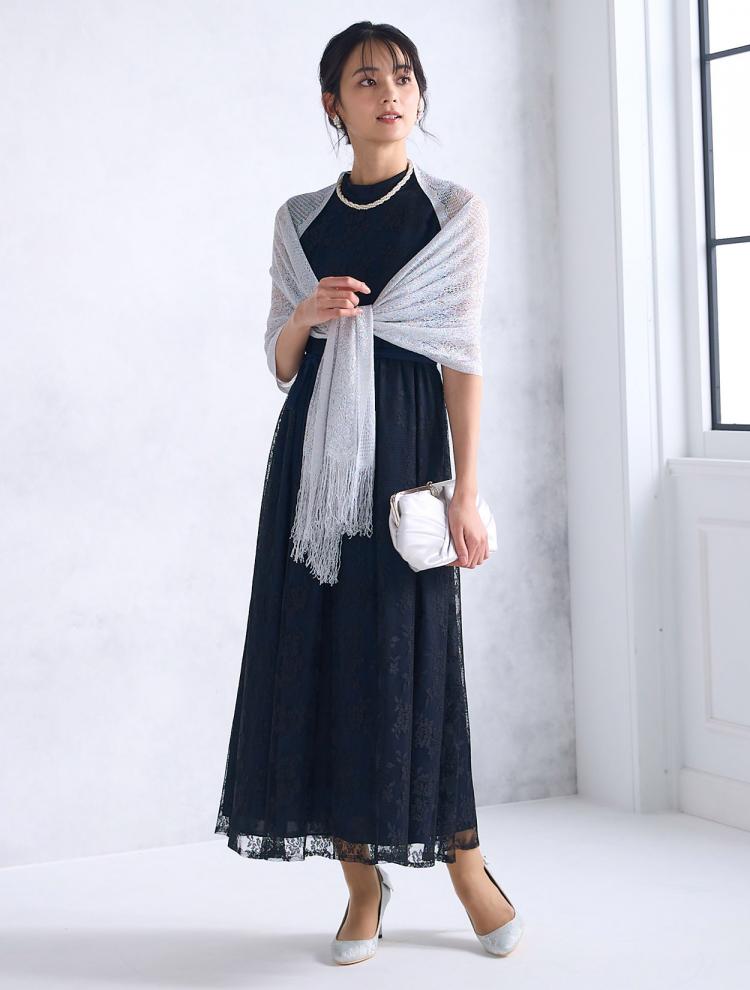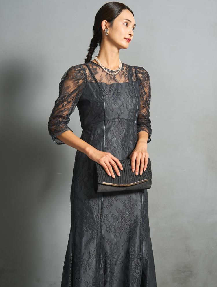ダークカラーになりがちな冬のドレスですが、レースを組み合わせると一気にクラシカルな冬の着こなしに。厚みのあるレースなら寒々しく見えないのもポイント。