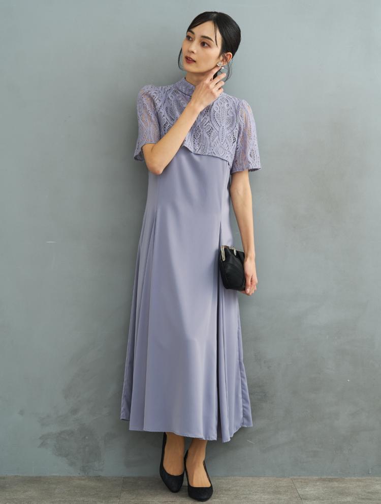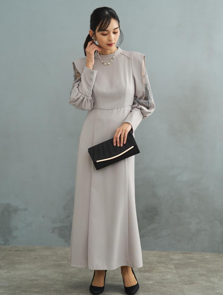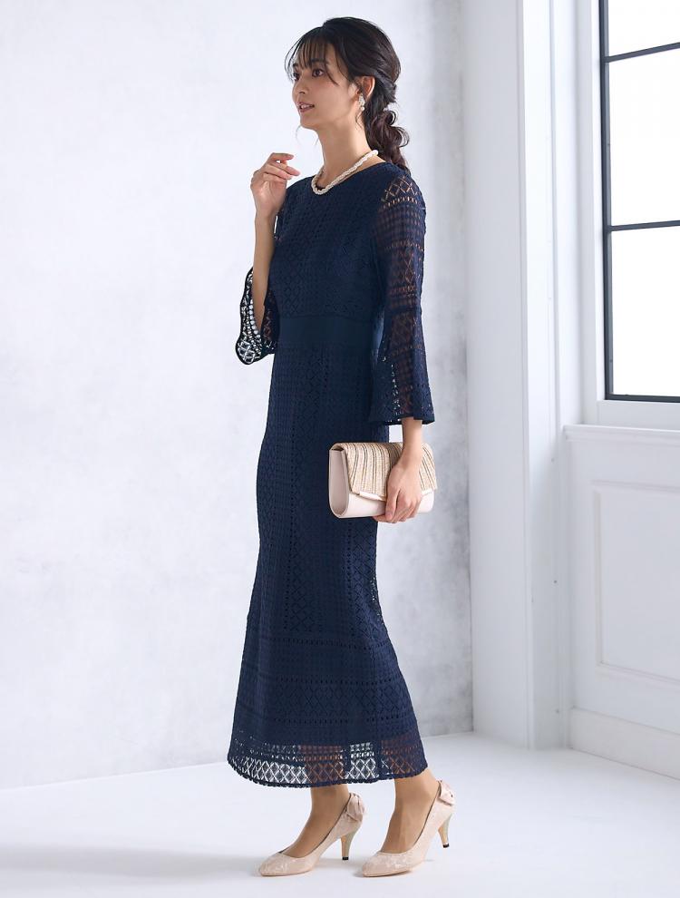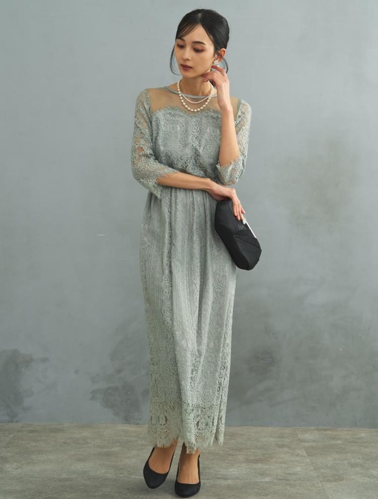 厚みのあるレースが使われた、控えめな透け感が上品なロングドレス。スカートはタイト過ぎず広がり過ぎず、体型もさりげなくカバー。