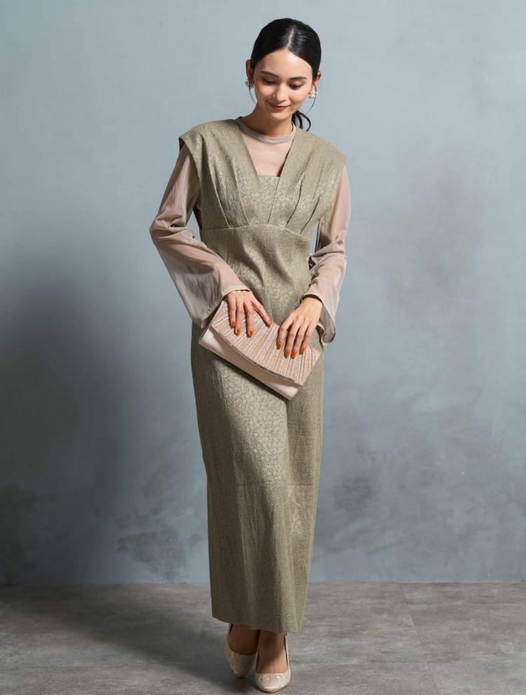 しっかりしたジャガード生地のロングドレス。セットになっている長袖のシアーブラウスの抜け感とのバランスが絶妙。落ち着きもありながらおしゃれも楽しめます。