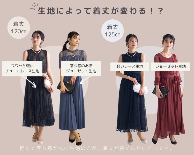 同じ着丈でも「軽さのあるチュールやレース」と「落ち感のあるジョーゼット」では、着た時の着丈の印象は結構違います。画像で確認してみましょう。