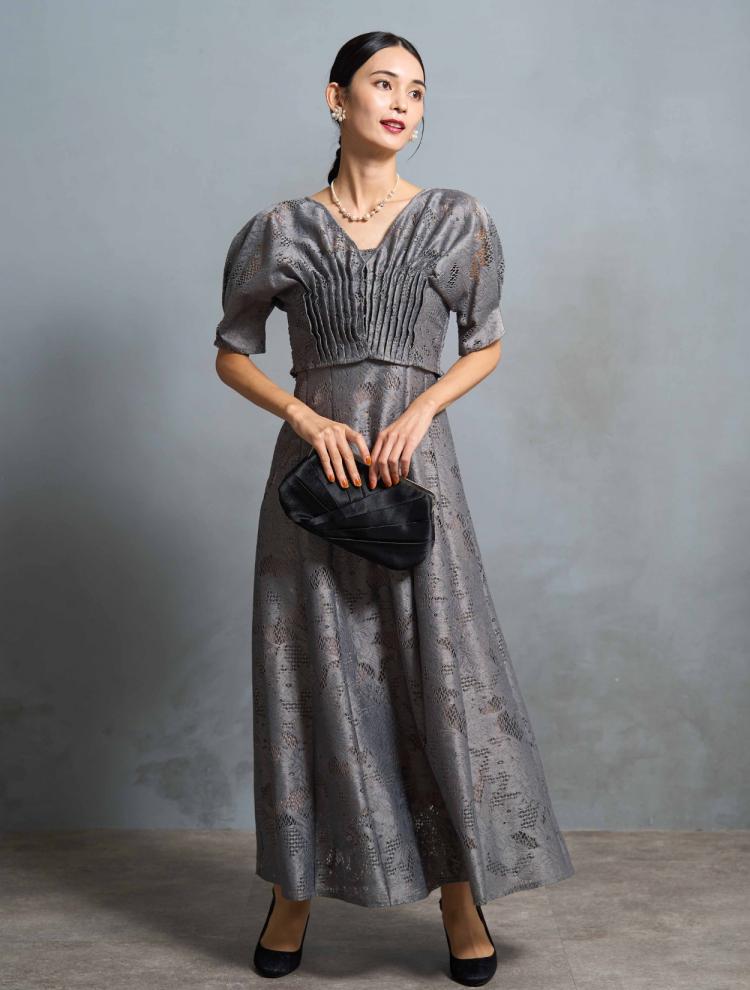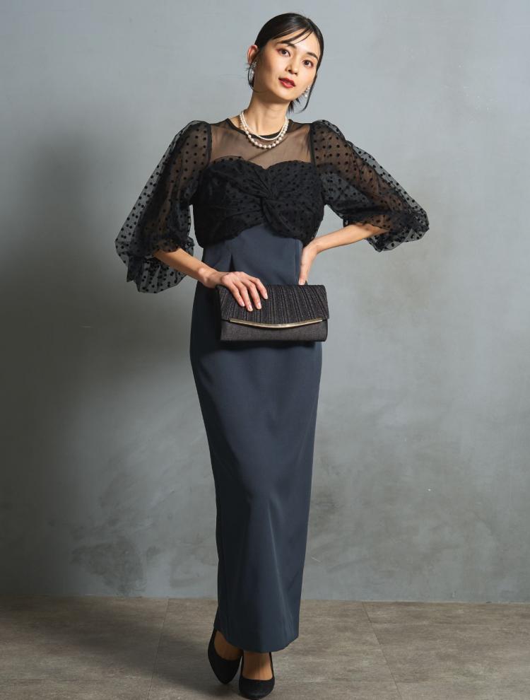 ただフォーマルドレスは、露出を抑えるために首元はつまり気味のデザインが多いです。そんな時は「デコルテに透け感のあるデザイン」を選ぶと◎。