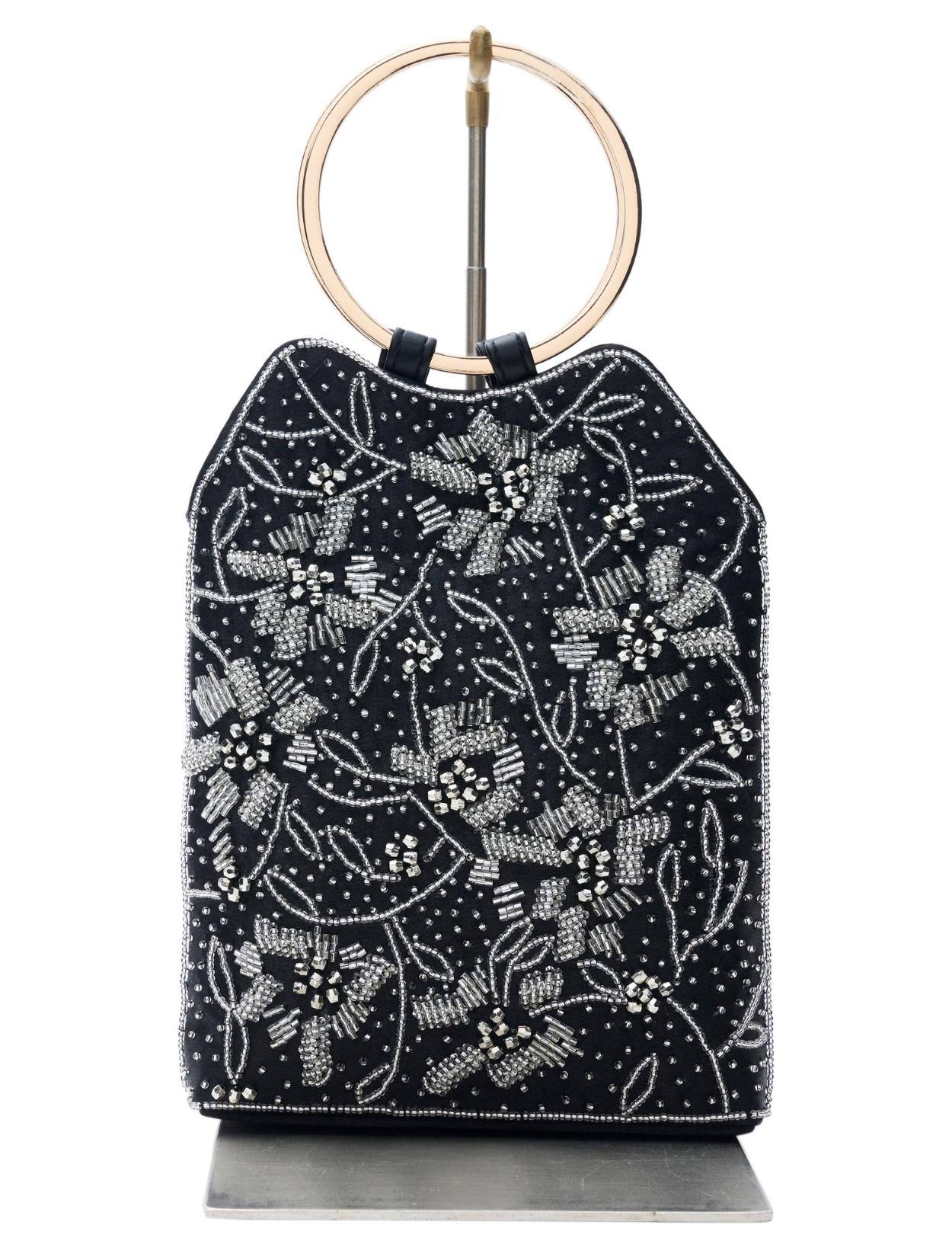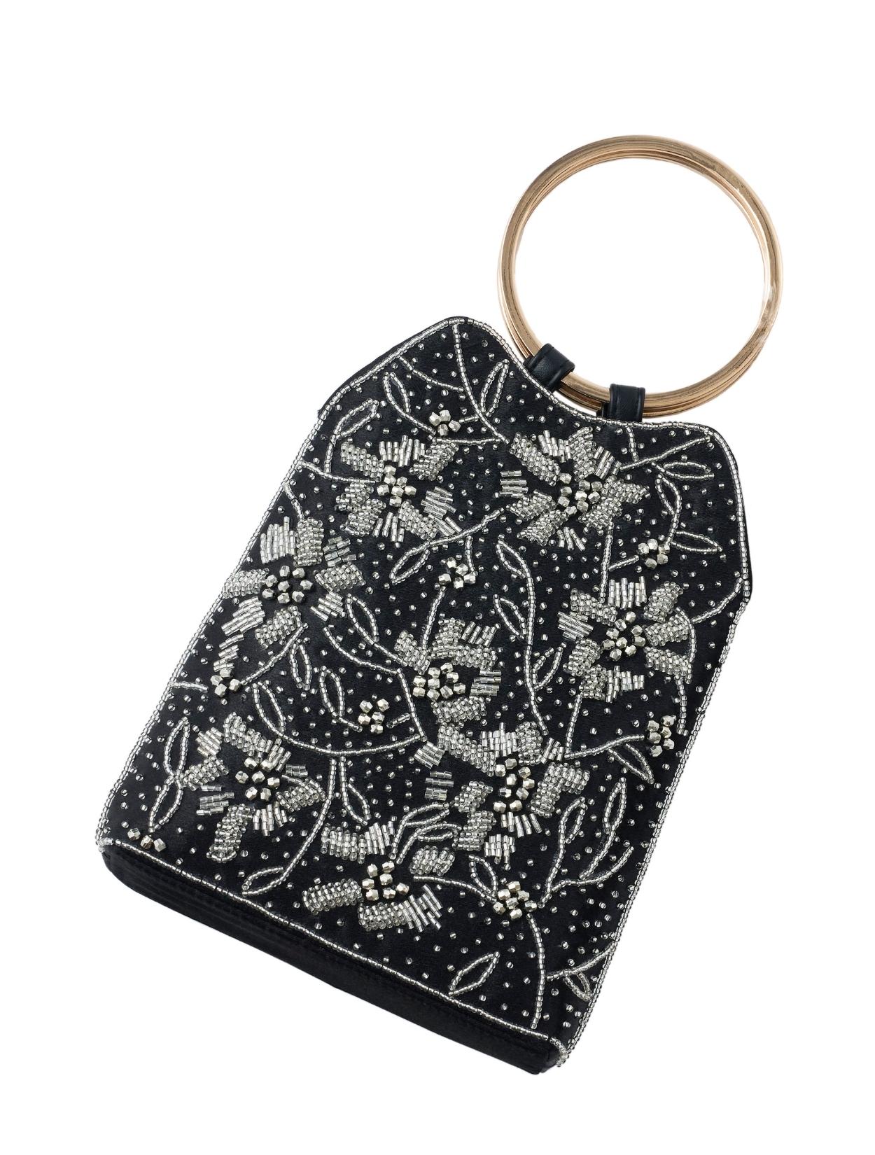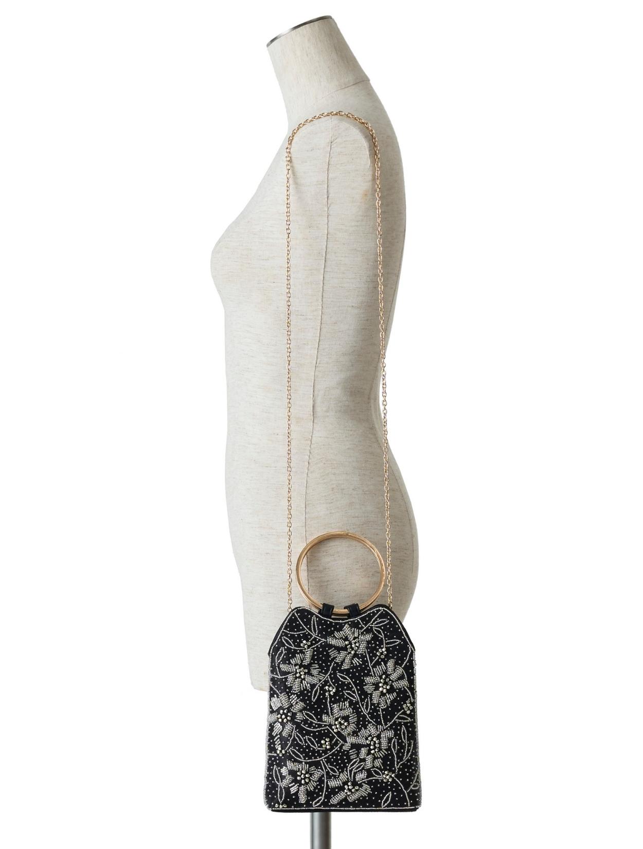 ビーズの刺繍が施された上品なパーティーバッグ。リングバッグのデザインは、従来のパーティーバッグよりもラフに持てるので20代30代に人気。刺繍はクラシカルな印象で高級感もあるので、40代50代の方にももちろんおすすめです。ショルダーストラップが付いているので、肩掛けにしてご利用も可能です。ブラックカラーですが、刺繍が華やかで地味見えしません。カラードレスのアクセントにも、ブラックドレスのシックな着こなしにもおすすめのアイテムです。