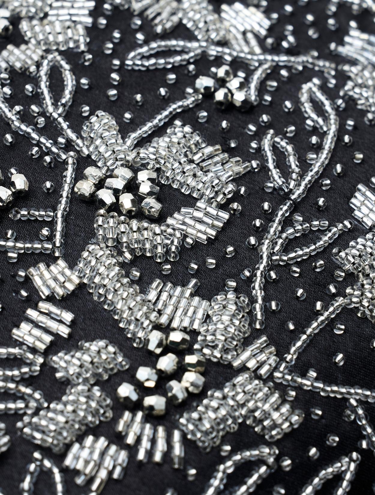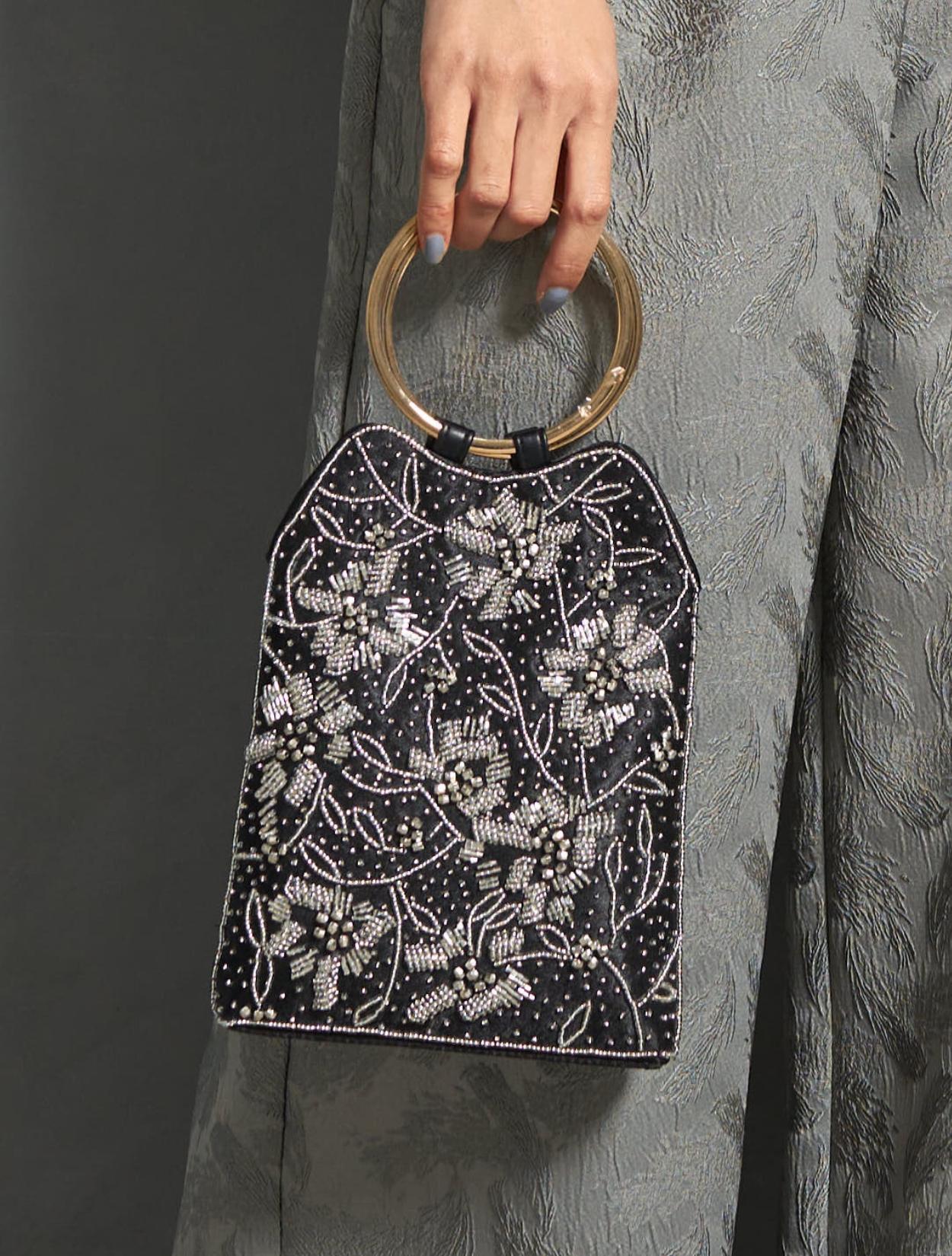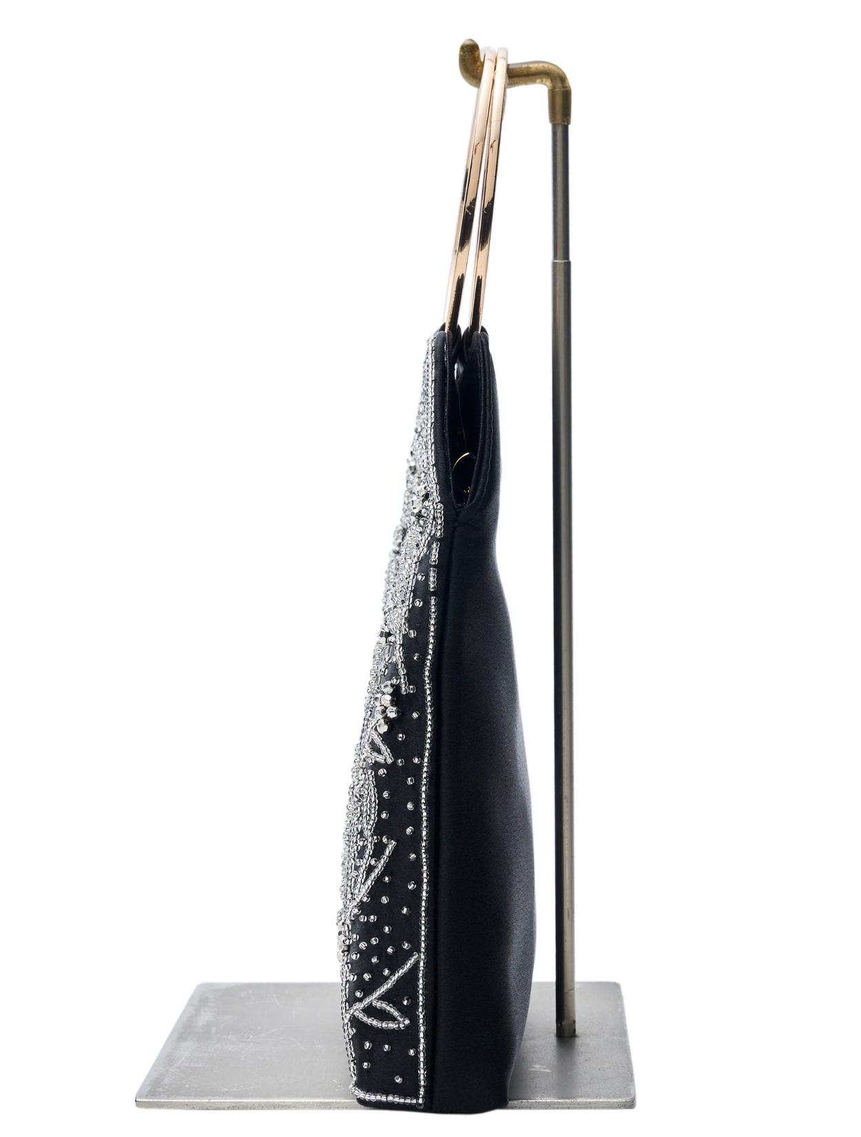 ビーズの刺繍が施された上品なパーティーバッグ。リングバッグのデザインは、従来のパーティーバッグよりもラフに持てるので20代30代に人気。刺繍はクラシカルな印象で高級感もあるので、40代50代の方にももちろんおすすめです。ショルダーストラップが付いているので、肩掛けにしてご利用も可能です。ブラックカラーですが、刺繍が華やかで地味見えしません。カラードレスのアクセントにも、ブラックドレスのシックな着こなしにもおすすめのアイテムです。