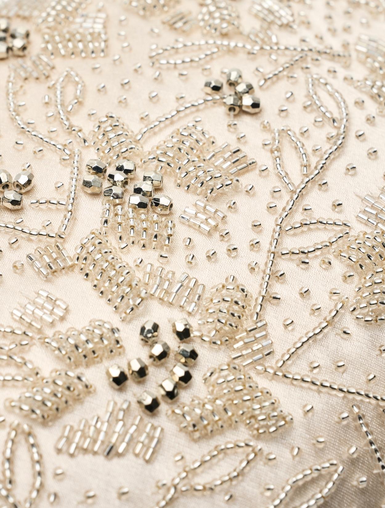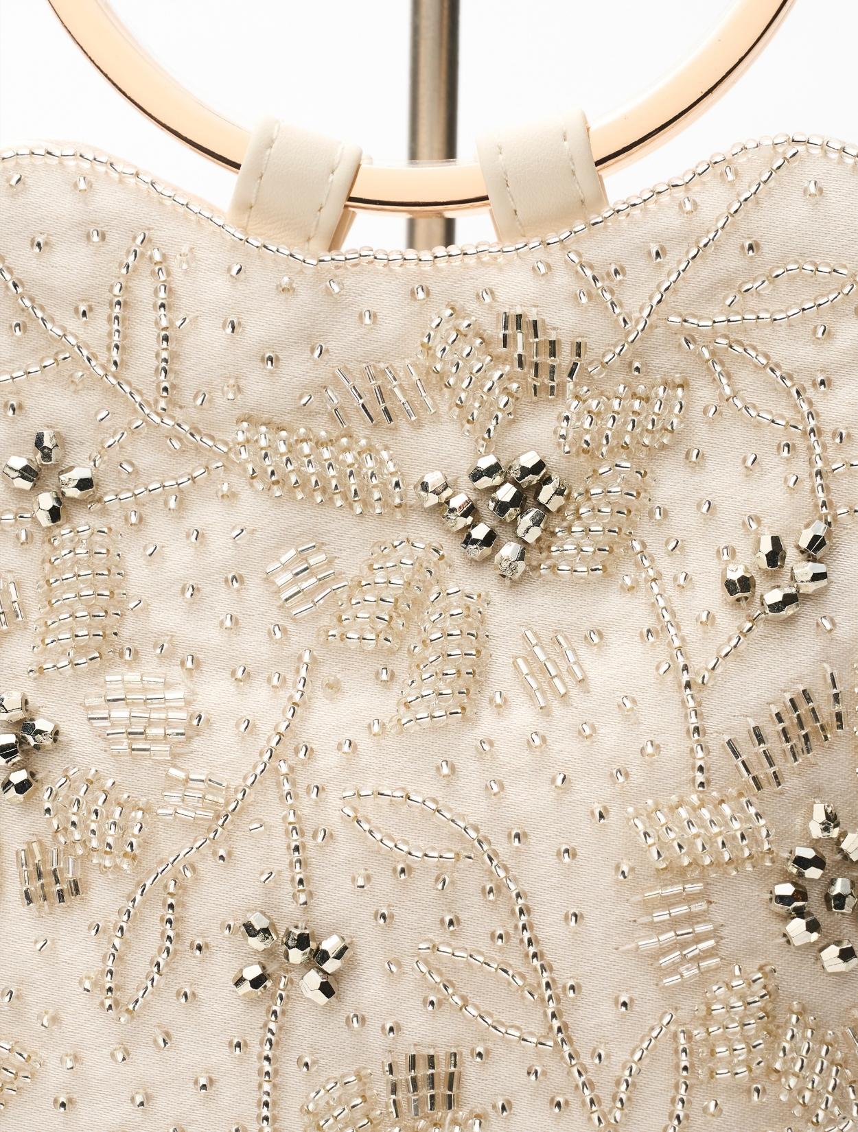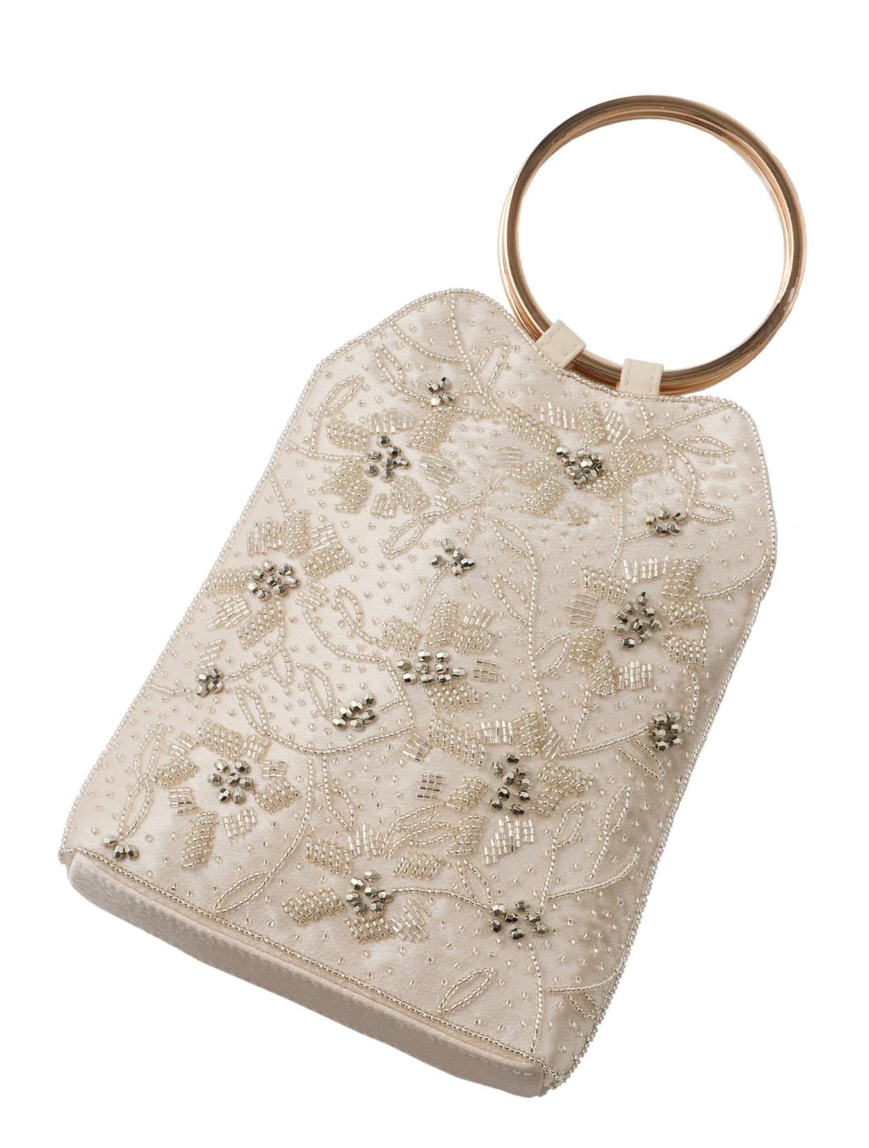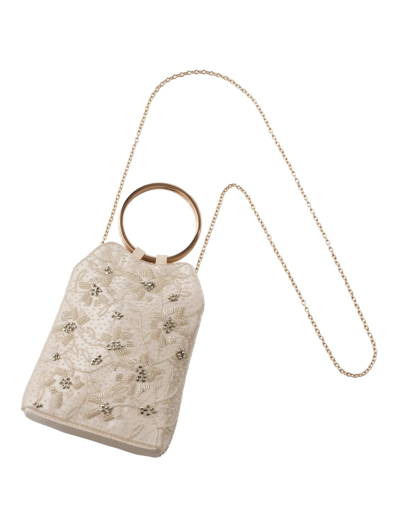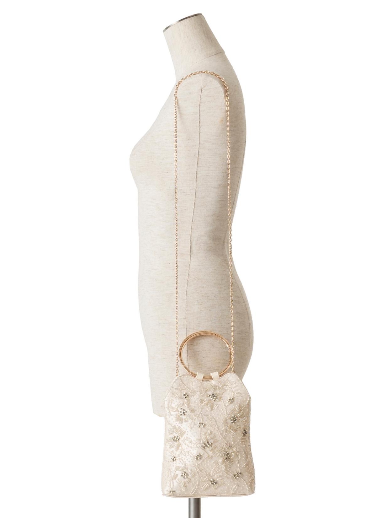 ビーズの刺繍が施された上品なパーティーバッグ。リングバッグのデザインは、従来のパーティーバッグよりもラフに持てるので20代30代に人気。刺繍はクラシカルな印象で高級感もあるので、40代50代の方にももちろんおすすめです。ショルダーストラップが付いているので、肩掛けにしてご利用も可能です。優しいベージュカラーは、上品で女性らしいコーディネートにおすすめのカラーです。