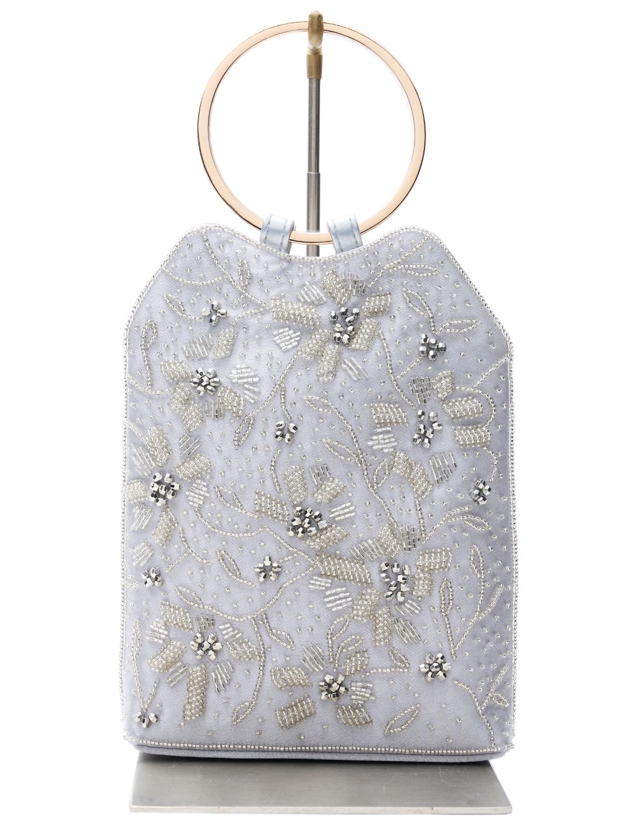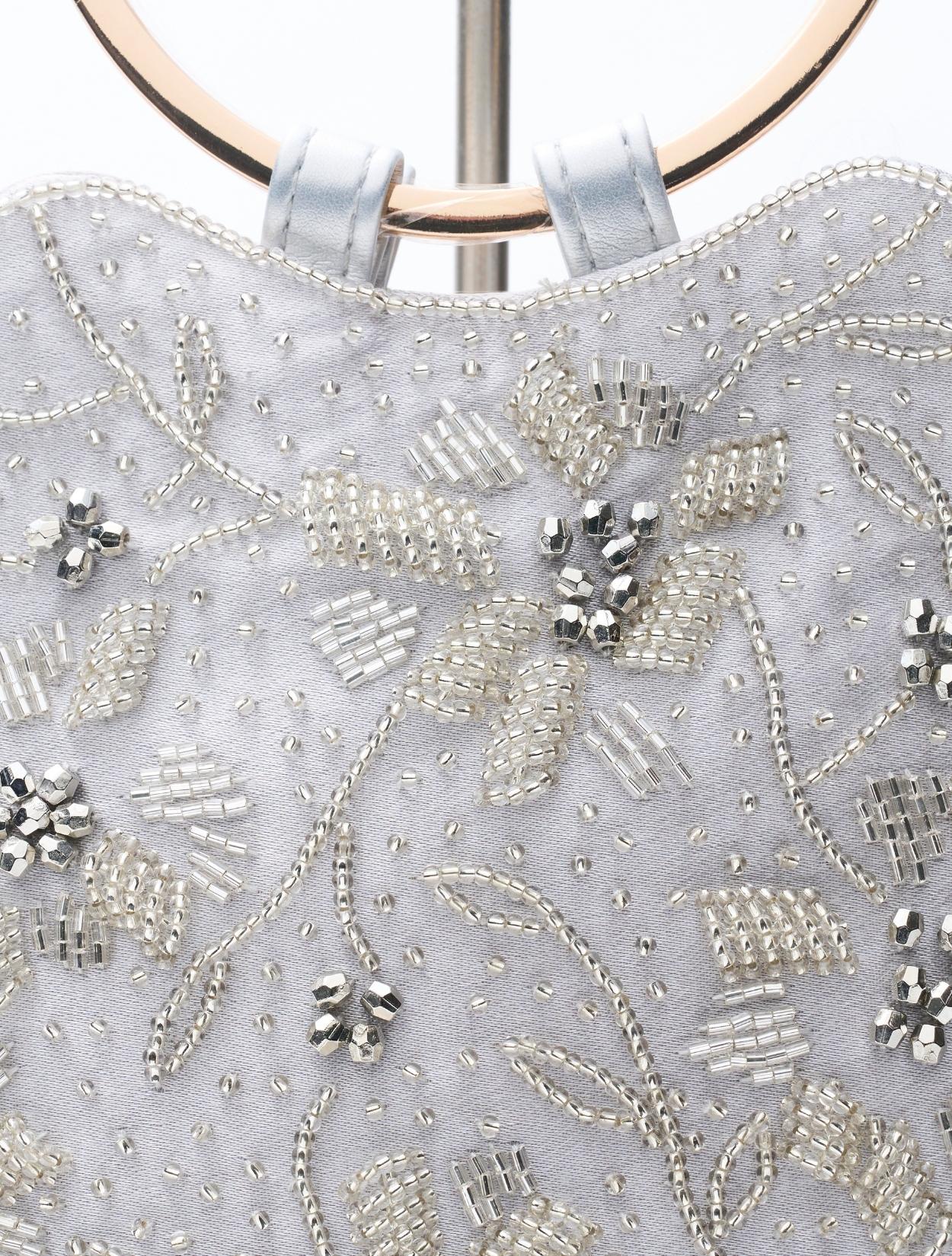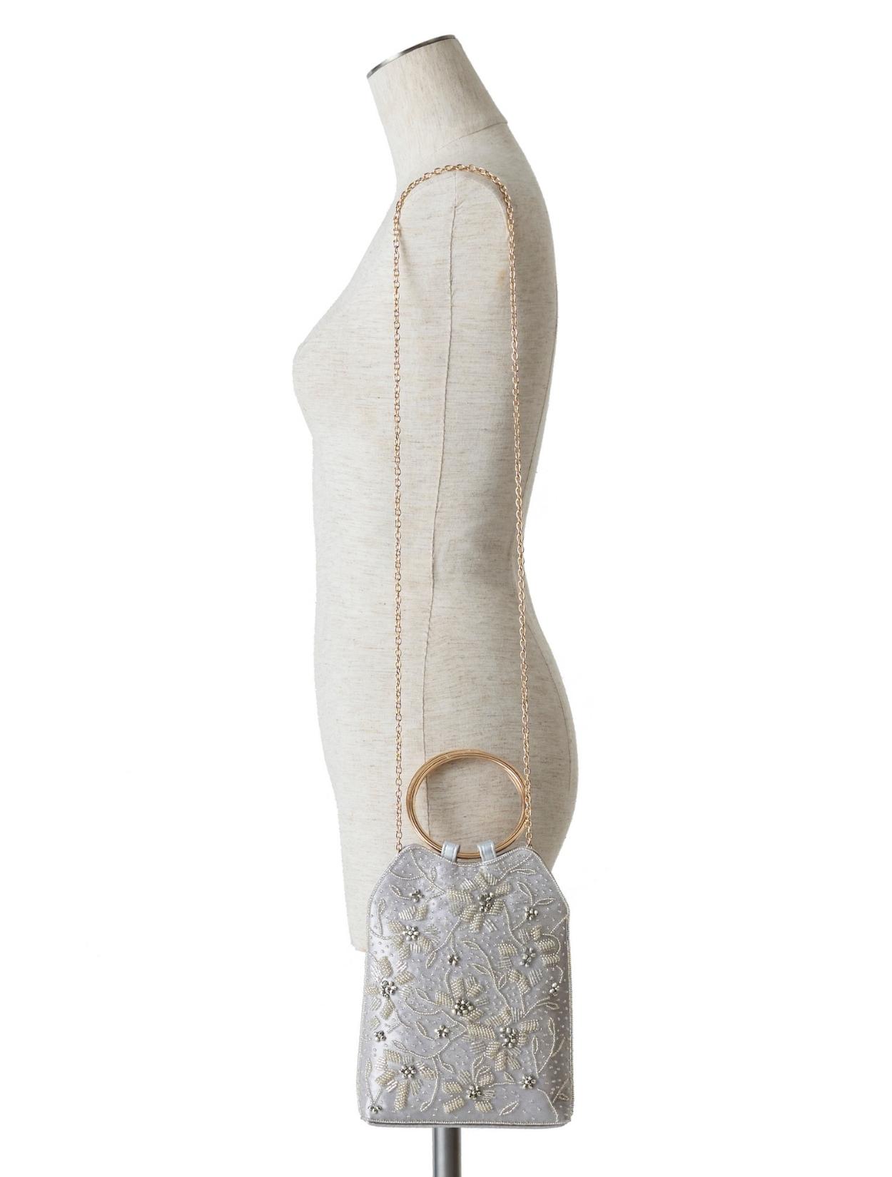 ビーズの刺繍が施された上品なパーティーバッグ。リングバッグのデザインは、従来のパーティーバッグよりもラフに持てるので20代30代に人気。刺繍はクラシカルな印象で高級感もあるので、40代50代の方にももちろんおすすめです。ショルダーストラップが付いているので、肩掛けにしてご利用も可能です。シルバー生地の光沢とビーズ刺繍の輝きは、すっきりとした清涼感のある印象に。お呼ばれからご親族コーデまで幅広くご利用可能です。
