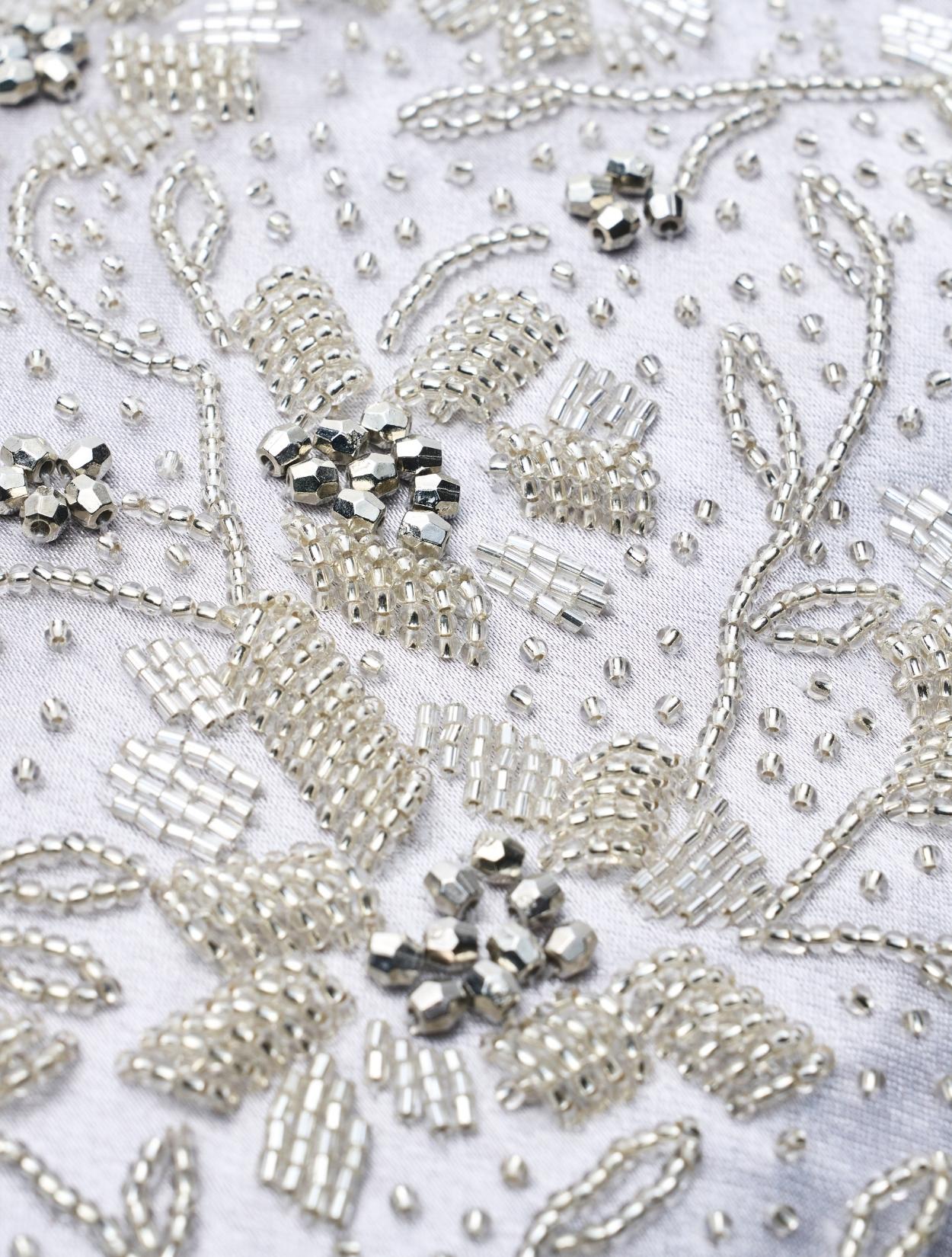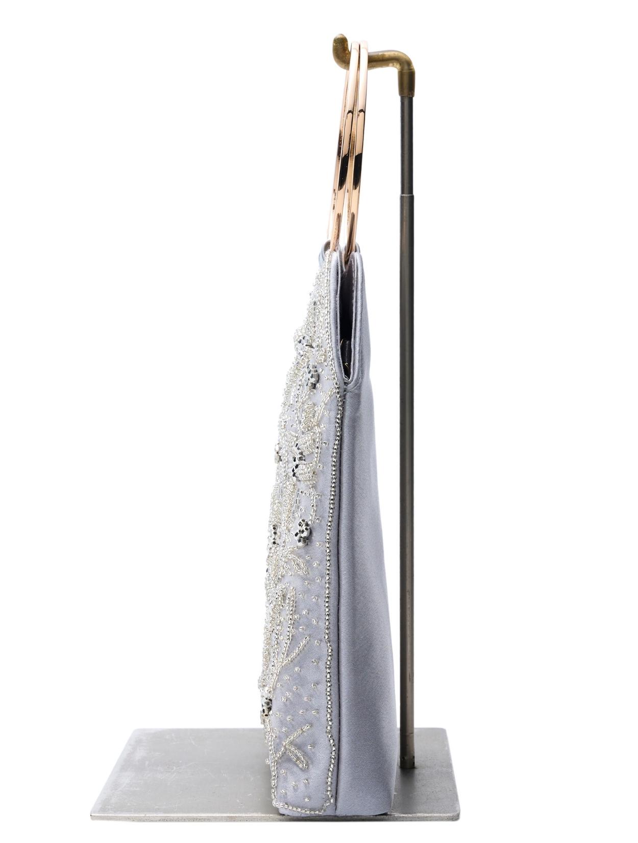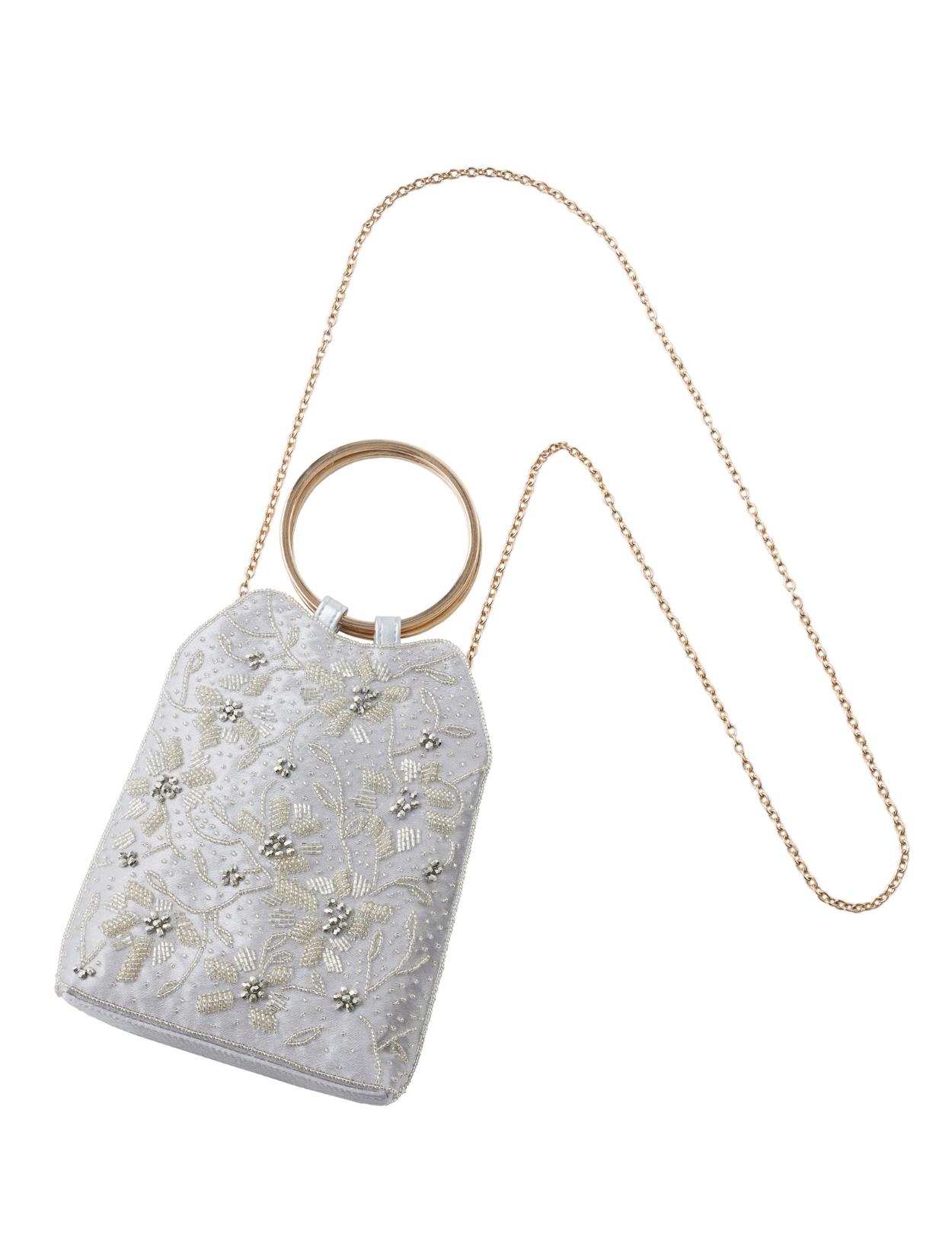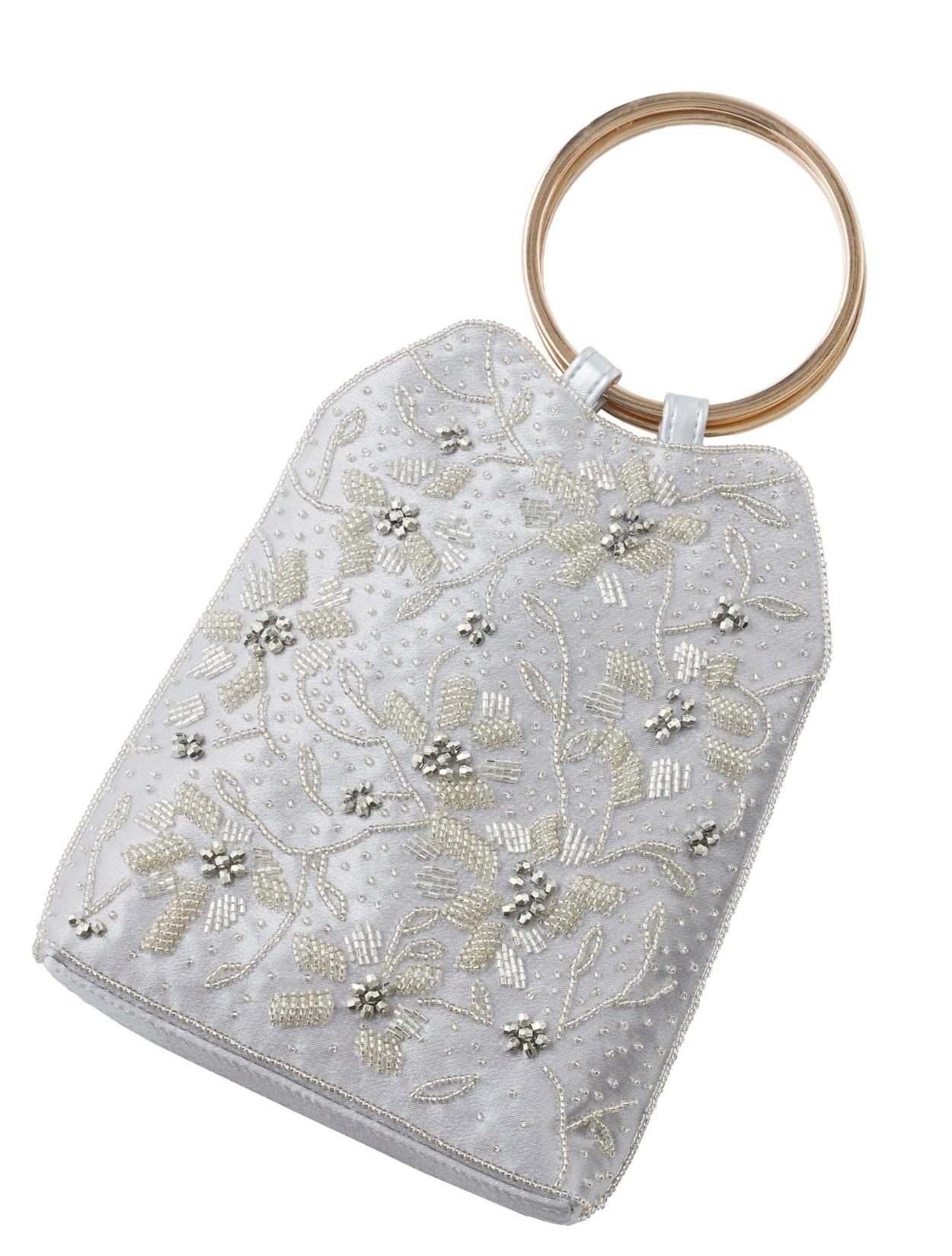 ビーズの刺繍が施された上品なパーティーバッグ。リングバッグのデザインは、従来のパーティーバッグよりもラフに持てるので20代30代に人気。刺繍はクラシカルな印象で高級感もあるので、40代50代の方にももちろんおすすめです。ショルダーストラップが付いているので、肩掛けにしてご利用も可能です。シルバー生地の光沢とビーズ刺繍の輝きは、すっきりとした清涼感のある印象に。お呼ばれからご親族コーデまで幅広くご利用可能です。
