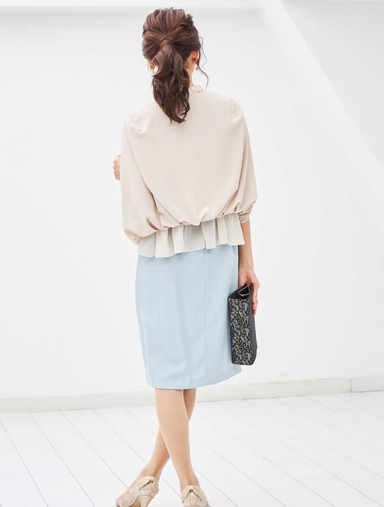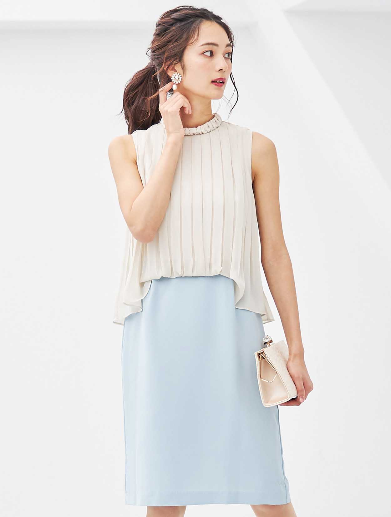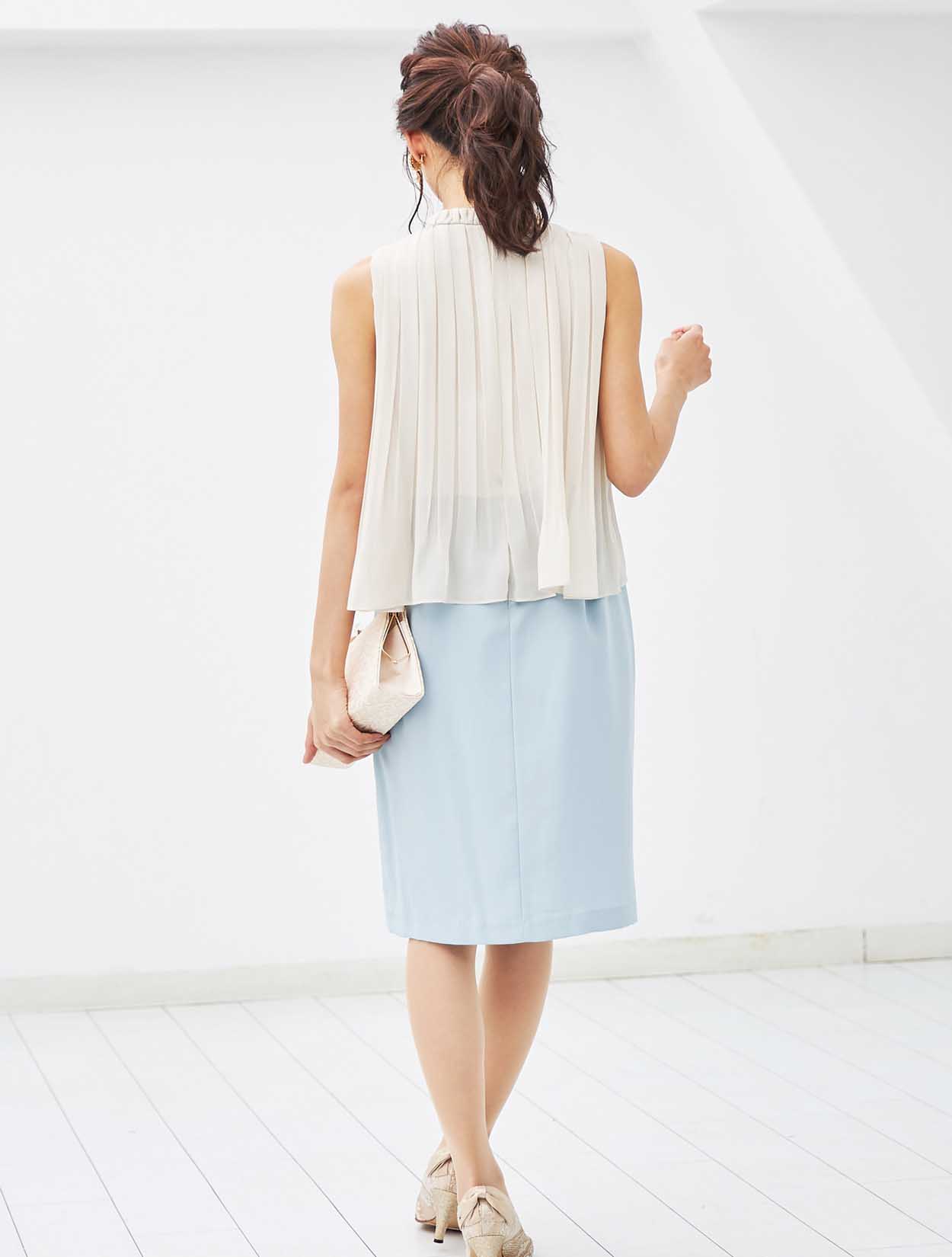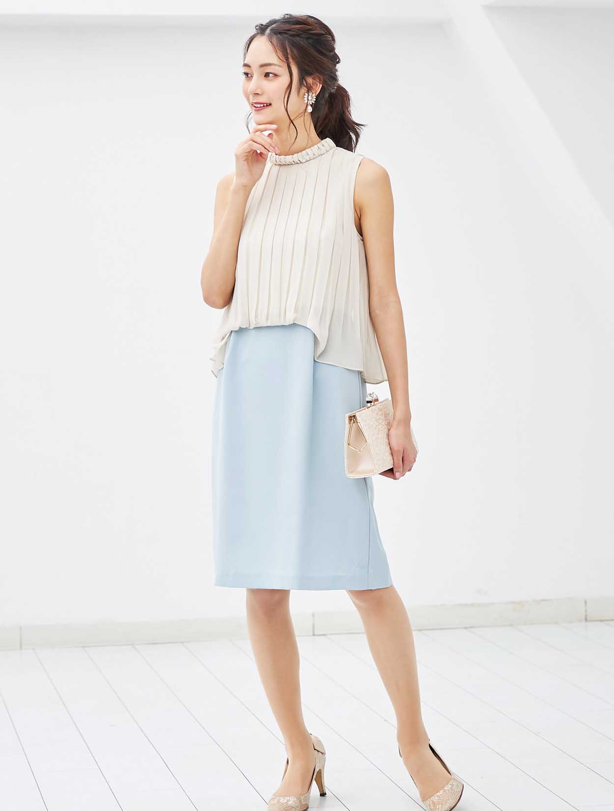 まるでレイヤードしたかの様なドレスは、プリーツを効かせたブラウス風のトップスでさりげなくウエスト周りをカバー。スタンドネックで胸元の開きもなく安心です。