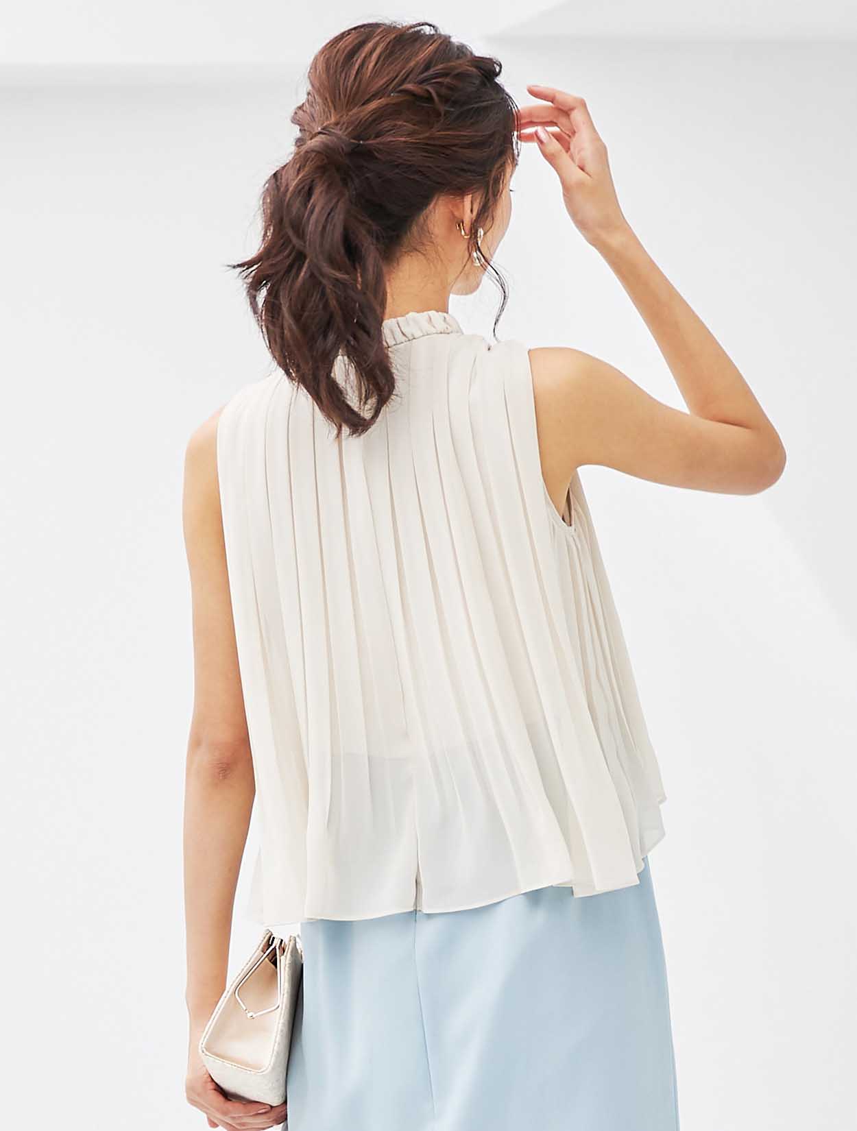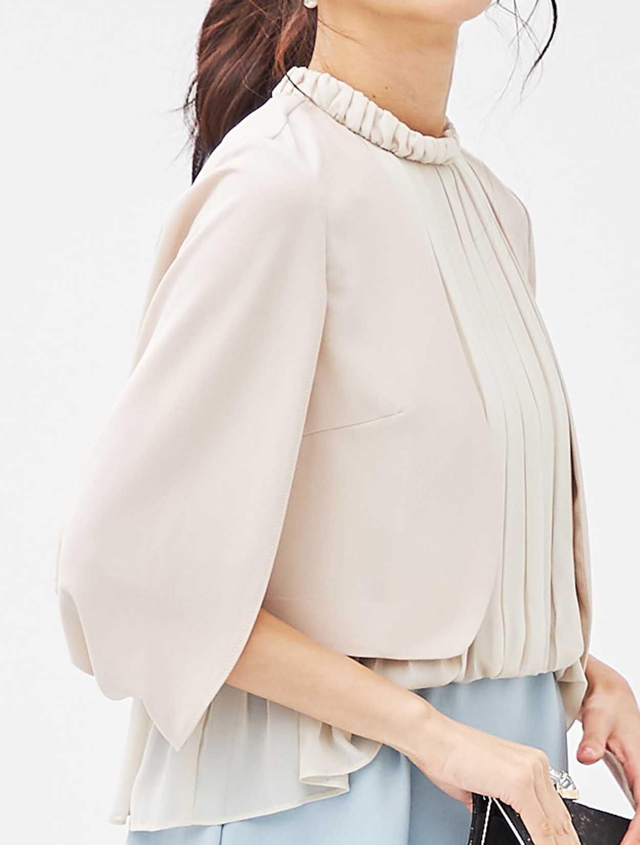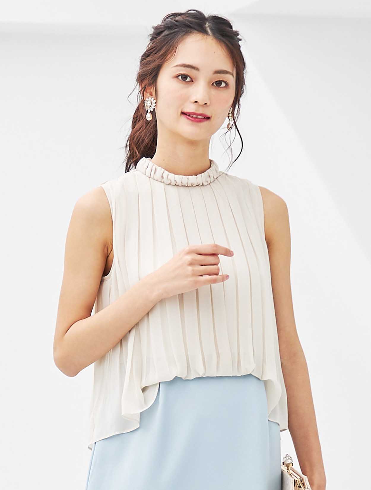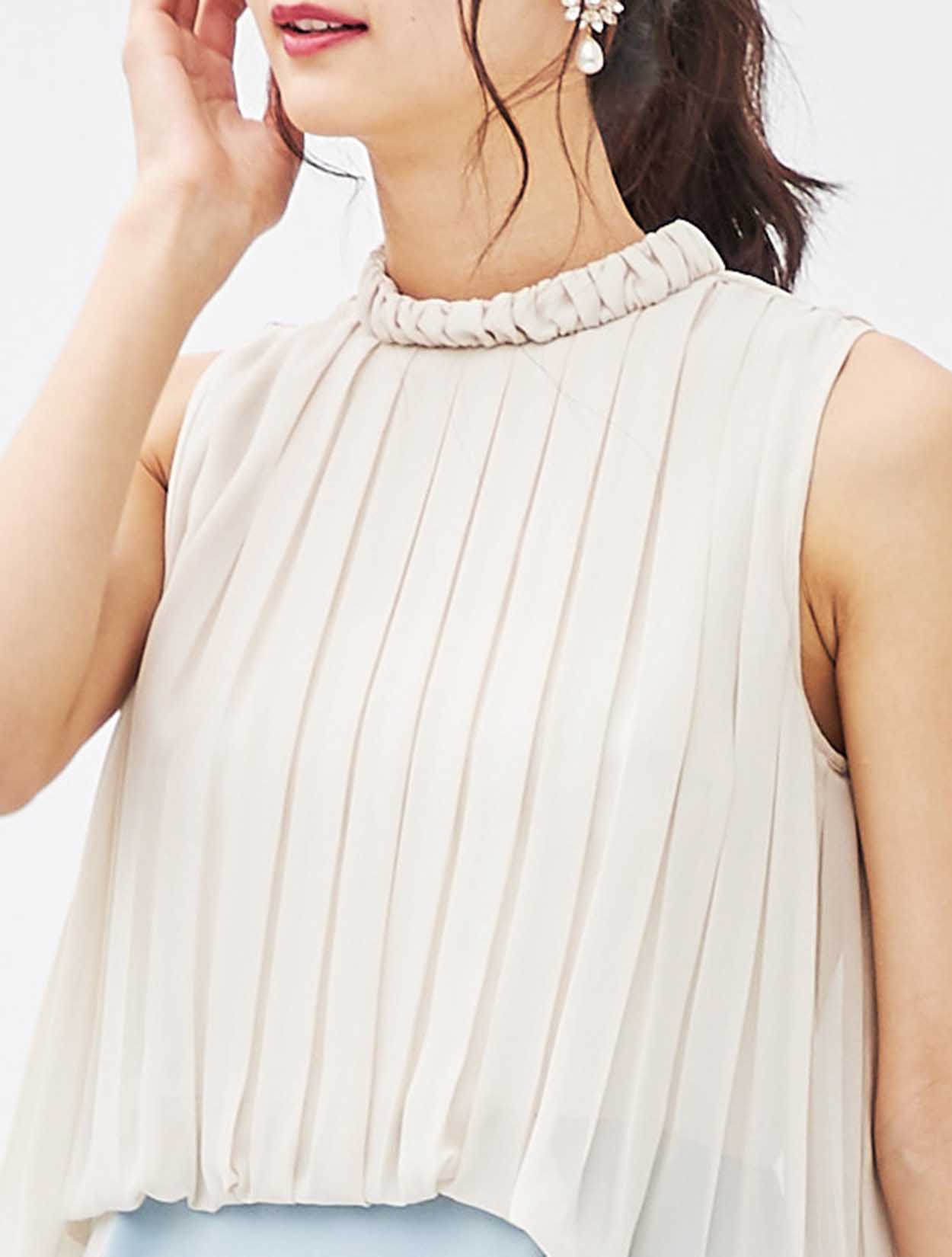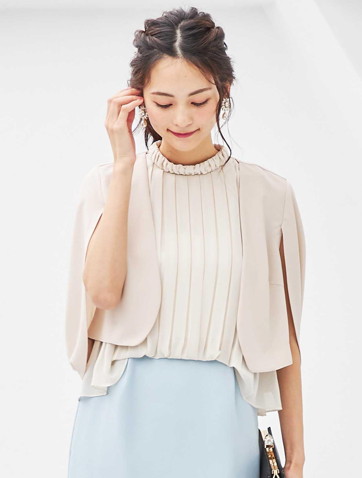 控えめな露出でエレガントなスタンドネックプリーツドレス