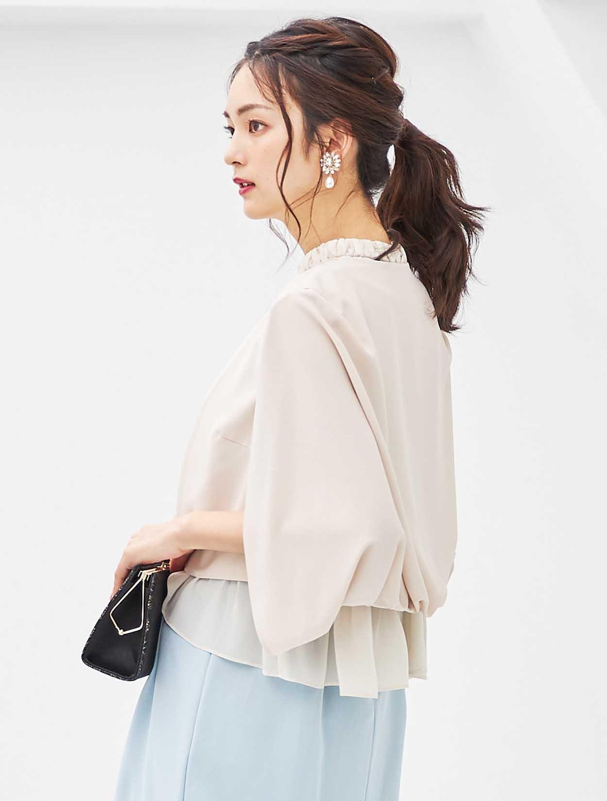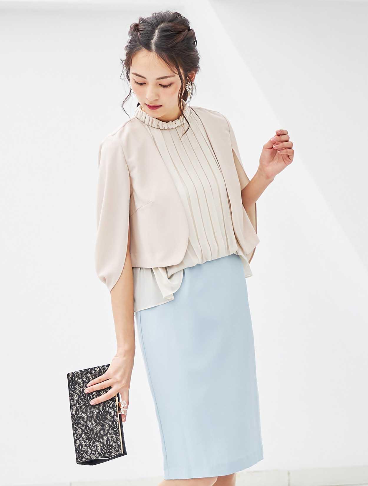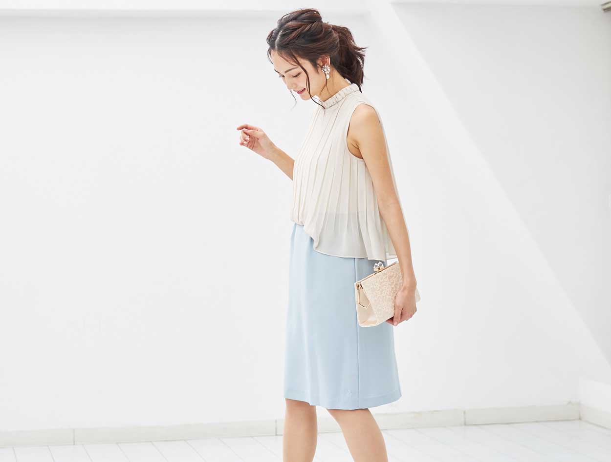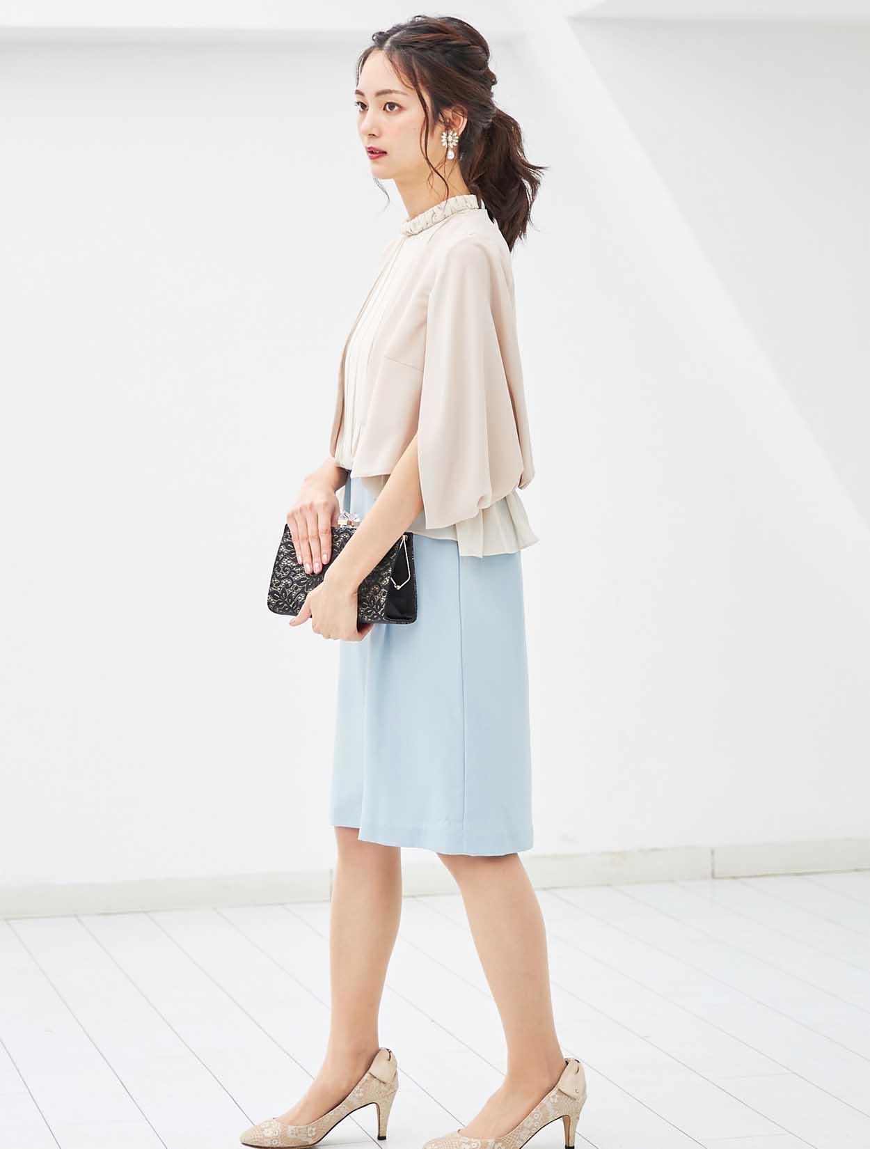 ベージュとサックスの爽やかなカラーバランス。20代~30代の方に人気です。トップスはオフホワイトの様にも見えるので、二次会やパーティー、お食事会におすすめ。