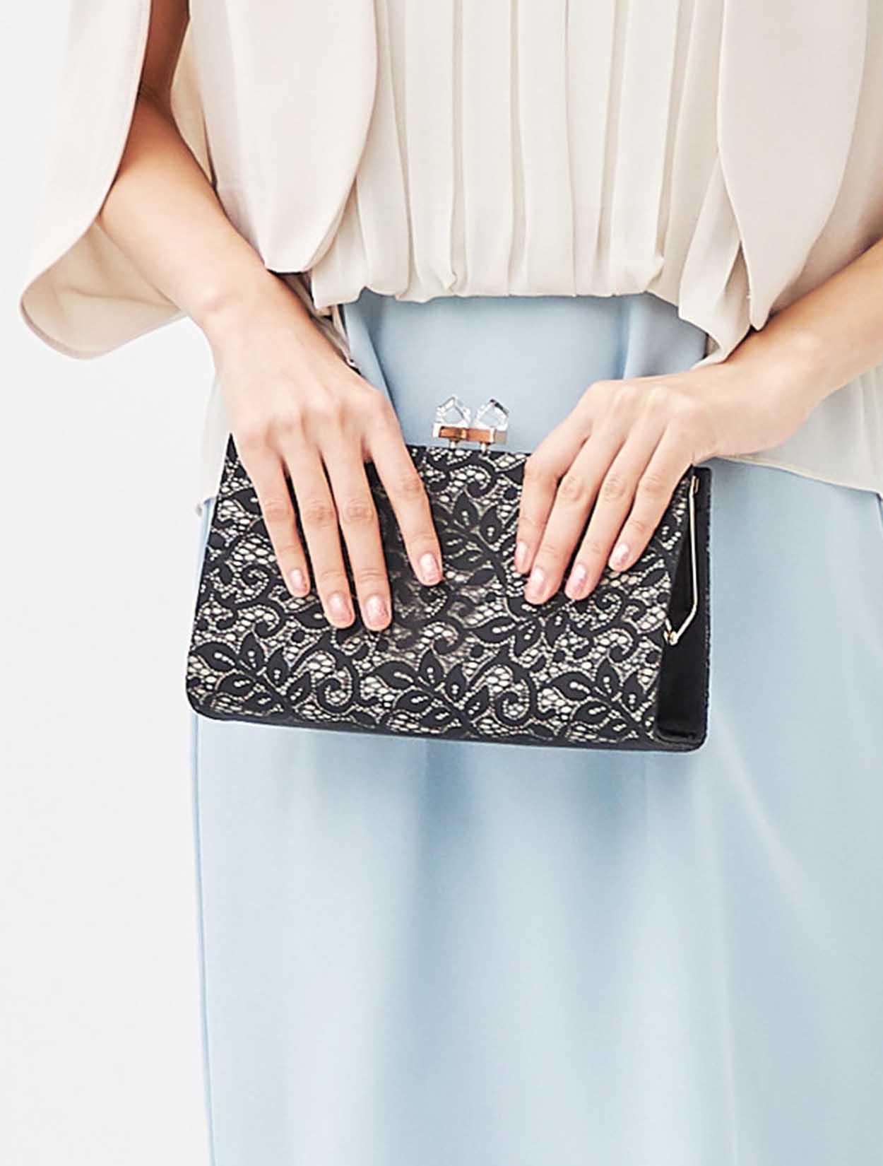 ブラックのレースバッグが上品なアクセントになって、柔らかいカラーの中にもメリハリあるスタイルを実現。