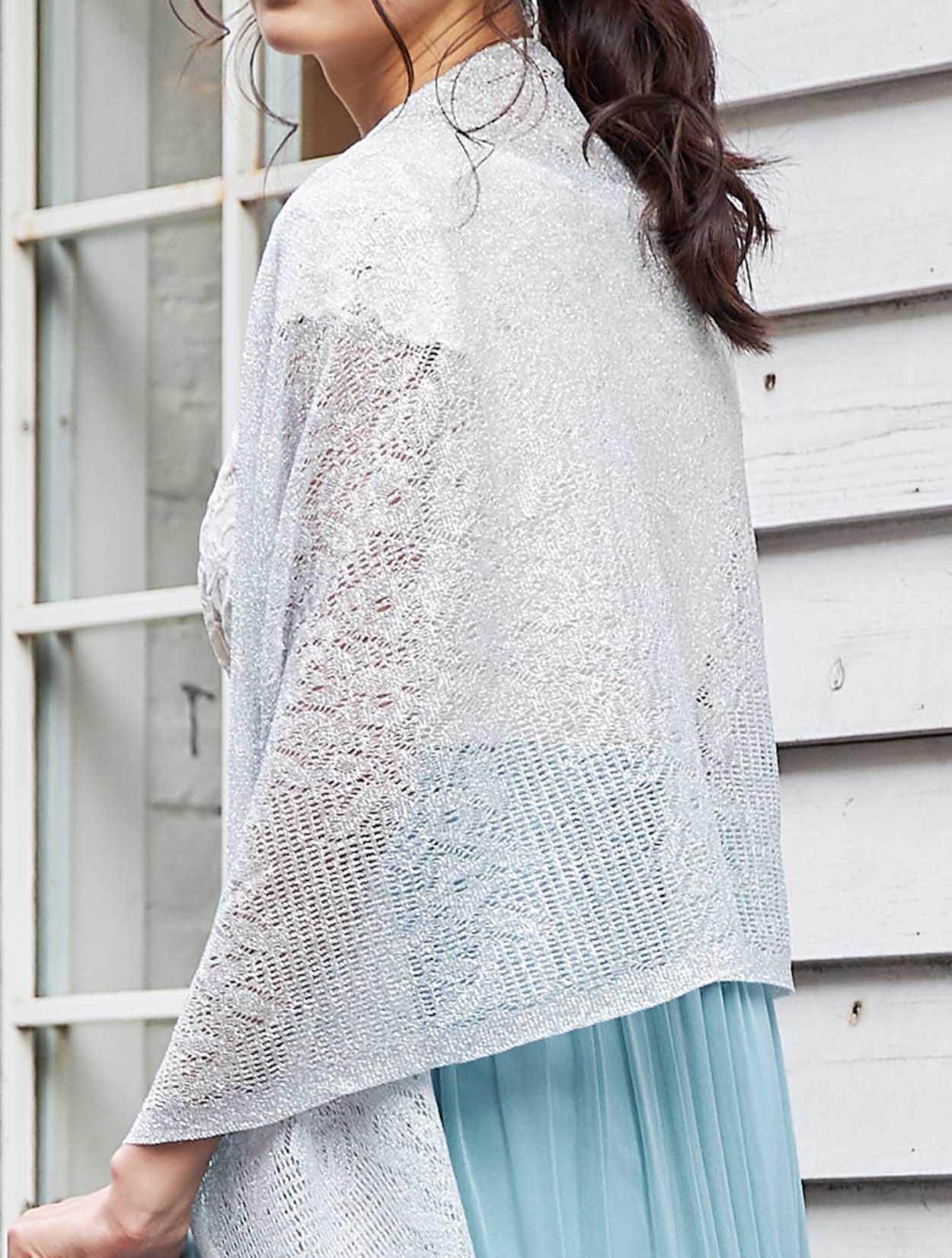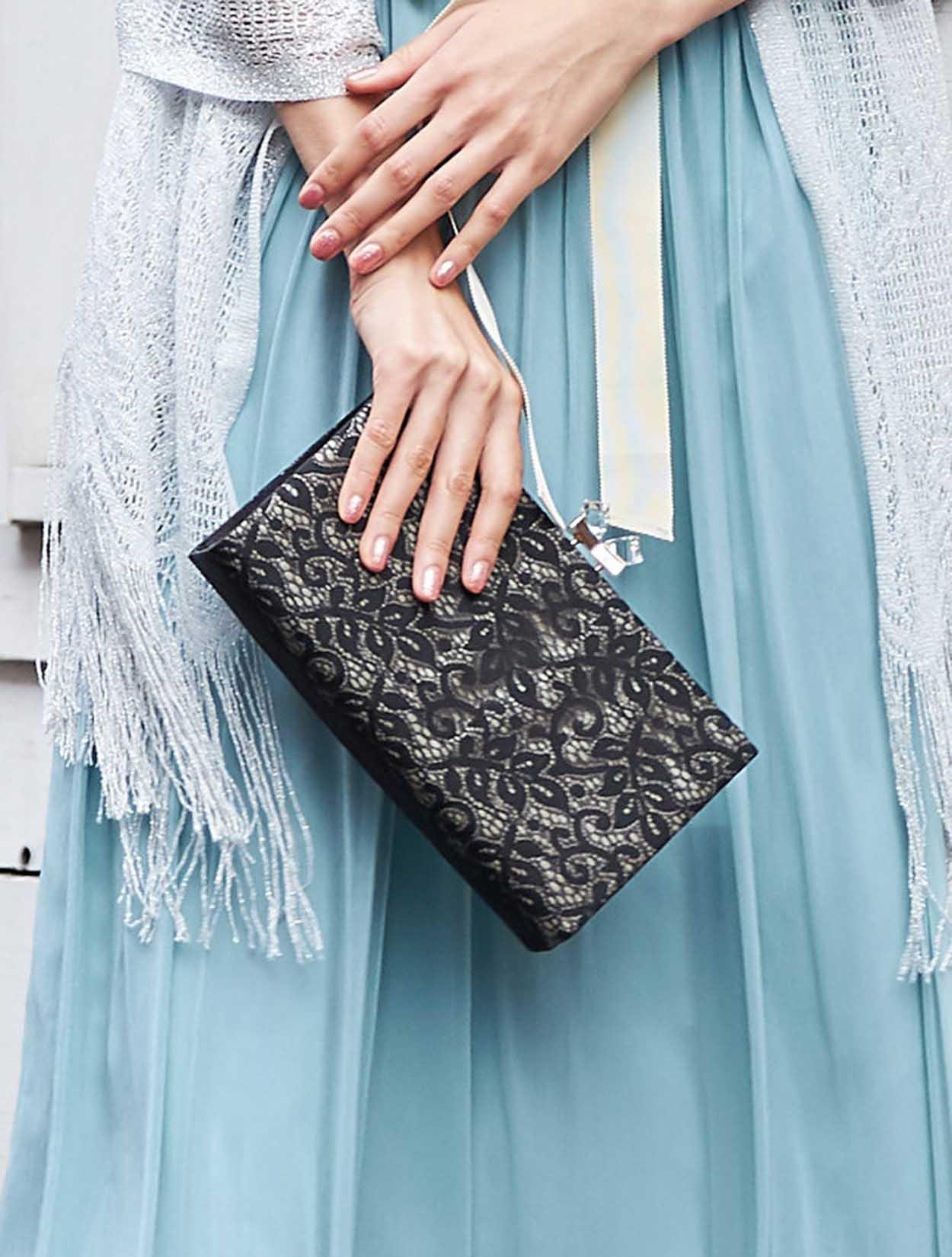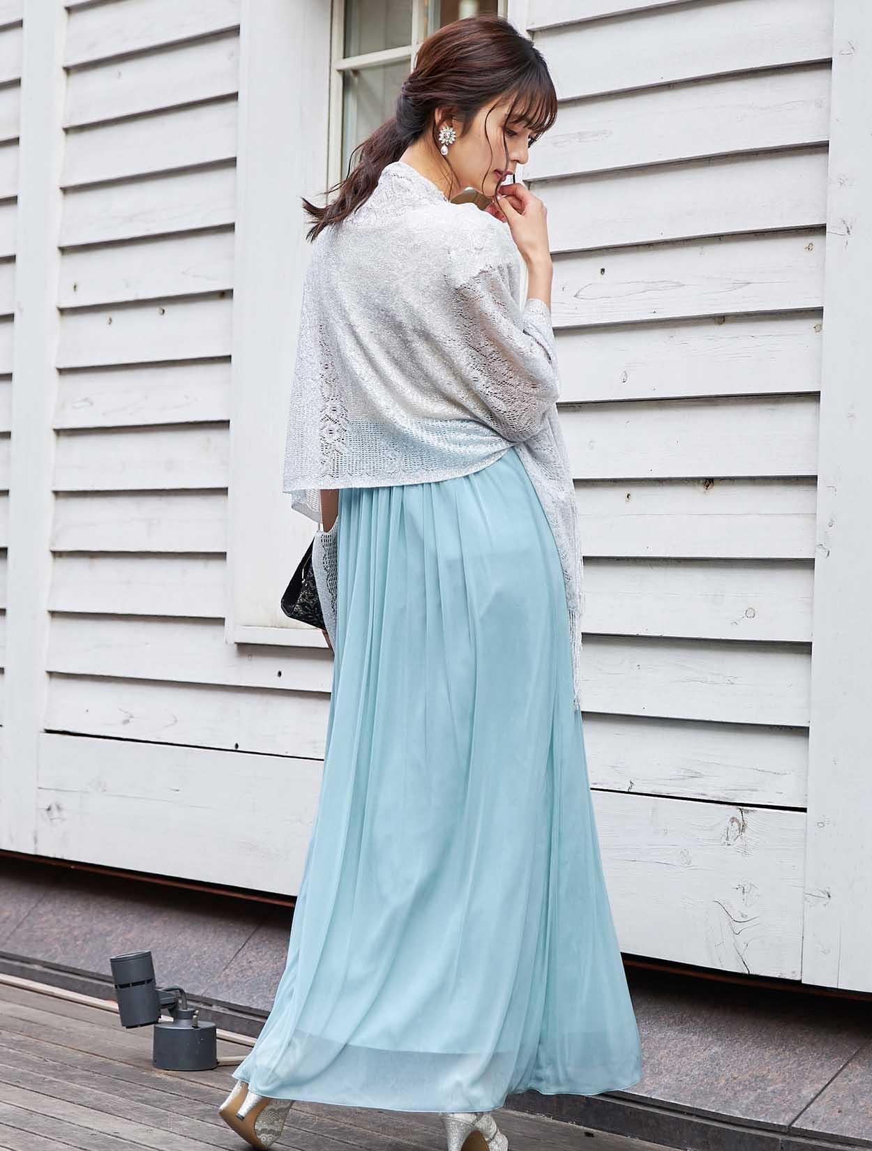 シルバーショールとブラッククラッチが大人っぽい表情をプラスしたコーディネートです。