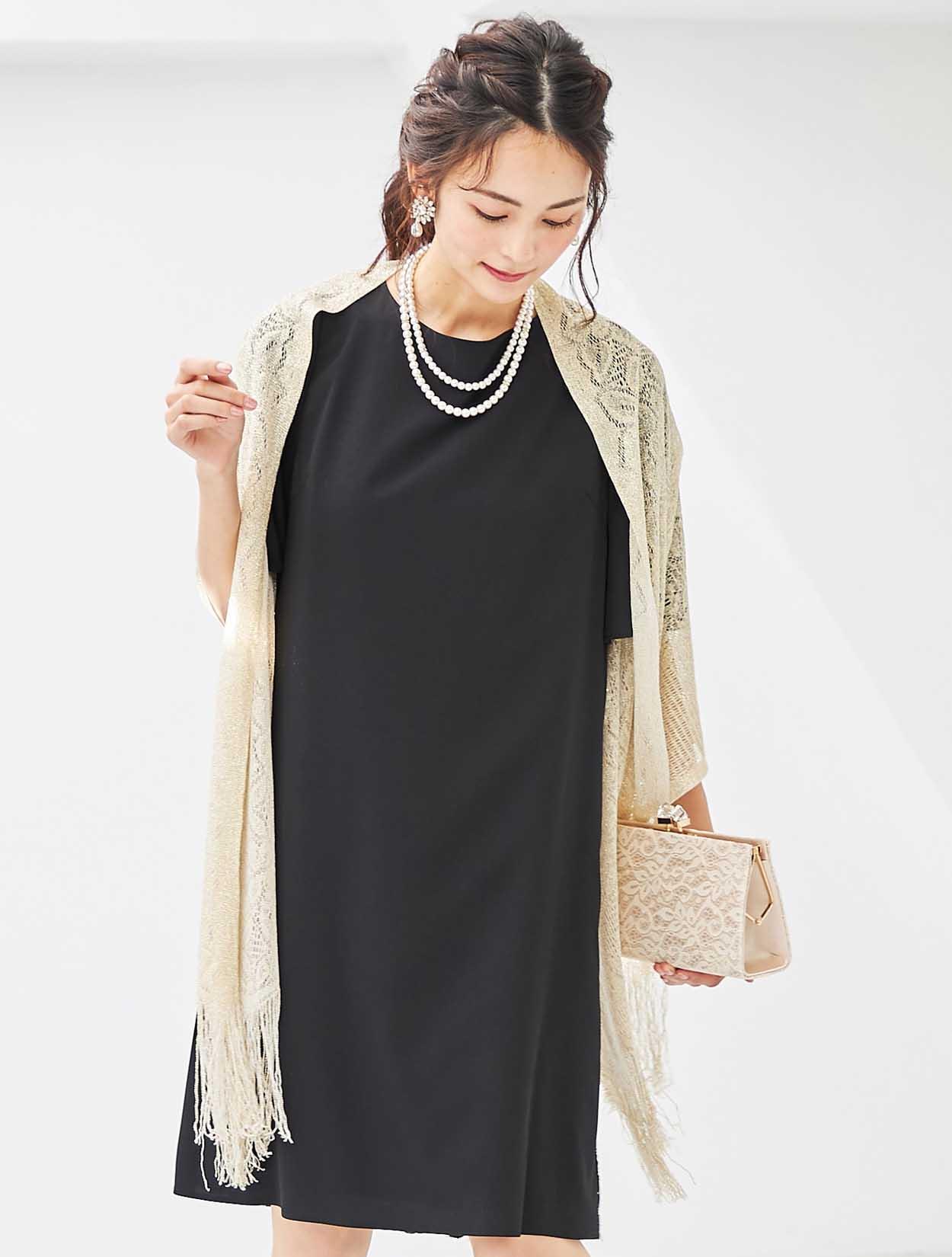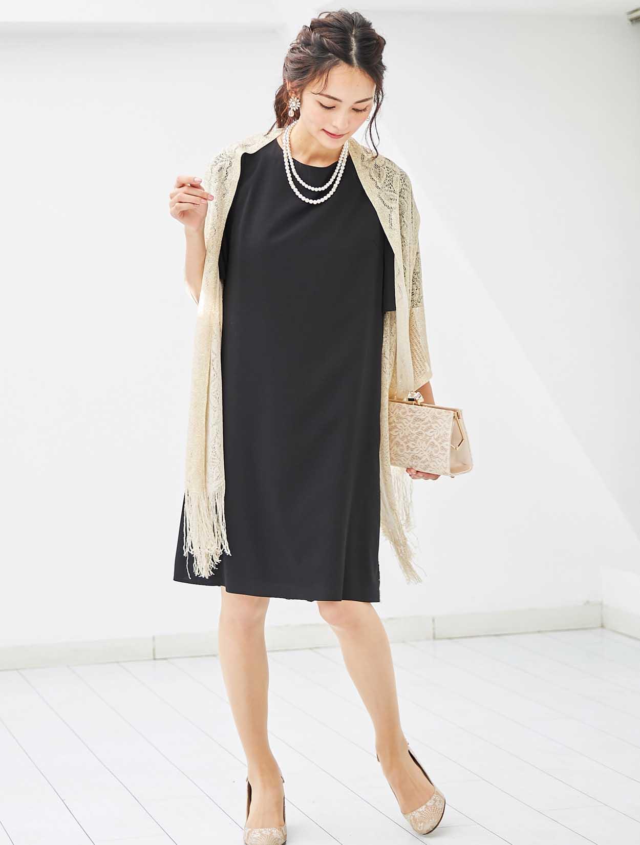 程良く厚みがあり滑らかな肌触りのサテン生地と、バックスタイルには大胆にレースを施したドレス。ストンとした落ち感のある素材はさりげなく体型をカバーしてくれます。