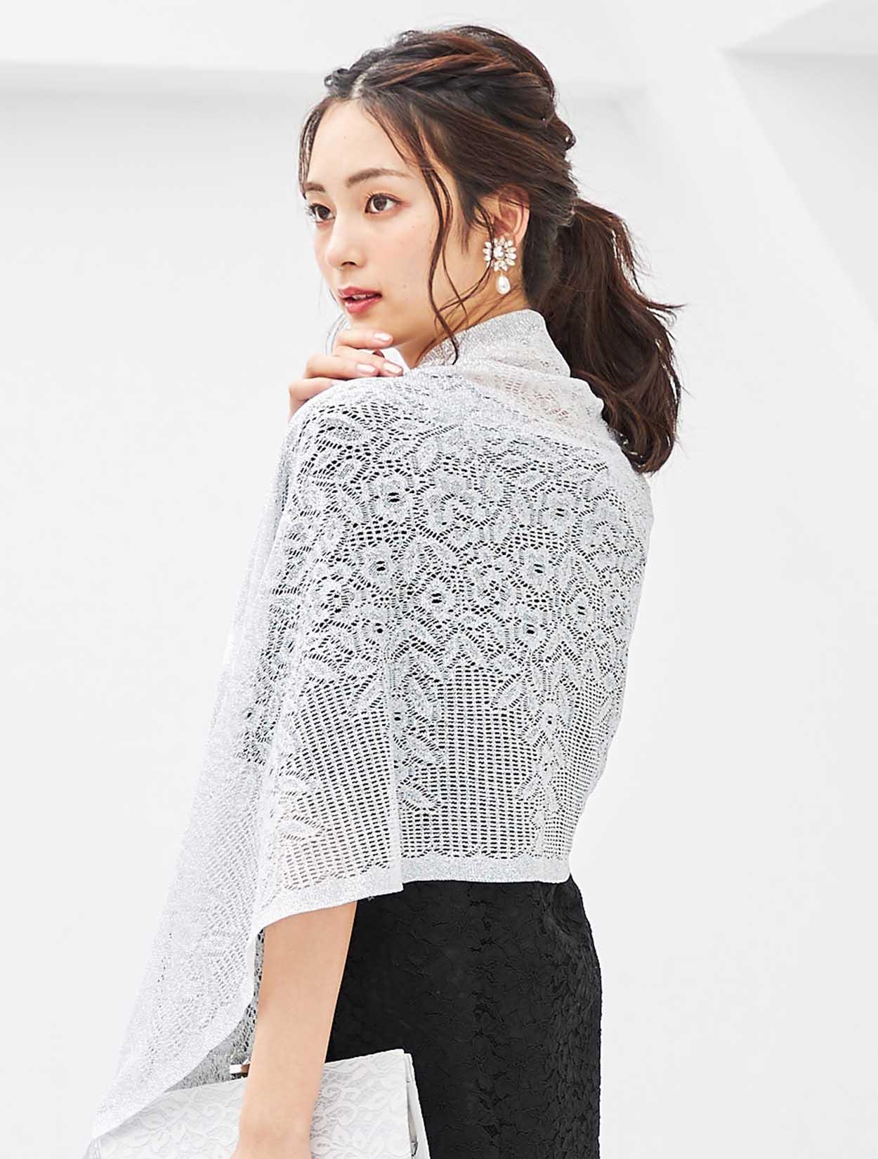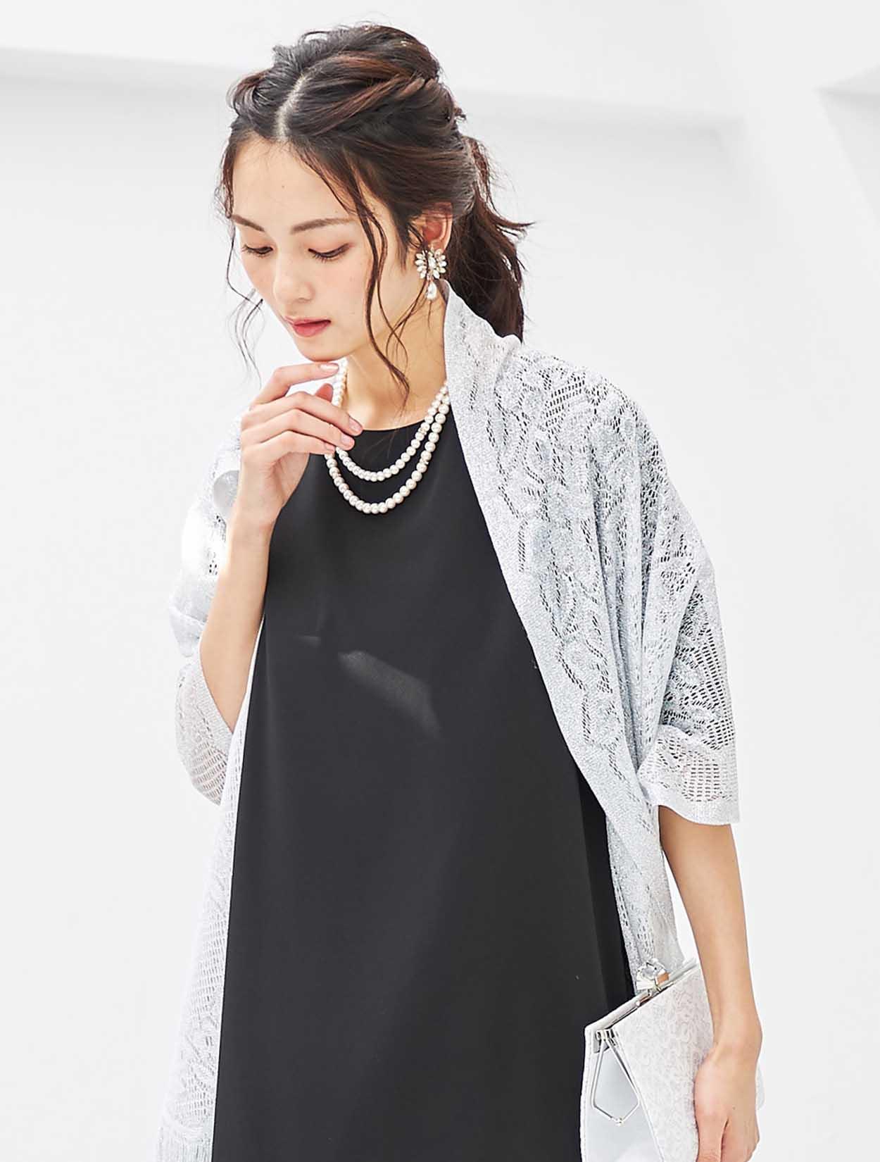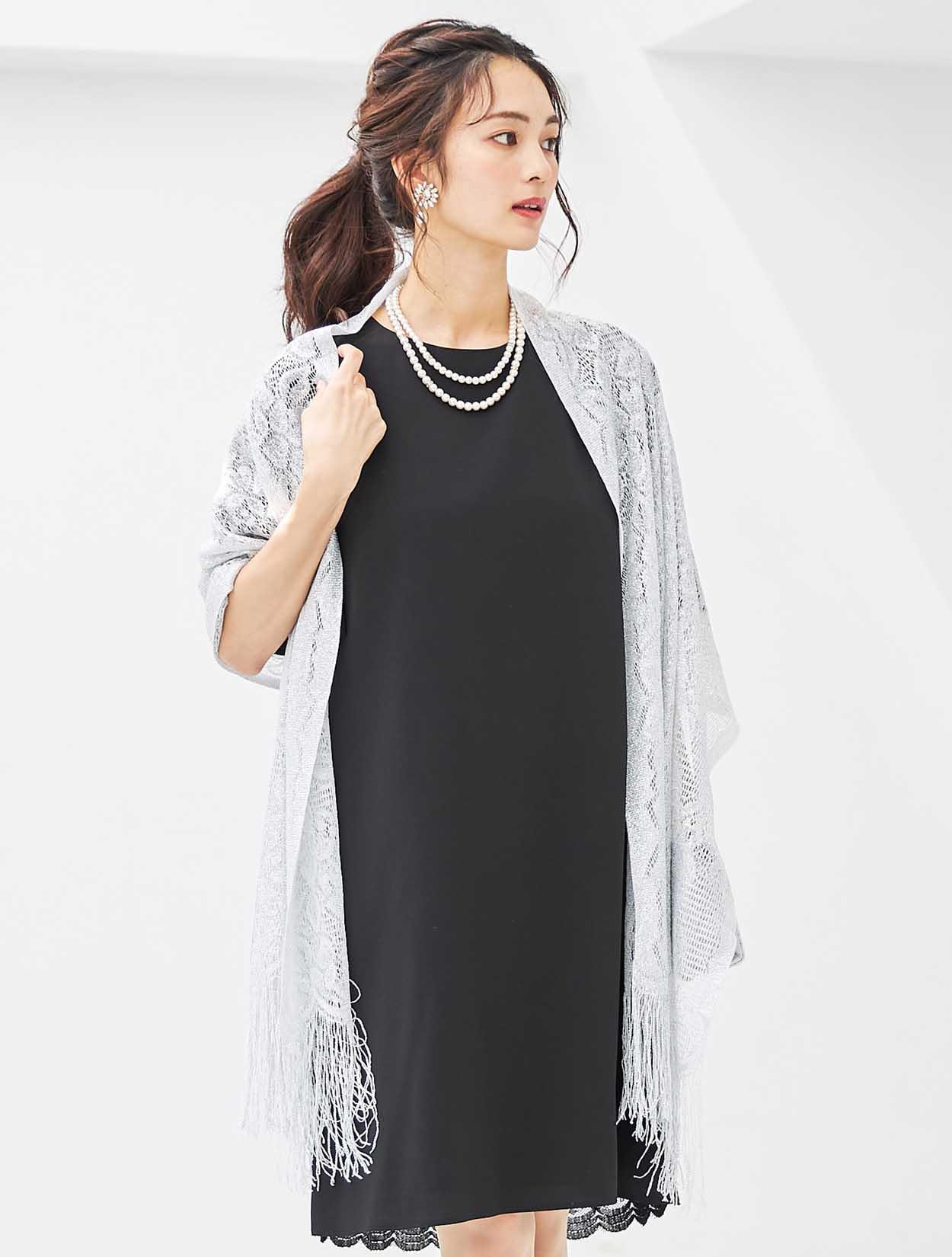 ブラックドレスにシルバーのラメ入りストールを合わせ、程よい華やかさをプラスしました。