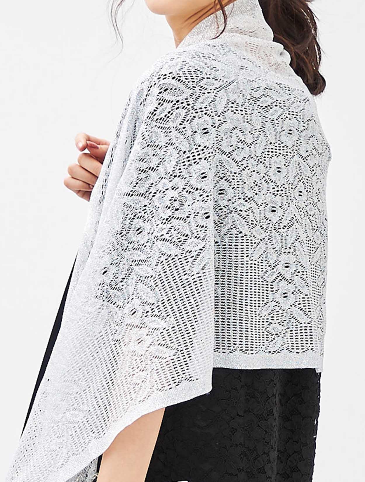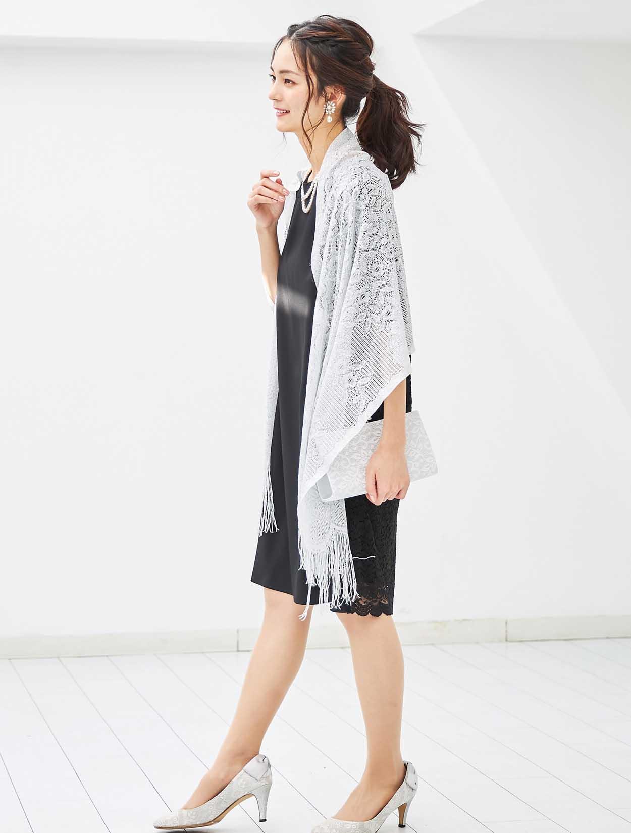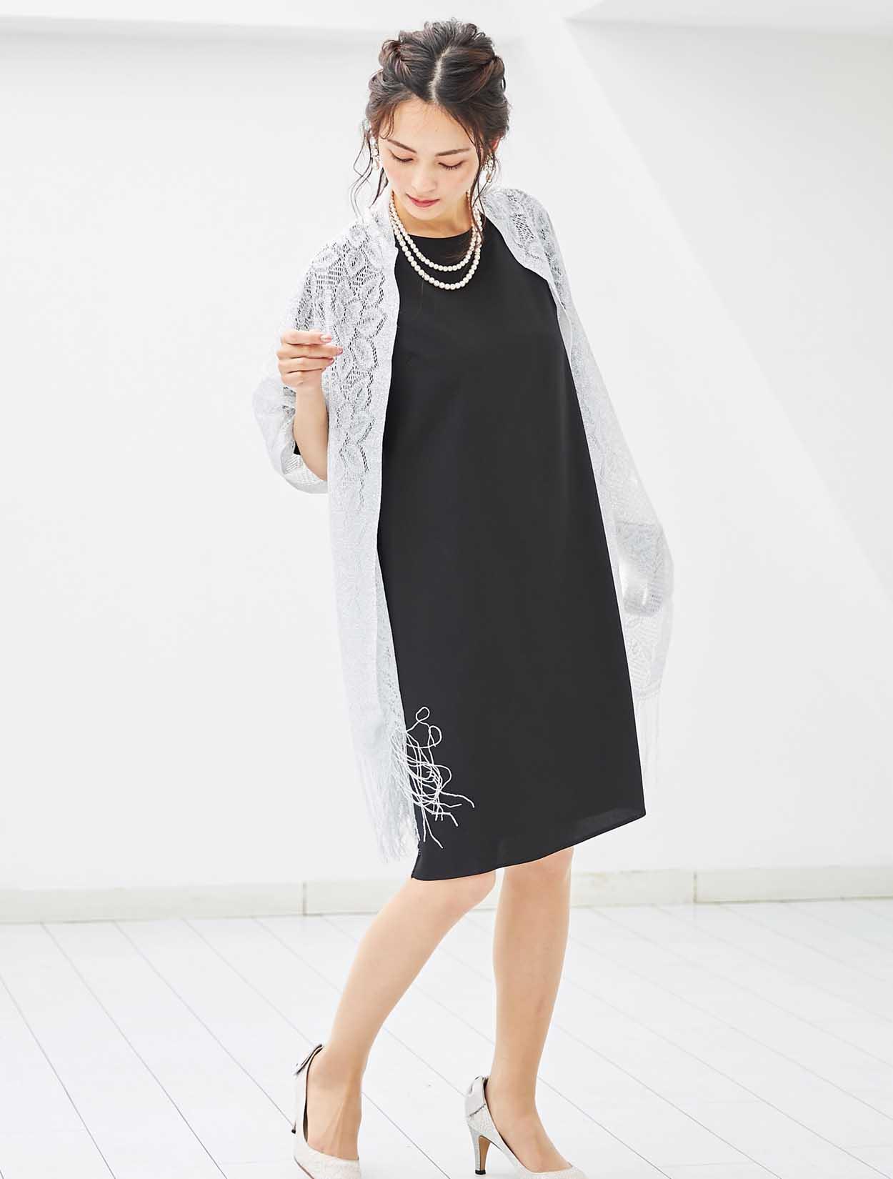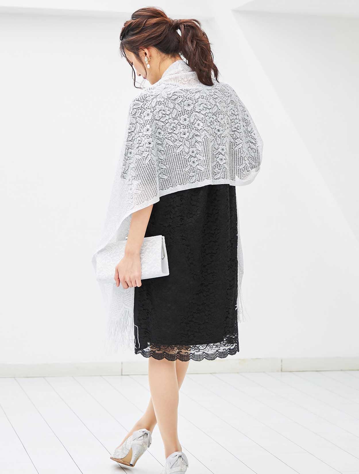 ブラックドレスにシルバーのラメ入りストールを合わせ、程よい華やかさをプラスしました。