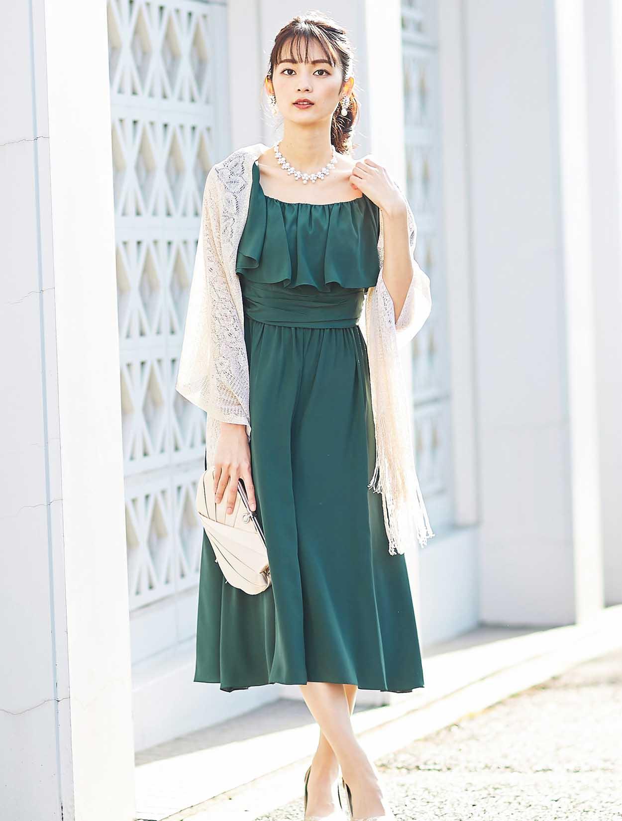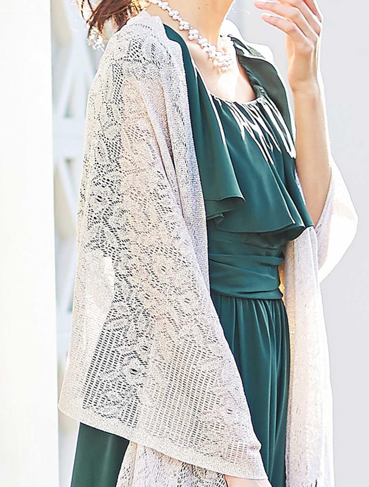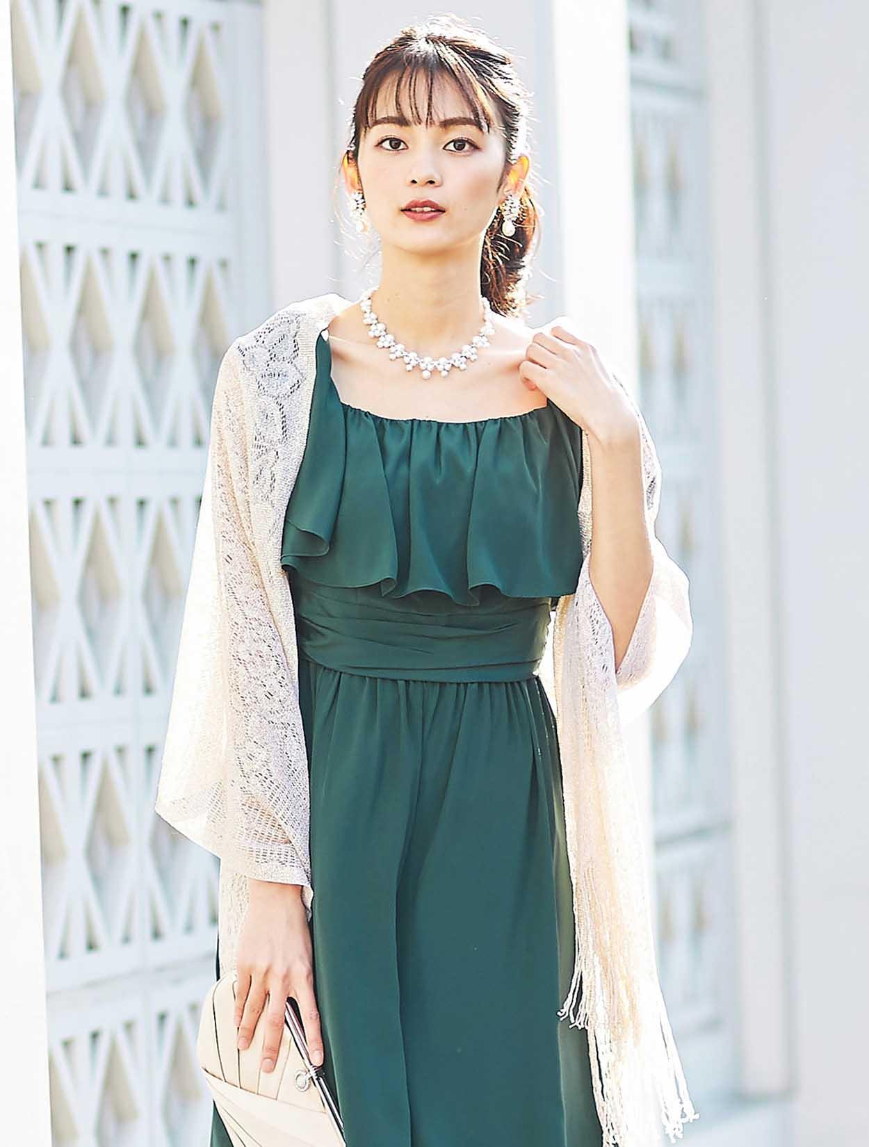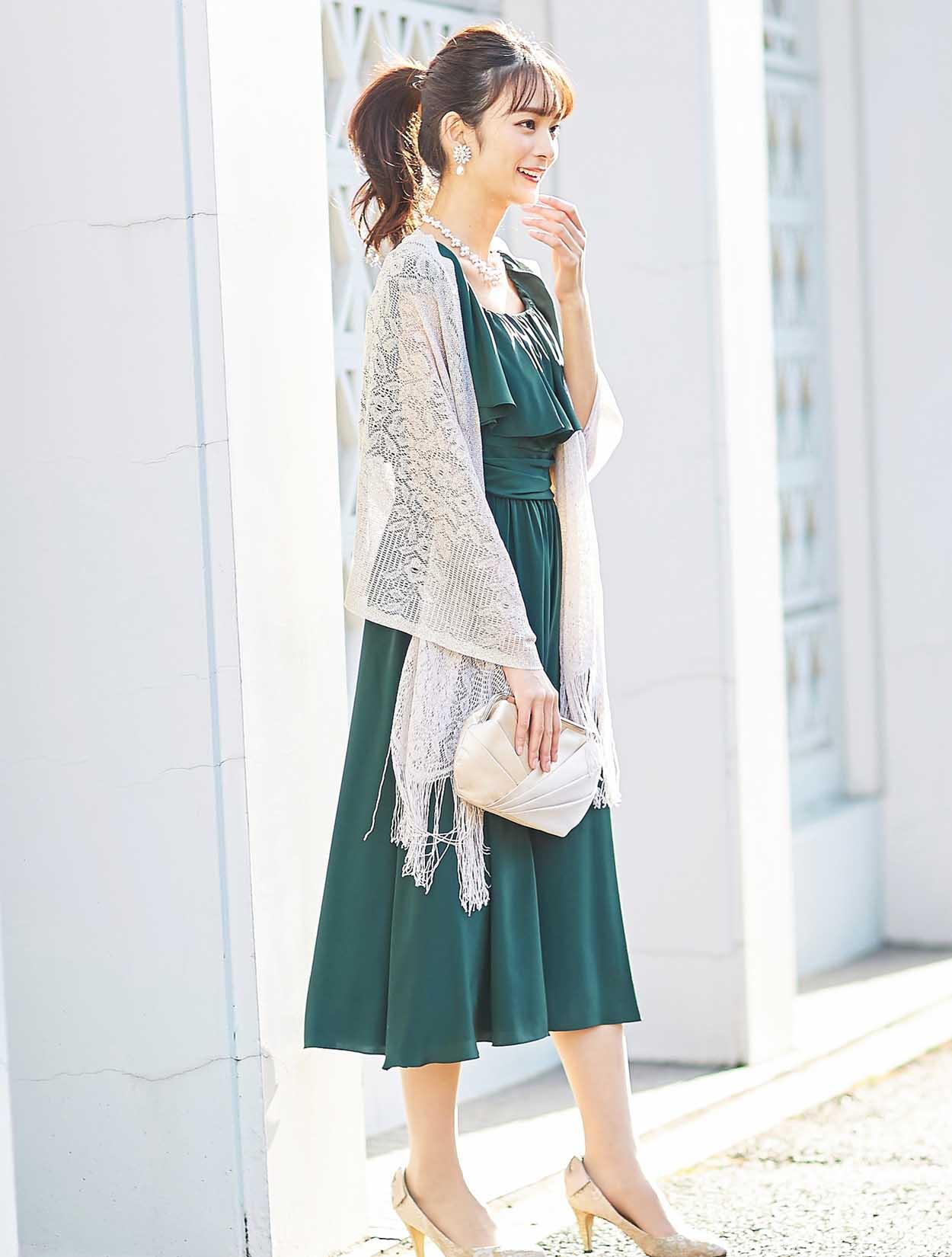 マットな質感のドレスに、透け感のあるショールを合わせてエアリー感をプラス。