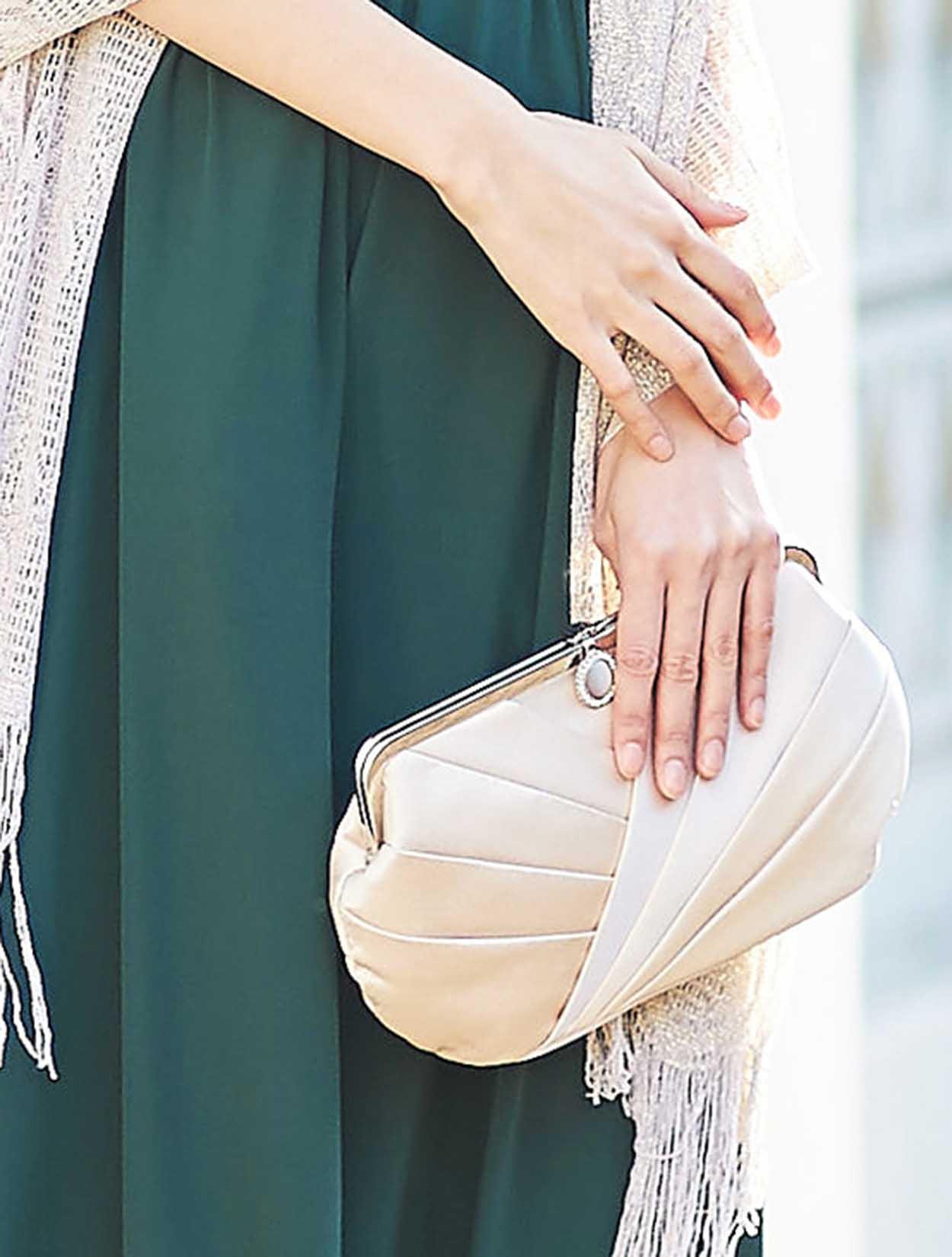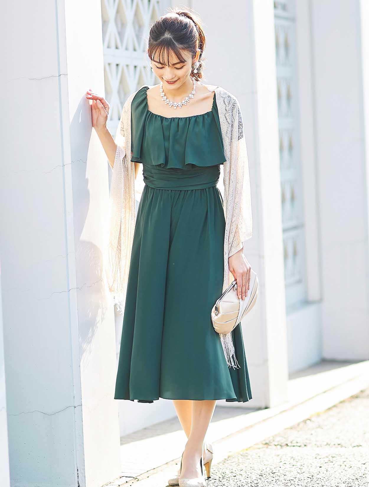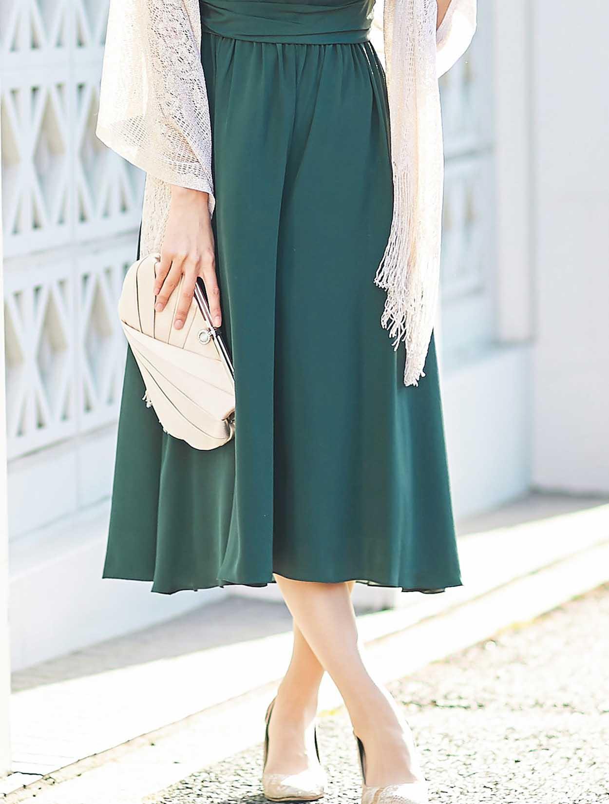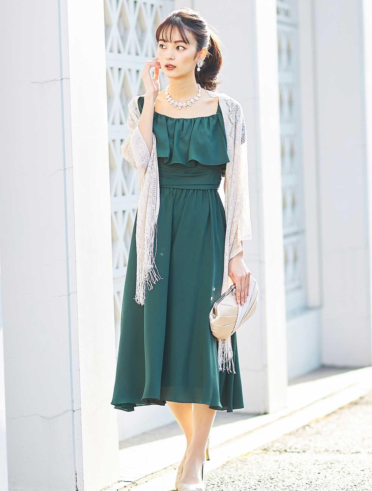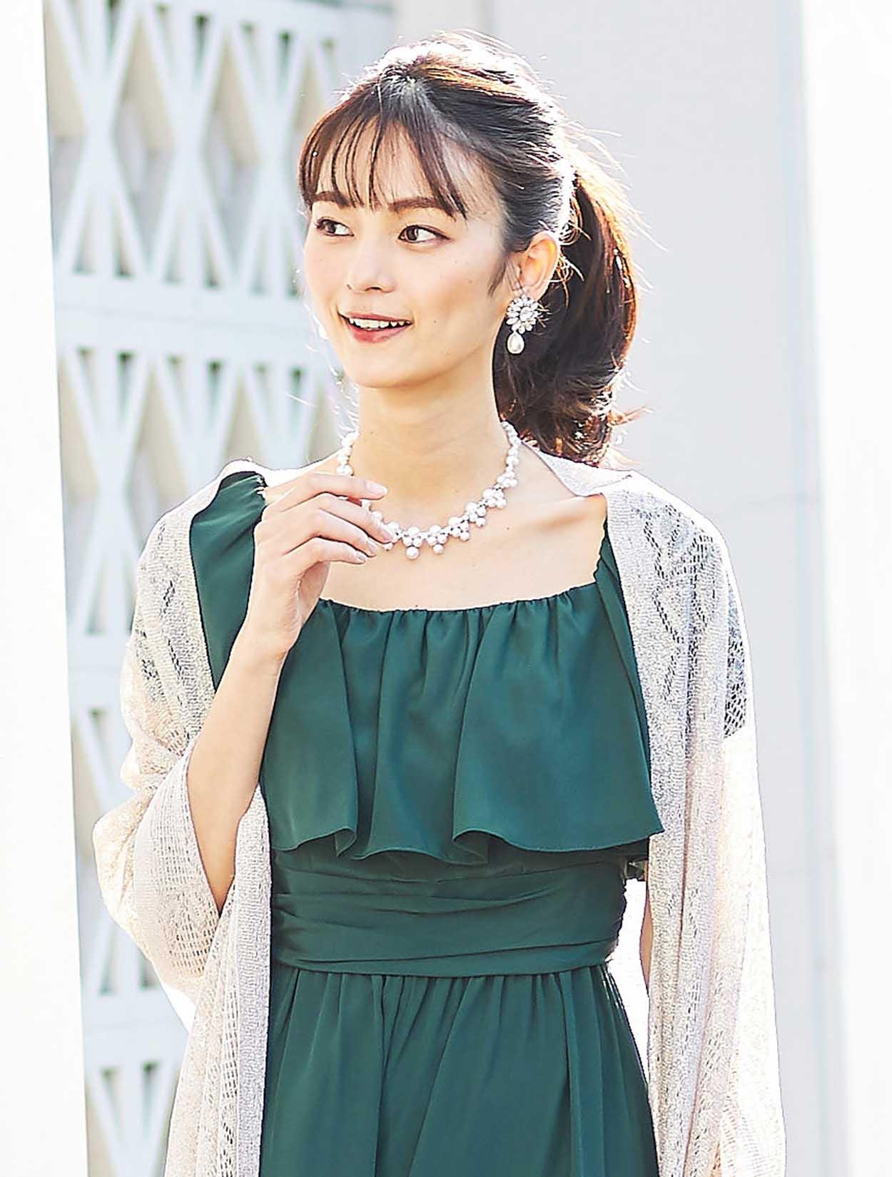 マットな質感のドレスに、透け感のあるショールを合わせてエアリー感をプラス。