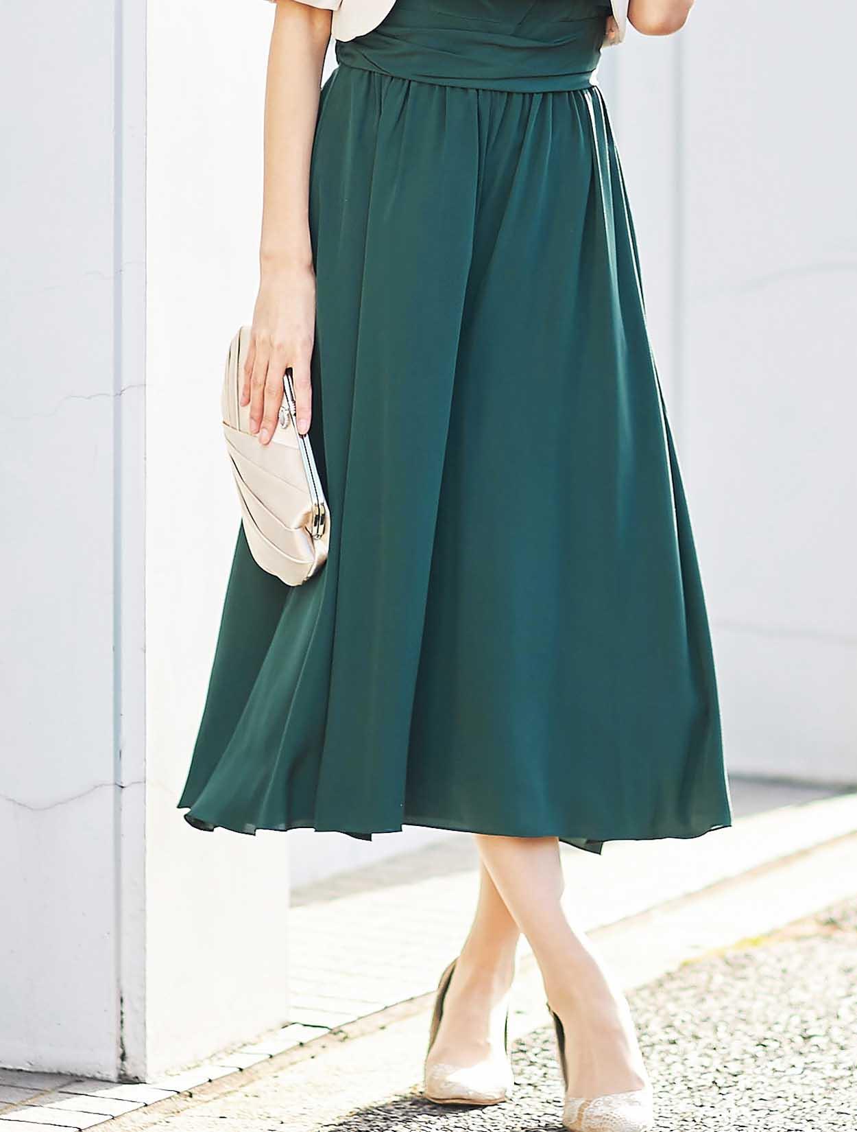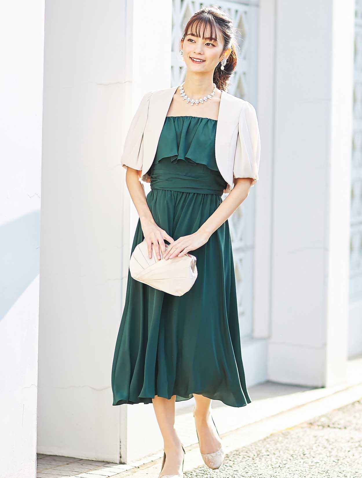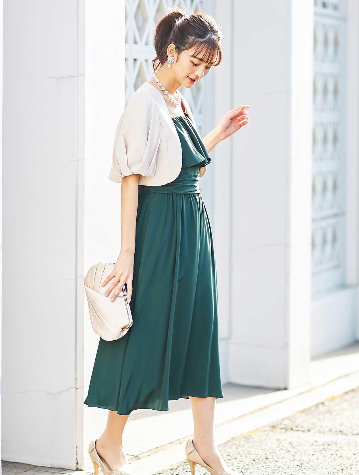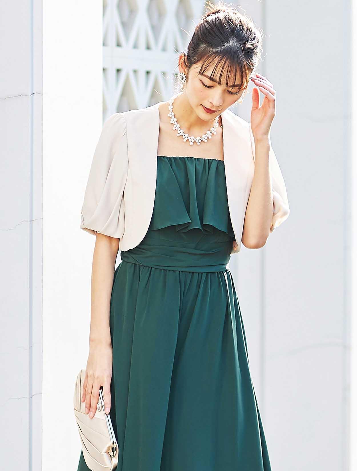 大胆なフリルでデコルテ部分をふんわり包み込むエアリーなデザインは、フェイスラインに華やぎを与えてくれます。スッキリとしたウエスト周りでスタイルアップも叶います。