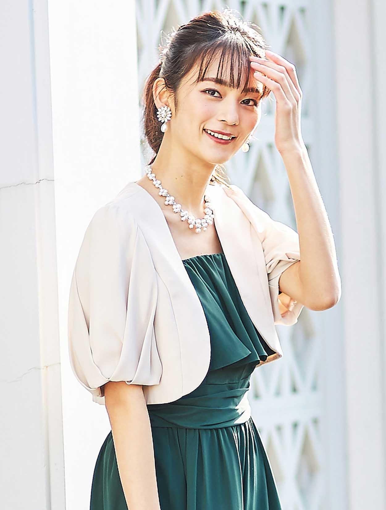 ボレロの袖がふんわりと丸みのあるシルエットなので、ジャケットですが優しい印象を与えてくれます。