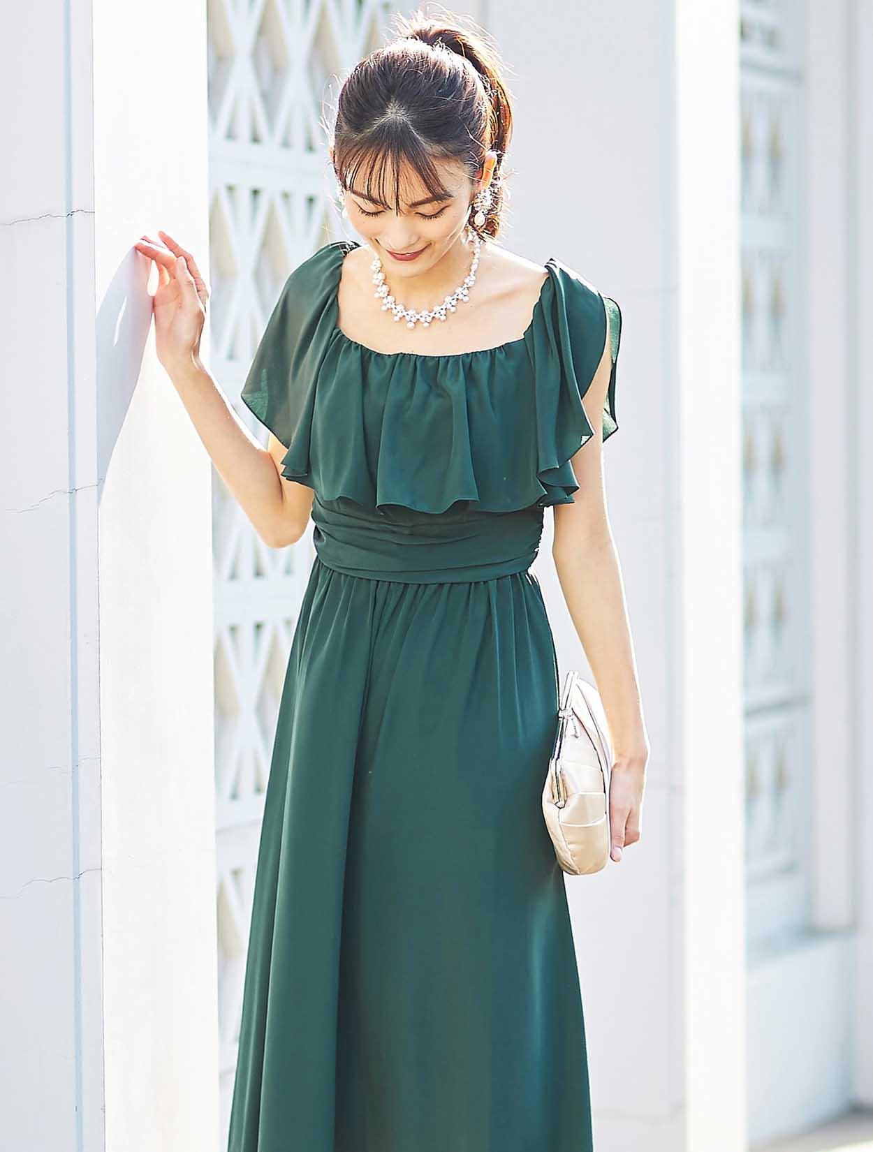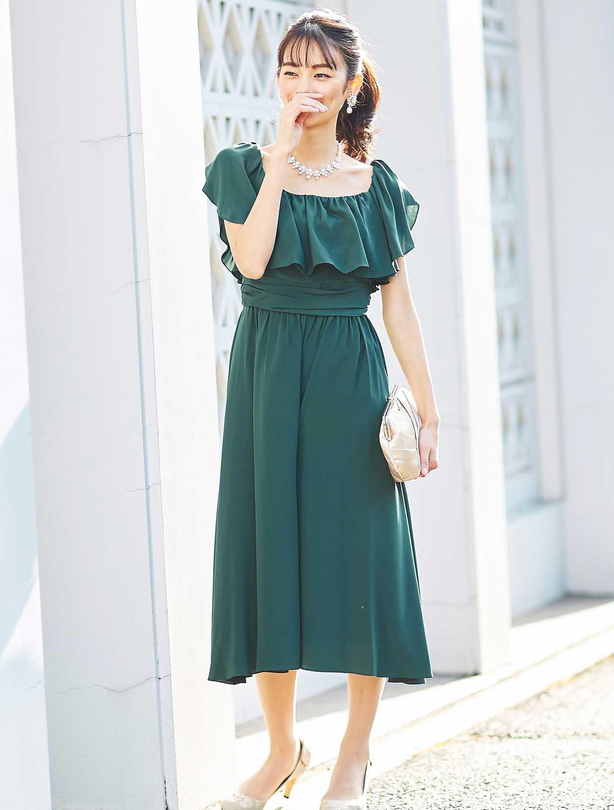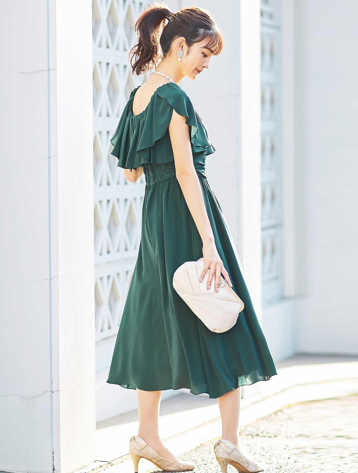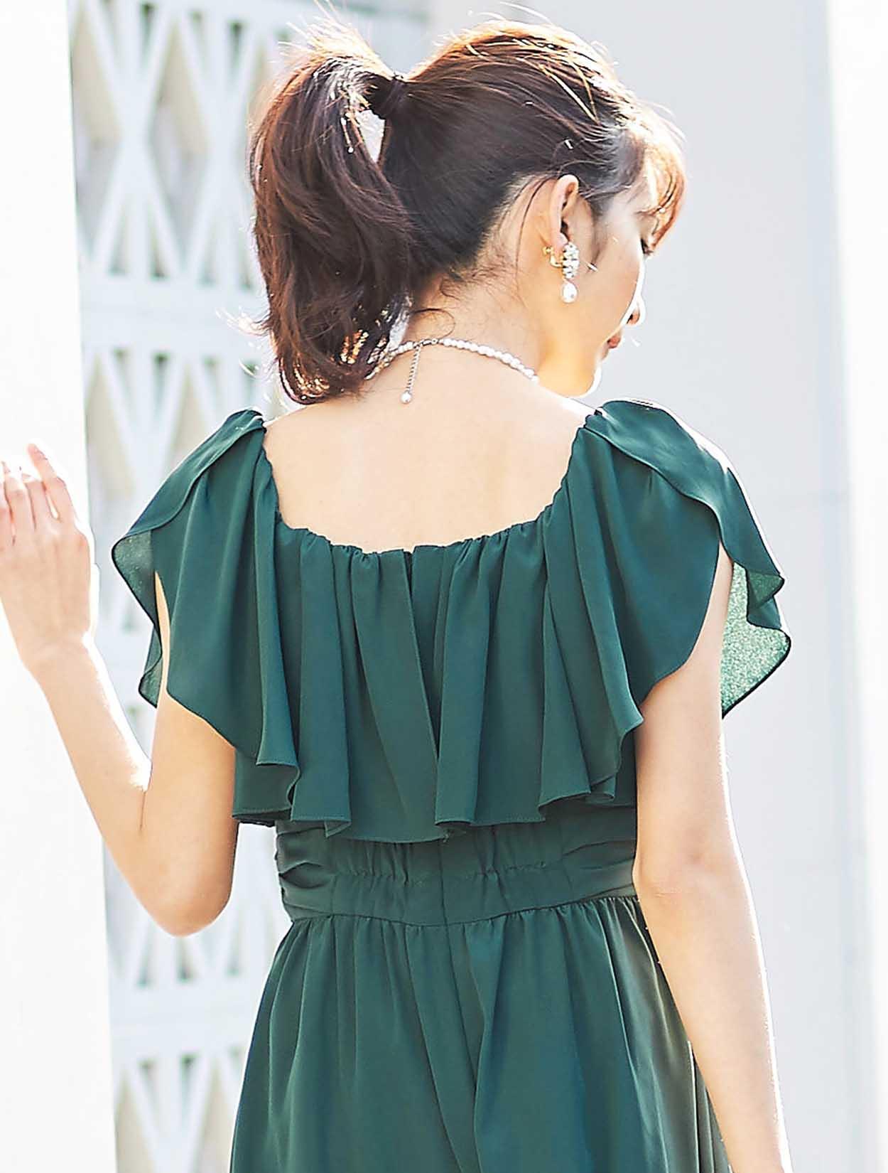 大胆なフリルでデコルテ部分をふんわり包み込むエアリーなデザインは、フェイスラインに華やぎを与えてくれます。スッキリとしたウエスト周りでスタイルアップも叶います。