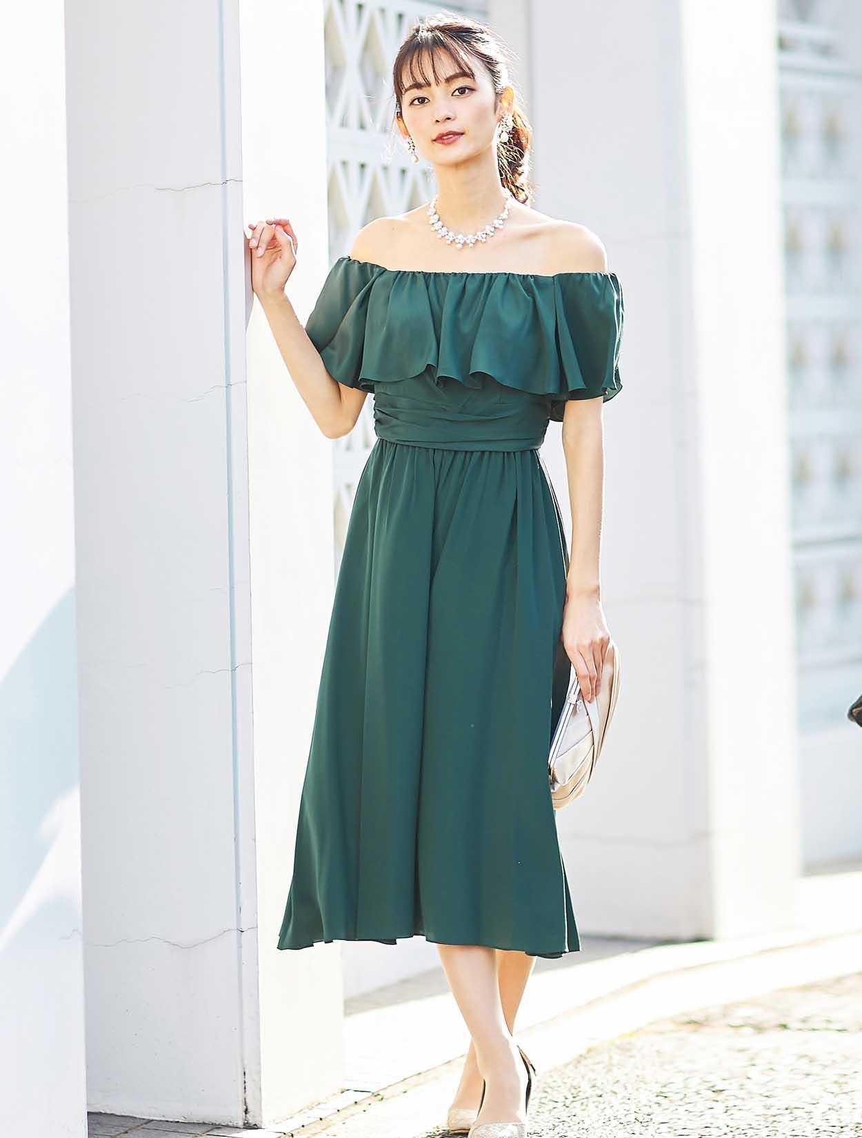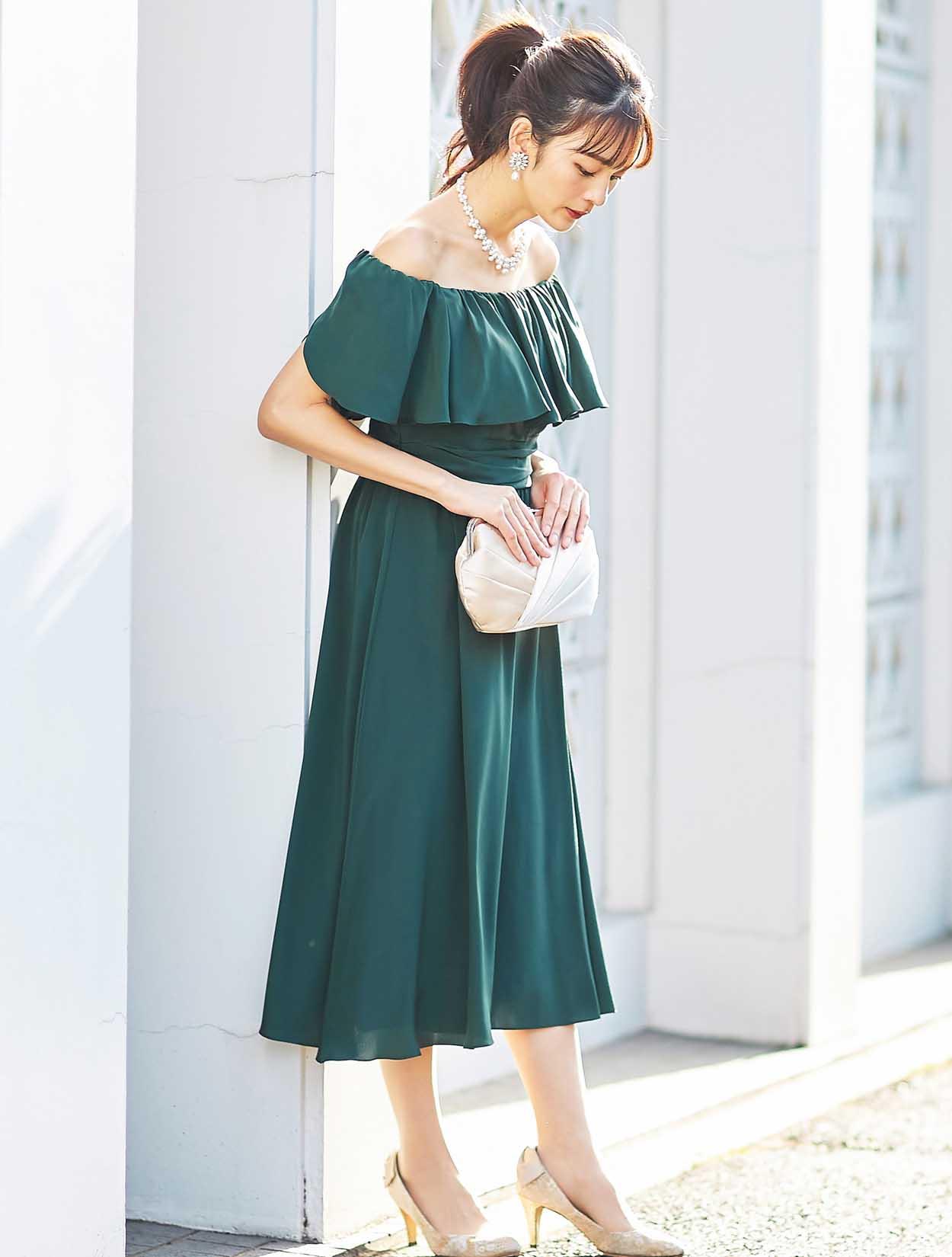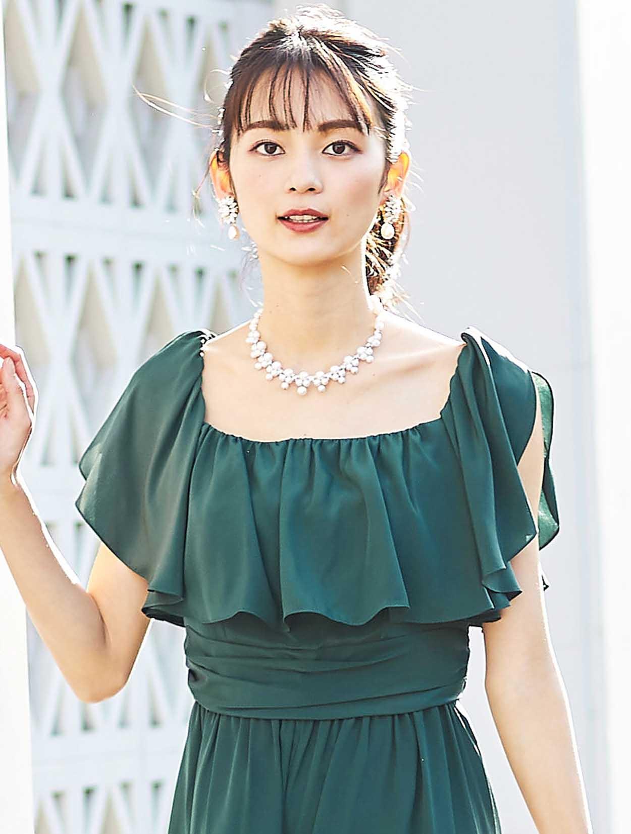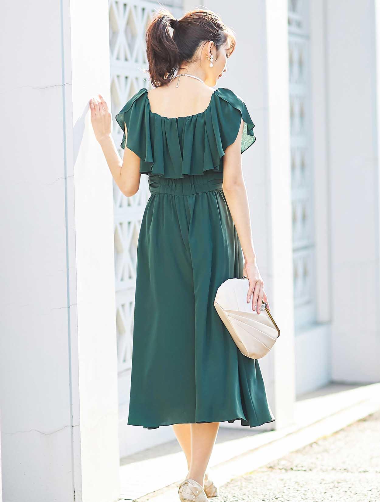 大胆なフリルでデコルテ部分をふんわり包み込むエアリーなデザインは、フェイスラインに華やぎを与えてくれます。スッキリとしたウエスト周りでスタイルアップも叶います。