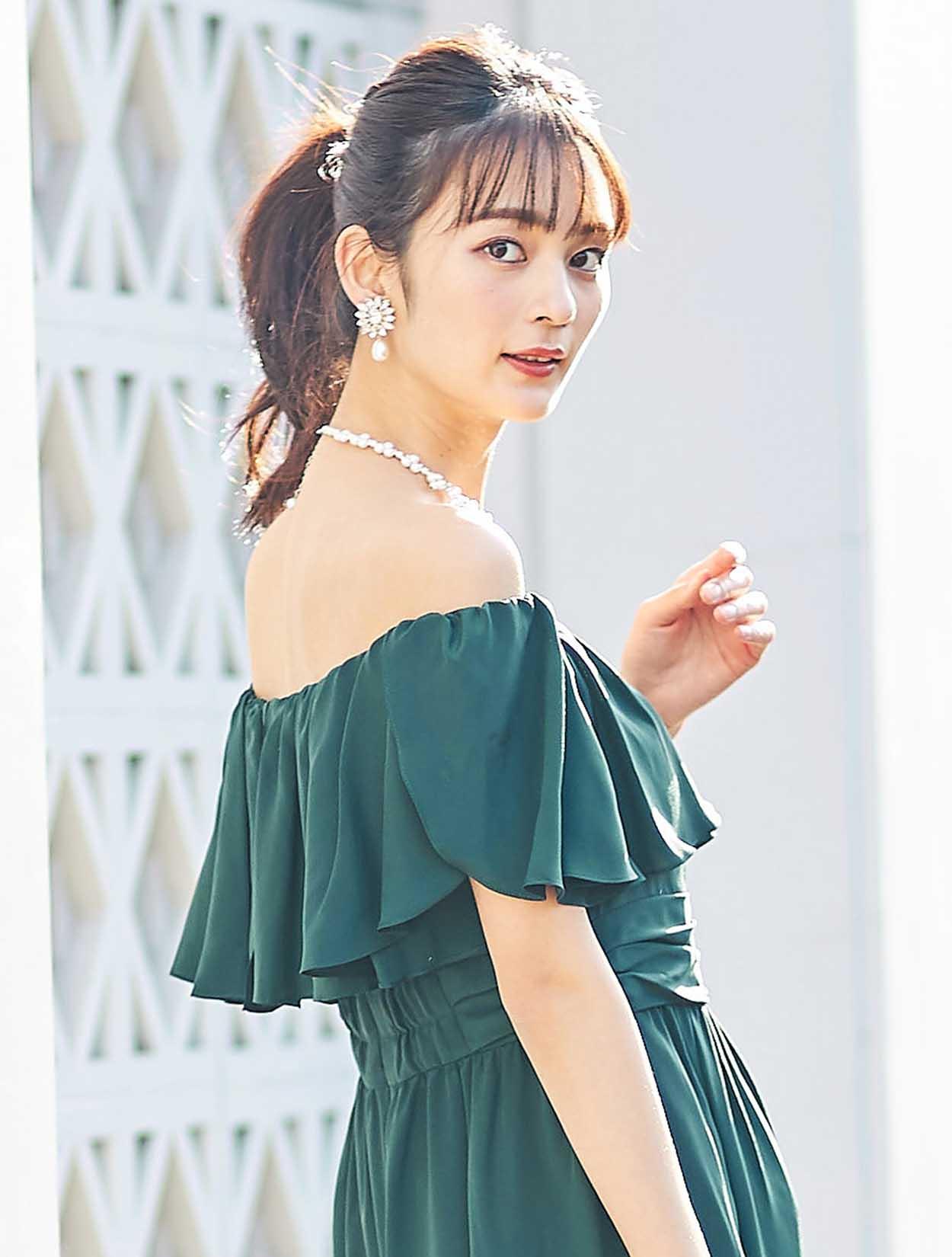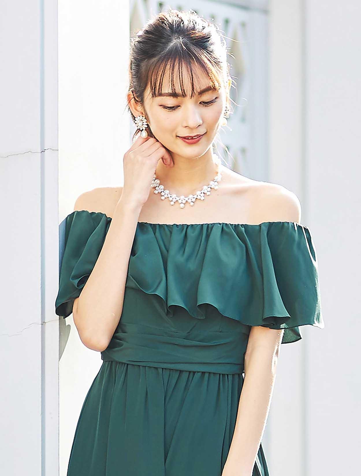 深いグリーンは大人の魅力を引き立たせてくれるカラー。マットな輝きが甘さ控えめでクールな印象に。
