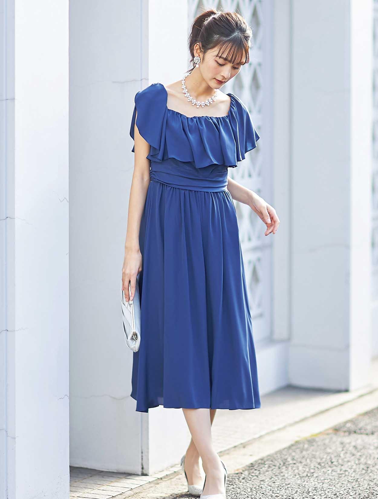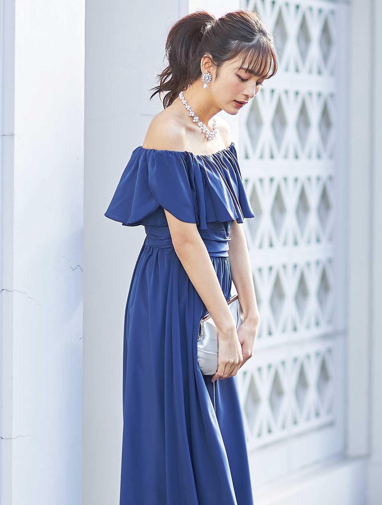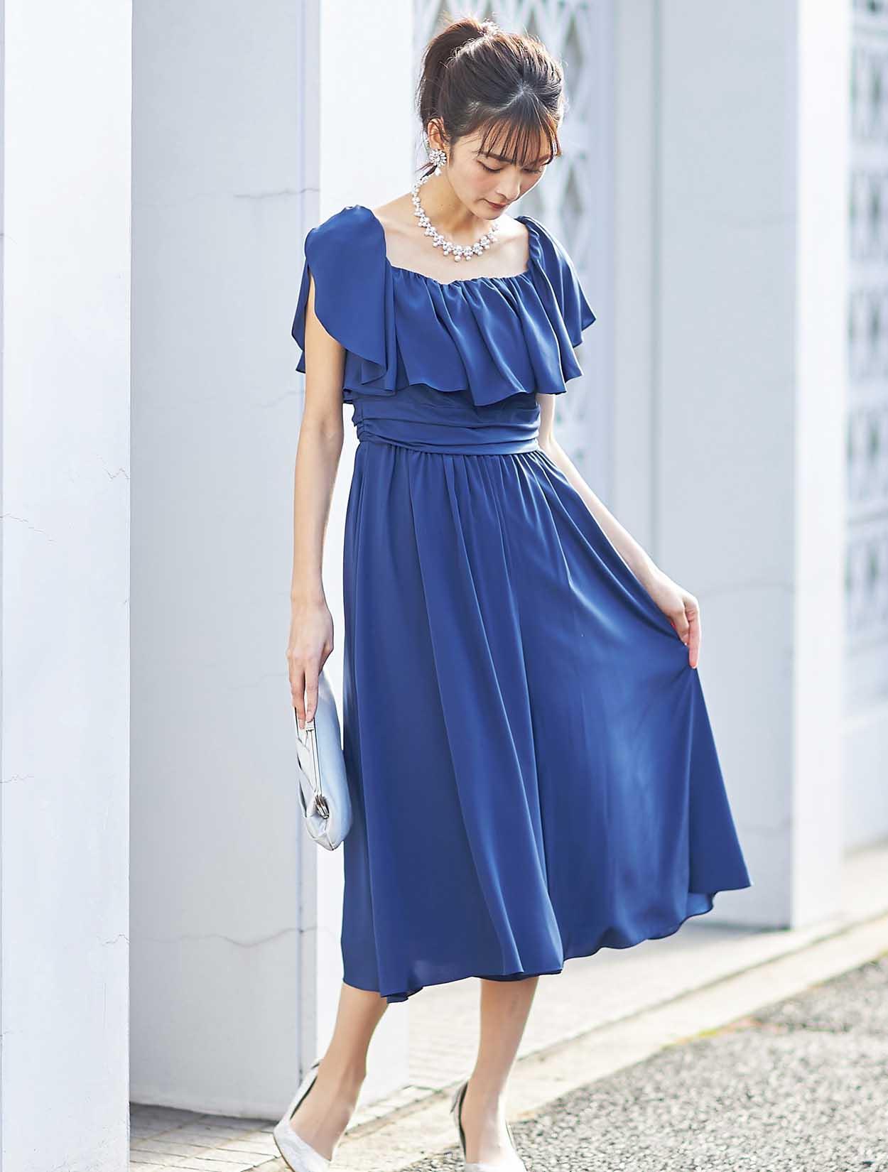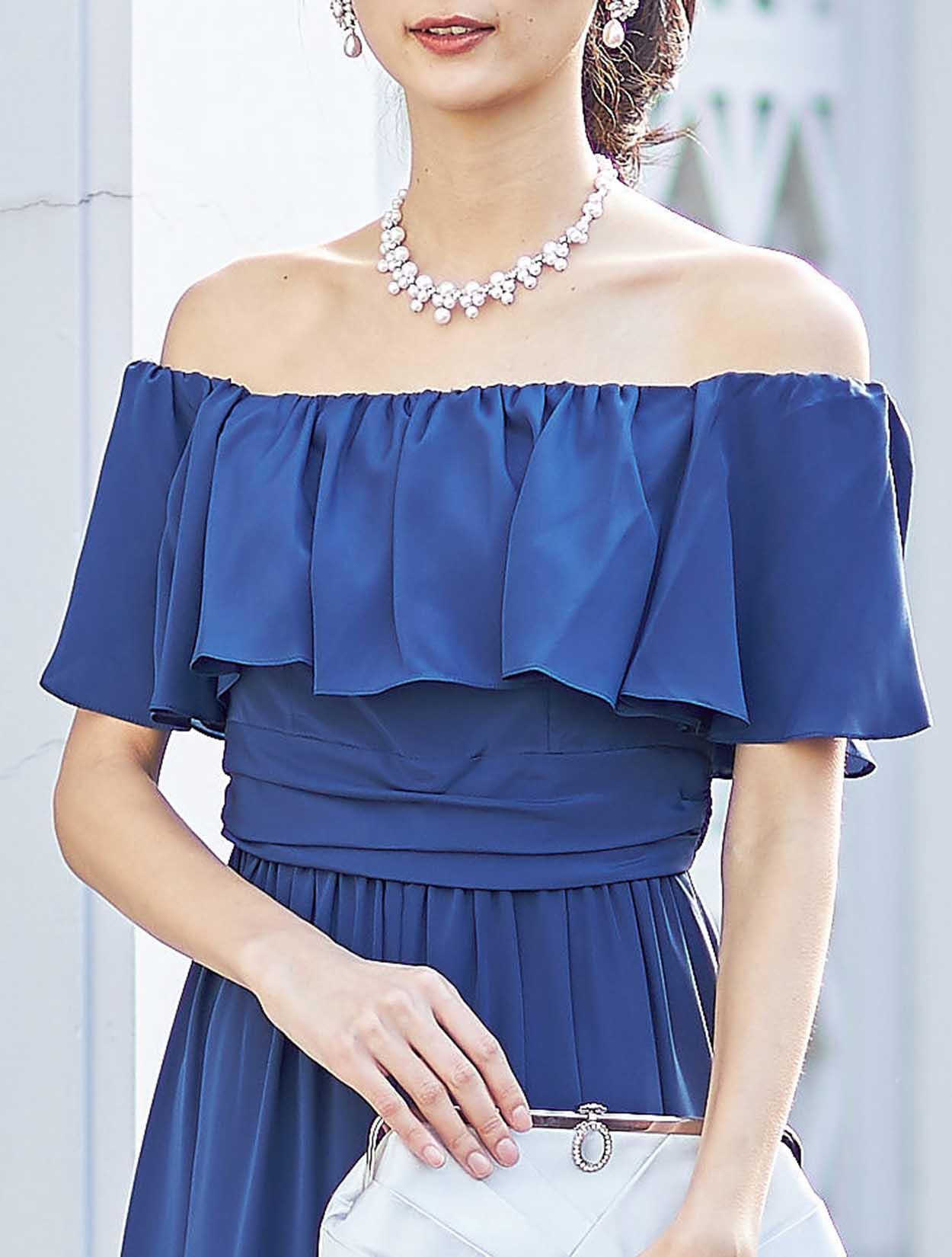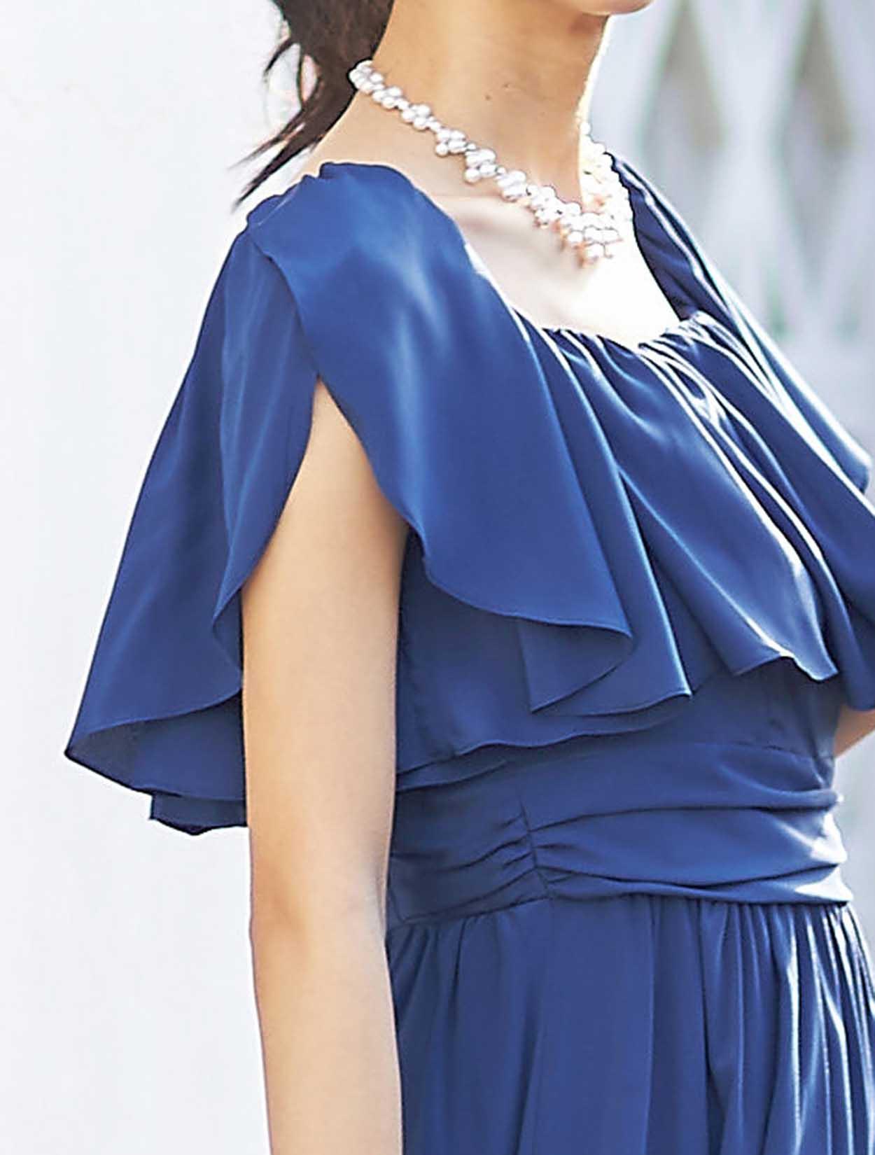大胆なフリルでデコルテ部分をふんわり包み込むエアリーなデザインは、フェイスラインに華やぎを与えてくれます。スッキリとしたウエスト周りでスタイルアップも叶います。