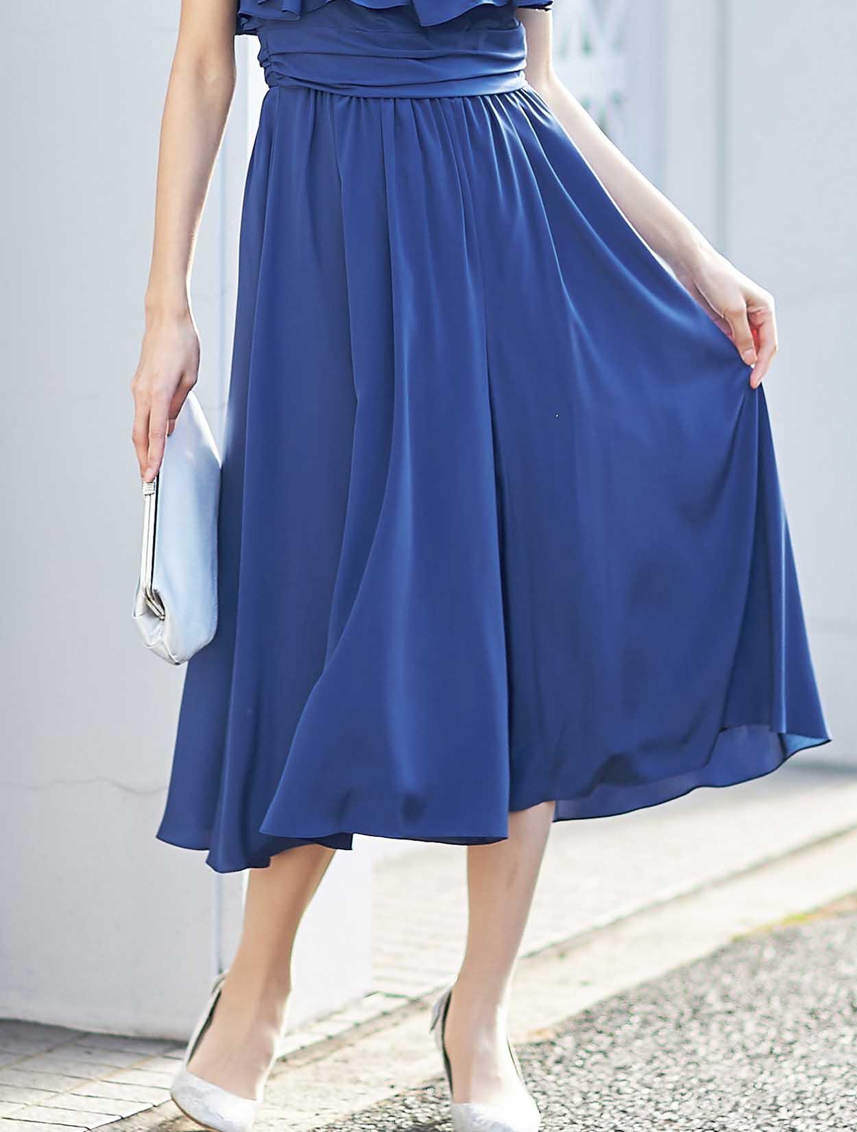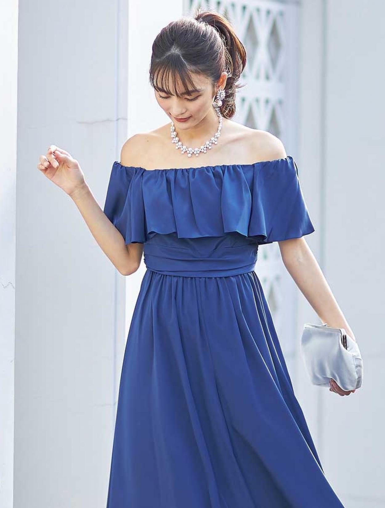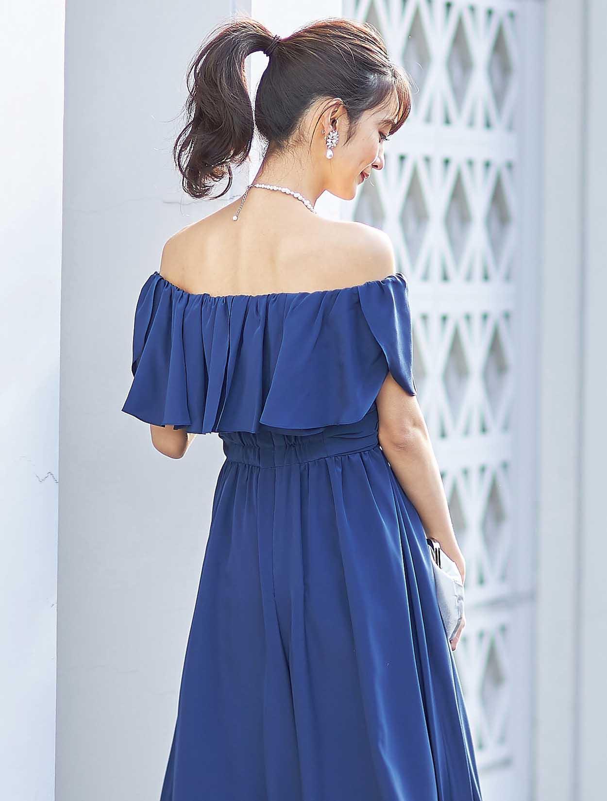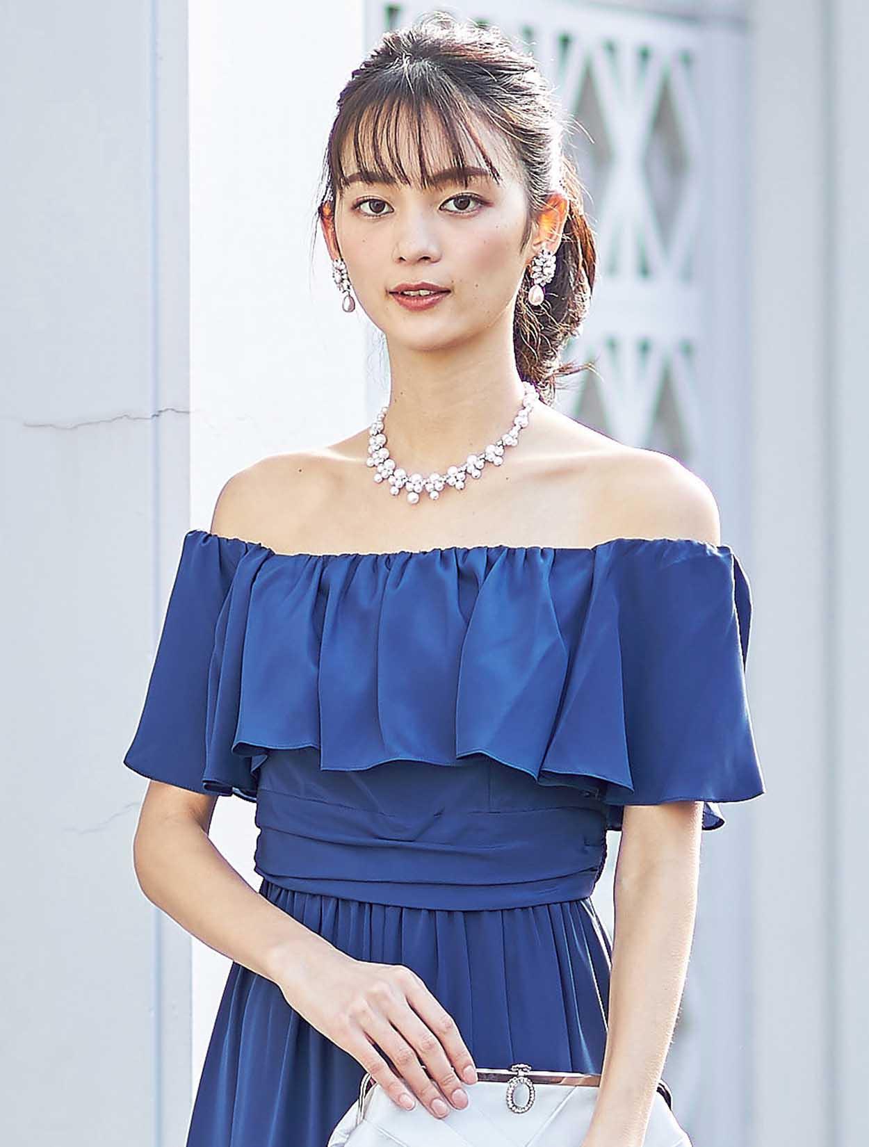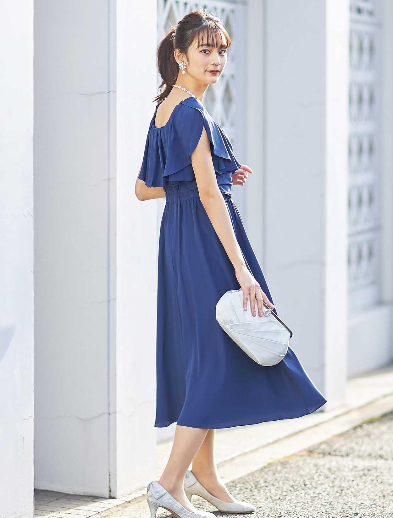 大胆なフリルでデコルテ部分をふんわり包み込むエアリーなデザインは、フェイスラインに華やぎを与えてくれます。スッキリとしたウエスト周りでスタイルアップも叶います。