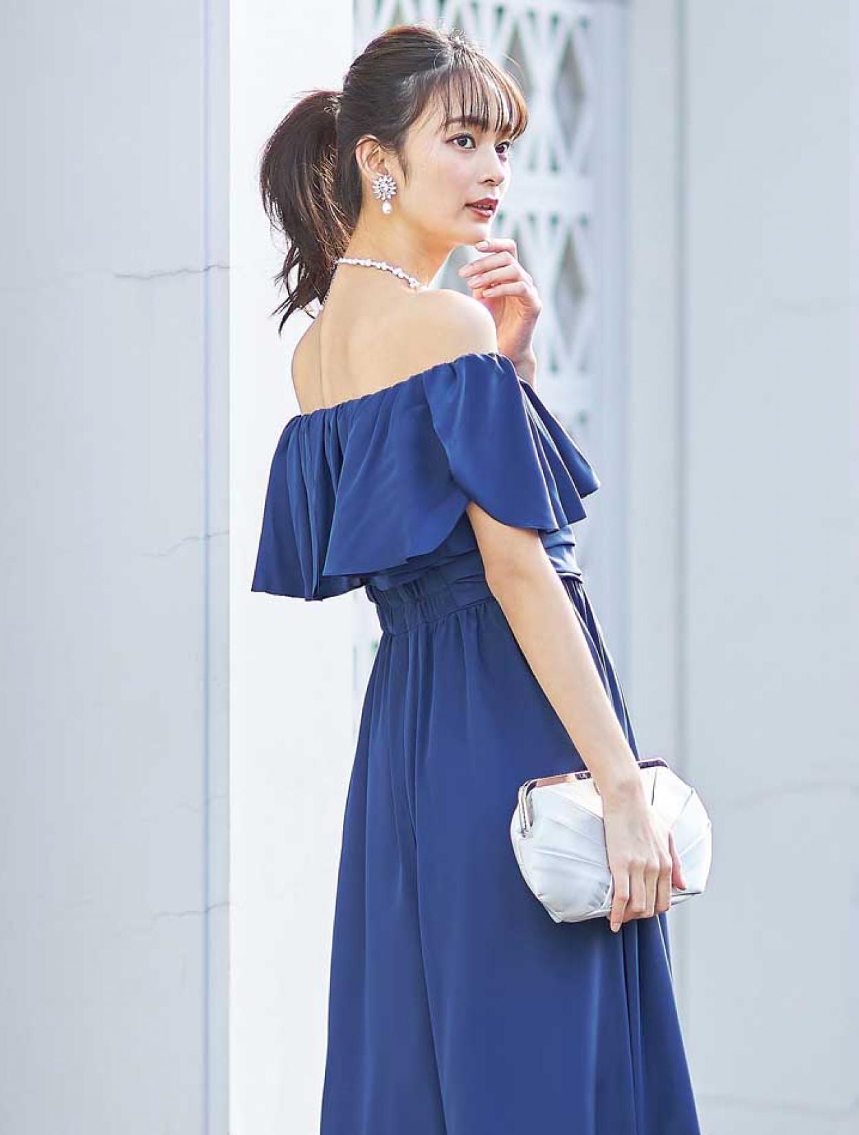 オフショルダーに映えるスカラップ調のネックレスが、デコルテ部分を華奢に美しく見せてくれます。