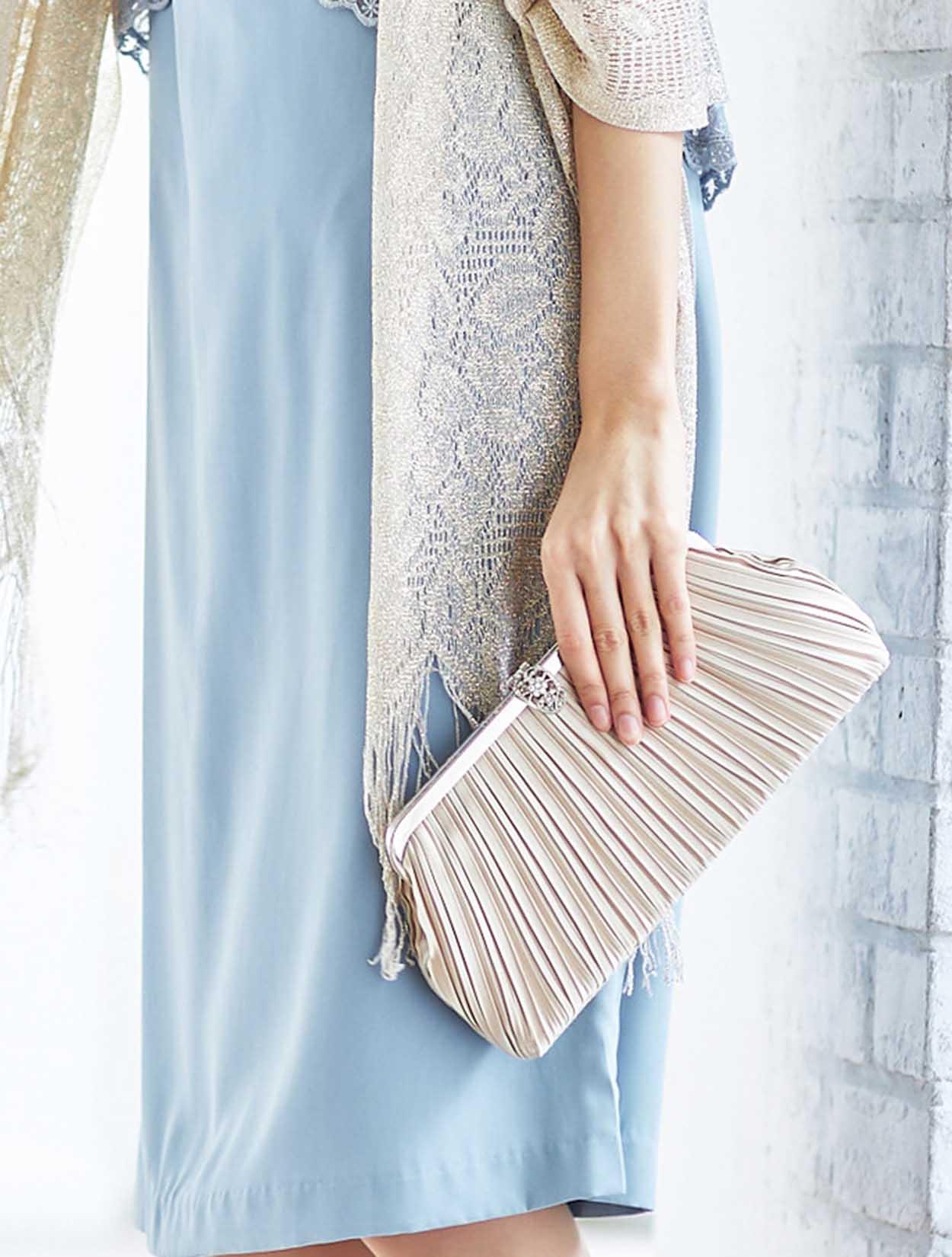 ゴールドベージュの小物を合わせた女性らしい華やかなコーディネートです。