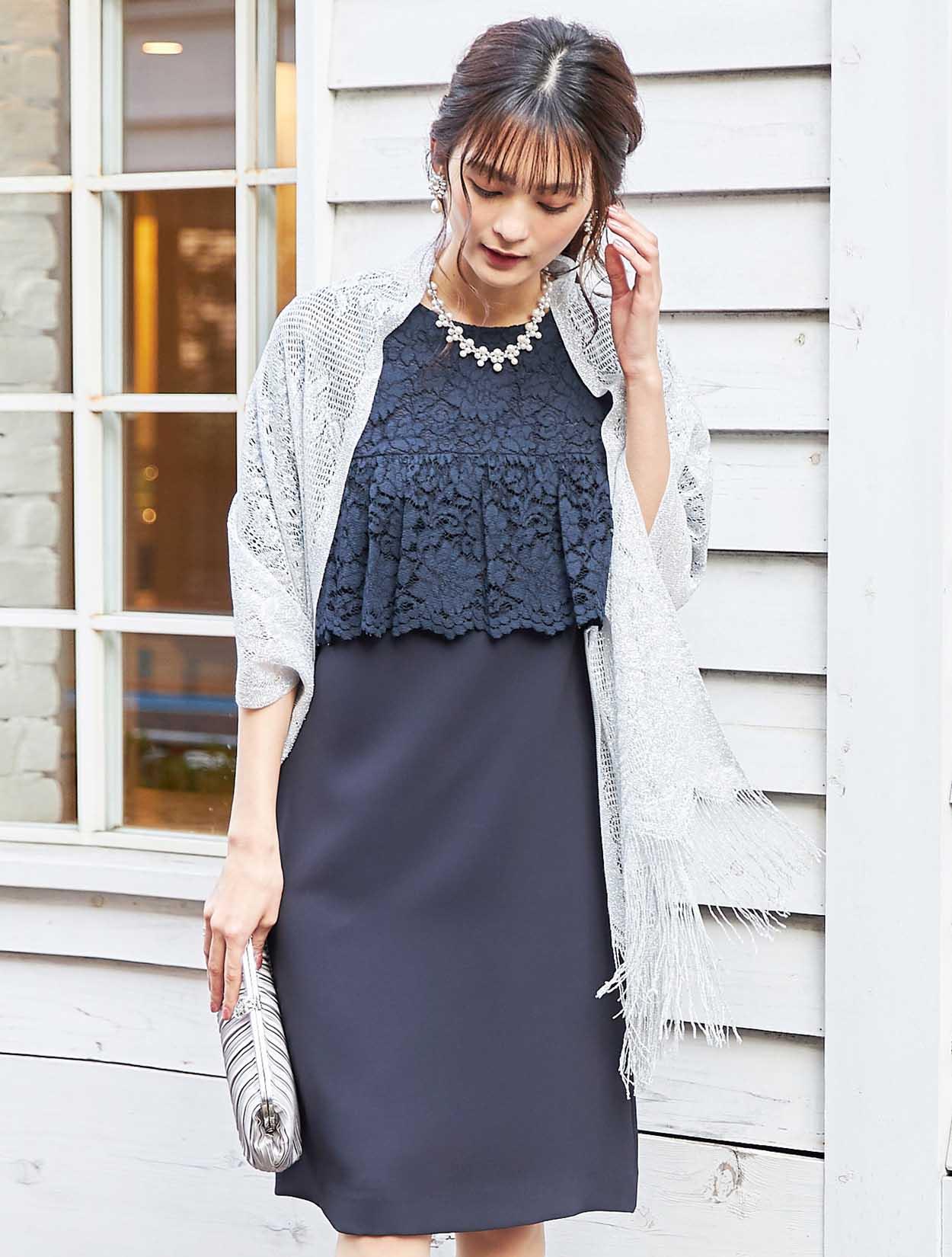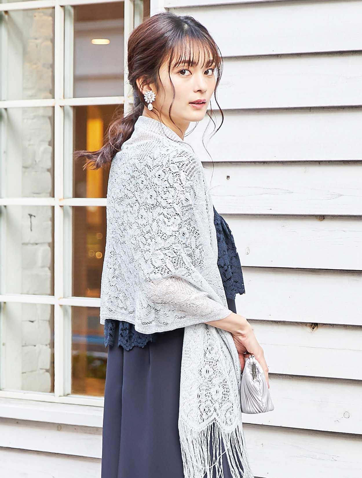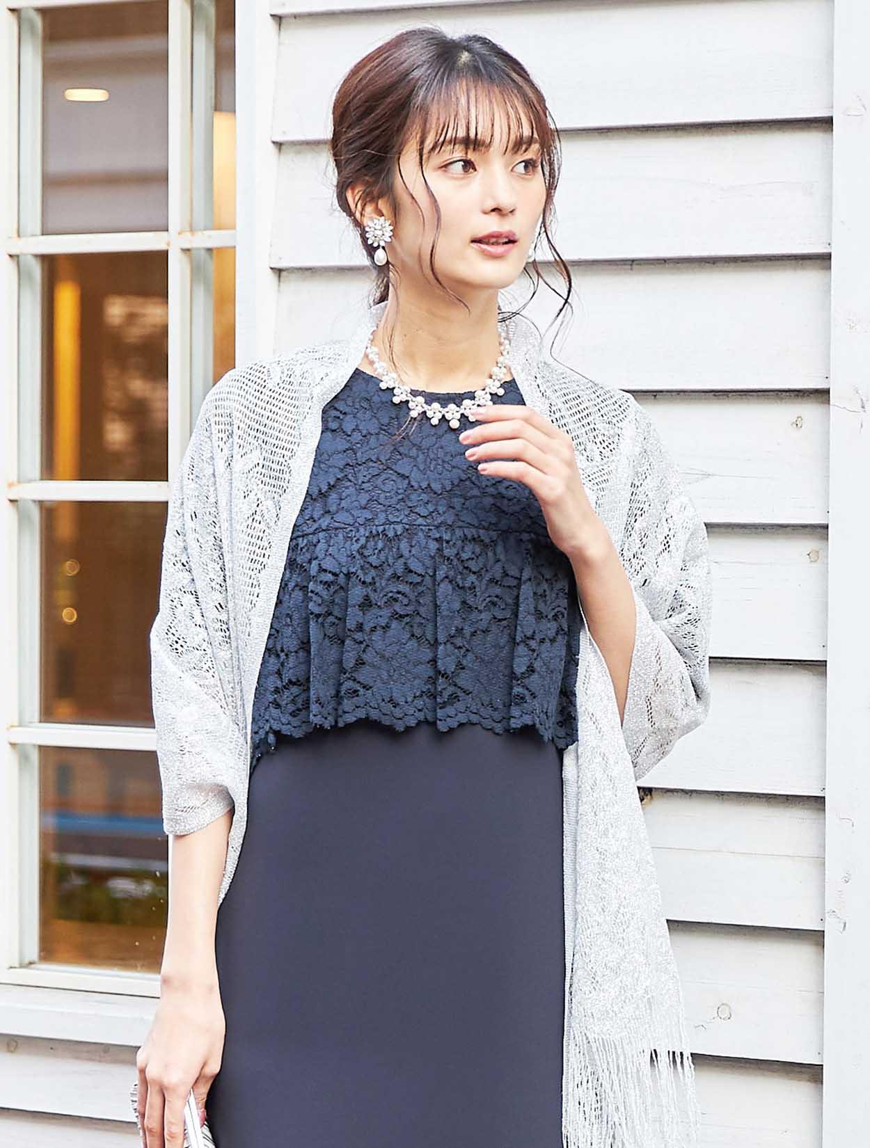 大人フェミニンなネイビーのレースに繊細なラメショールが輝くコーディネート。