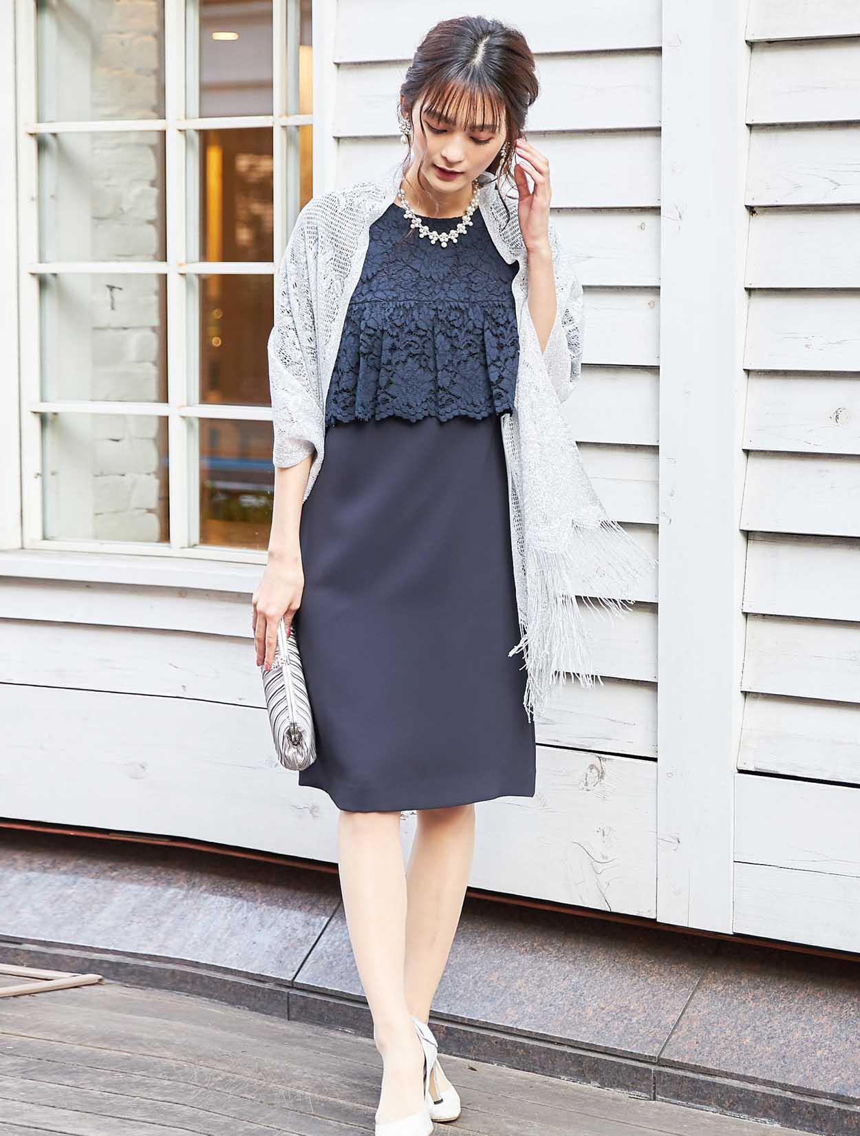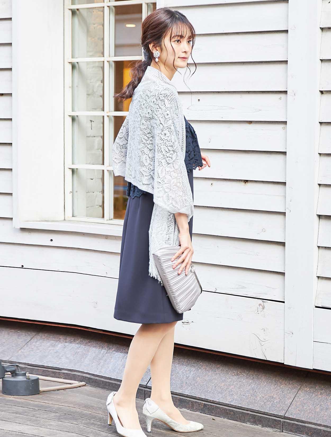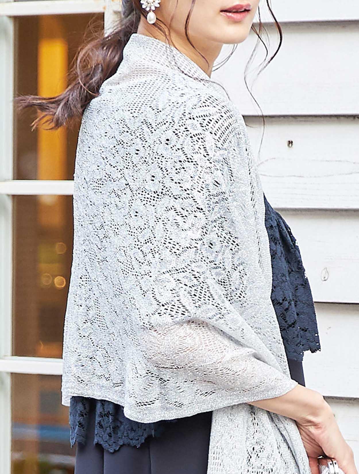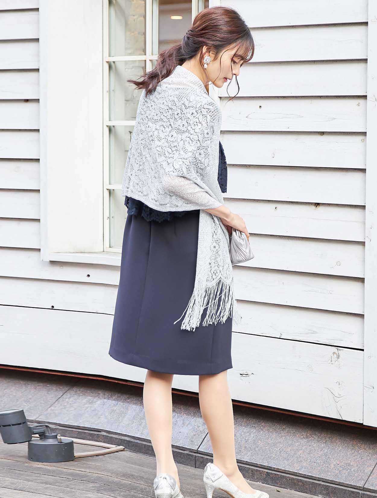 大人フェミニンなネイビーのレースに繊細なラメショールが輝くコーディネート。