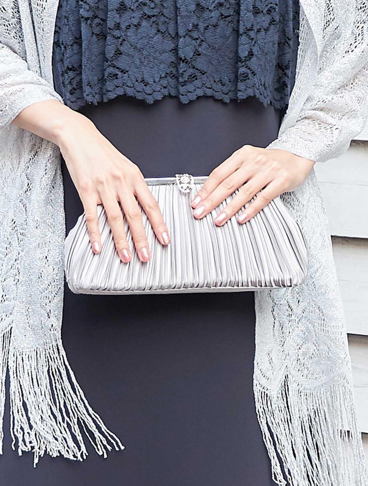小物をシルバーで統一したことで、華麗で上品なスタイルに仕上がります。