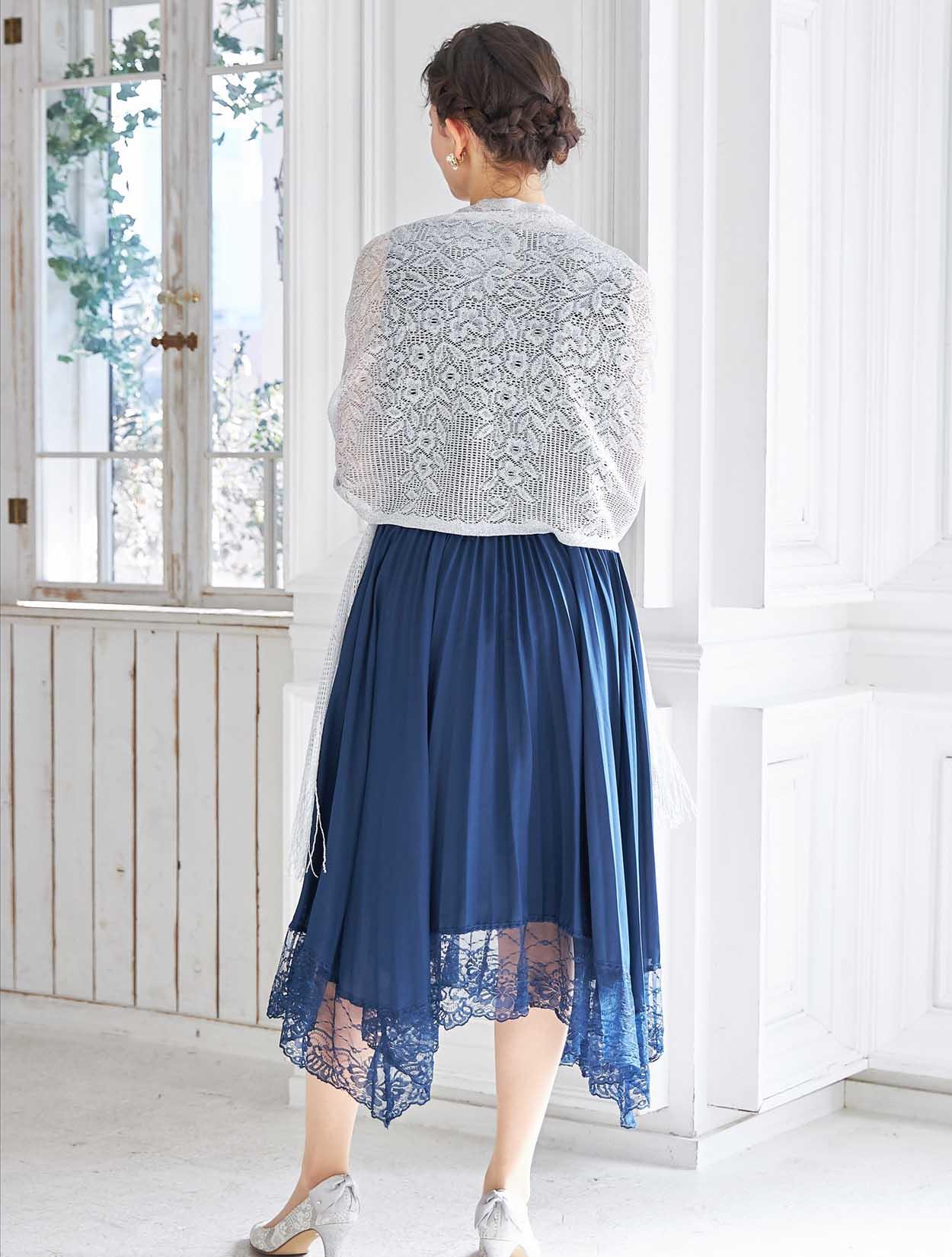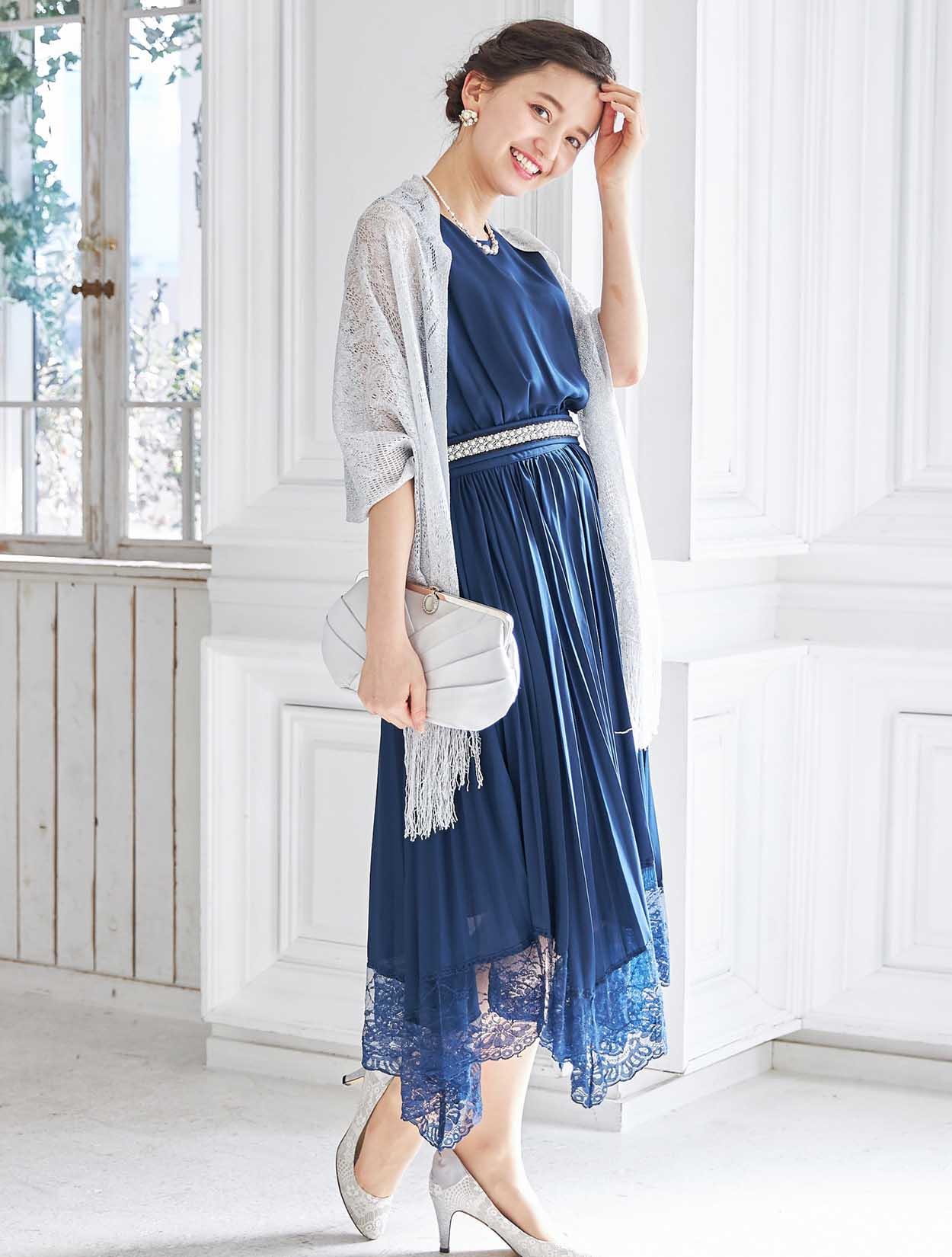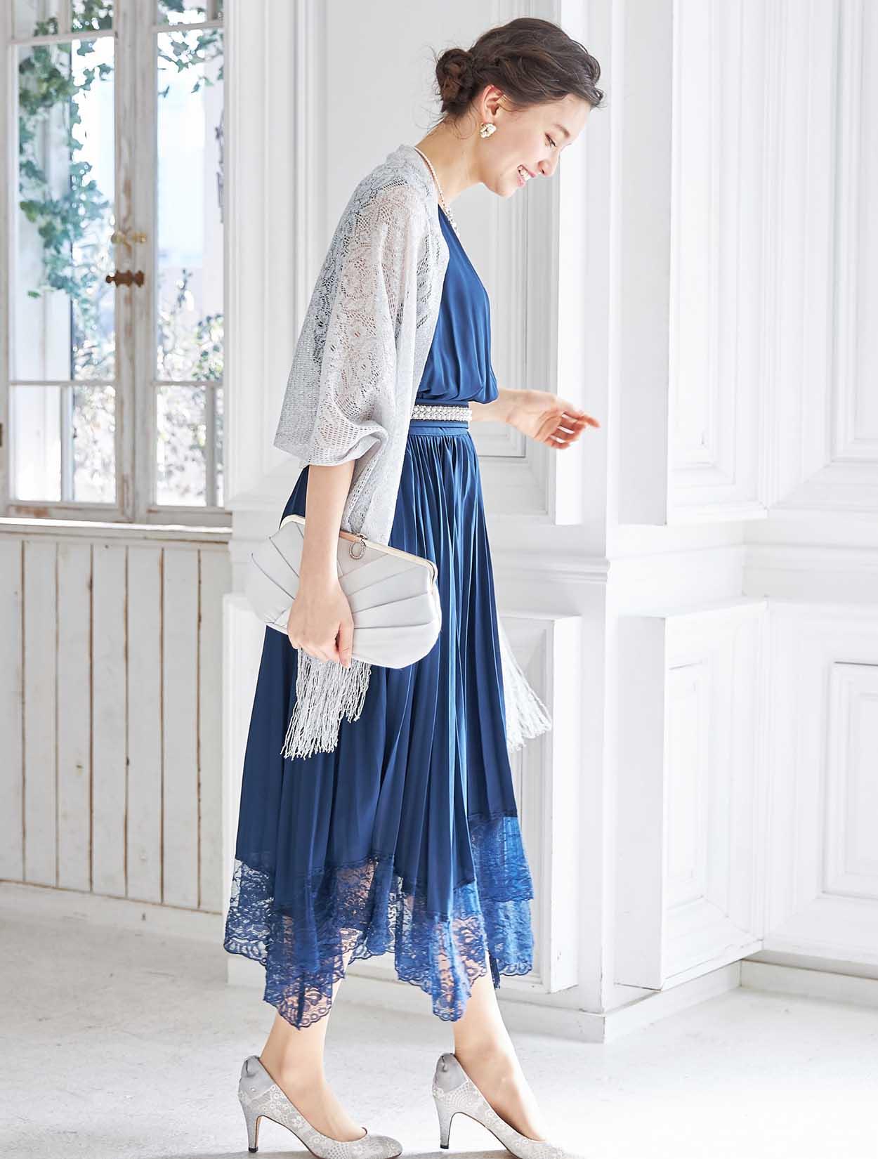 ライトな着心地で透け感のあるシフォン生地とスカート裾にはレースを使用。動くたびに揺れるスカートはエアリー感漂う華やかなドレス。