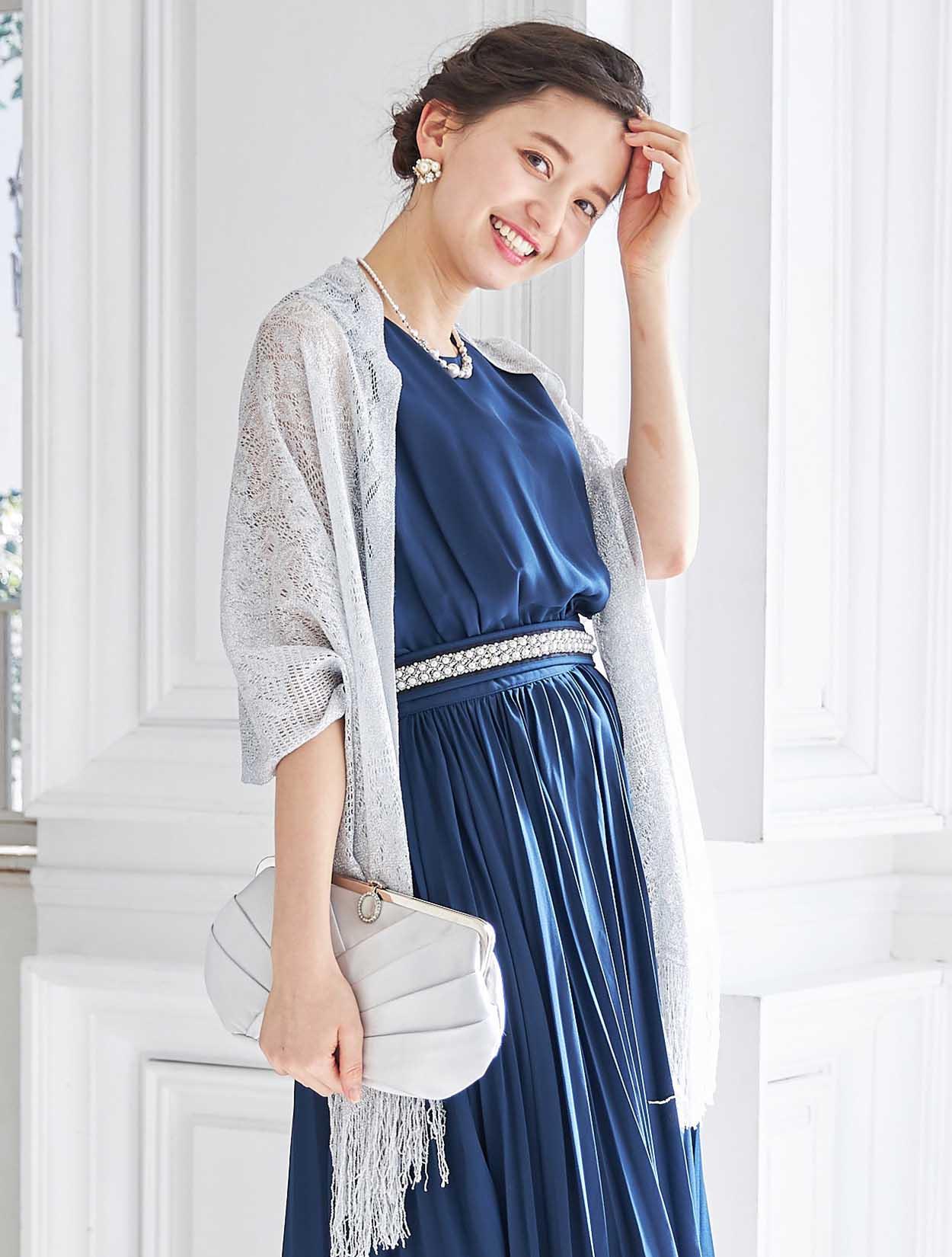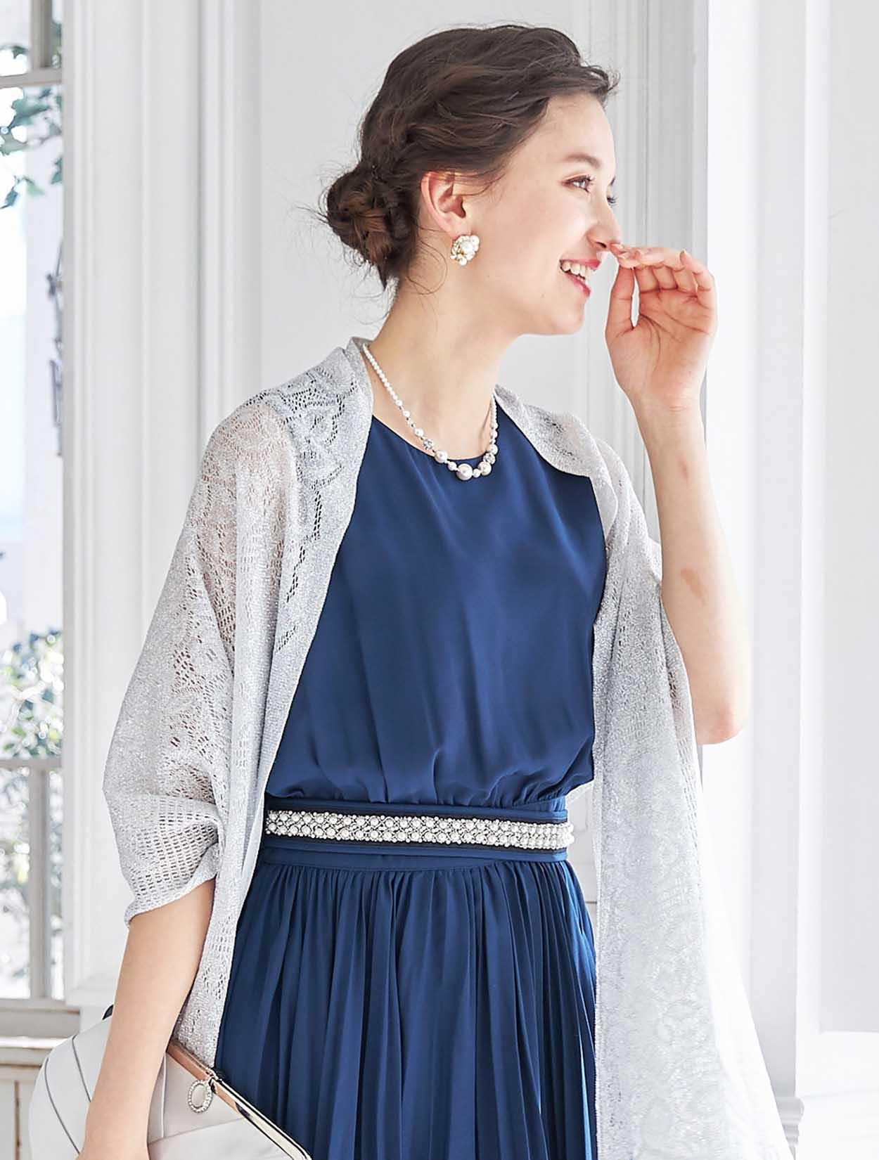 シンプルなネックレスとウエストのパールベルトが程よい華やかなアクセントになります。