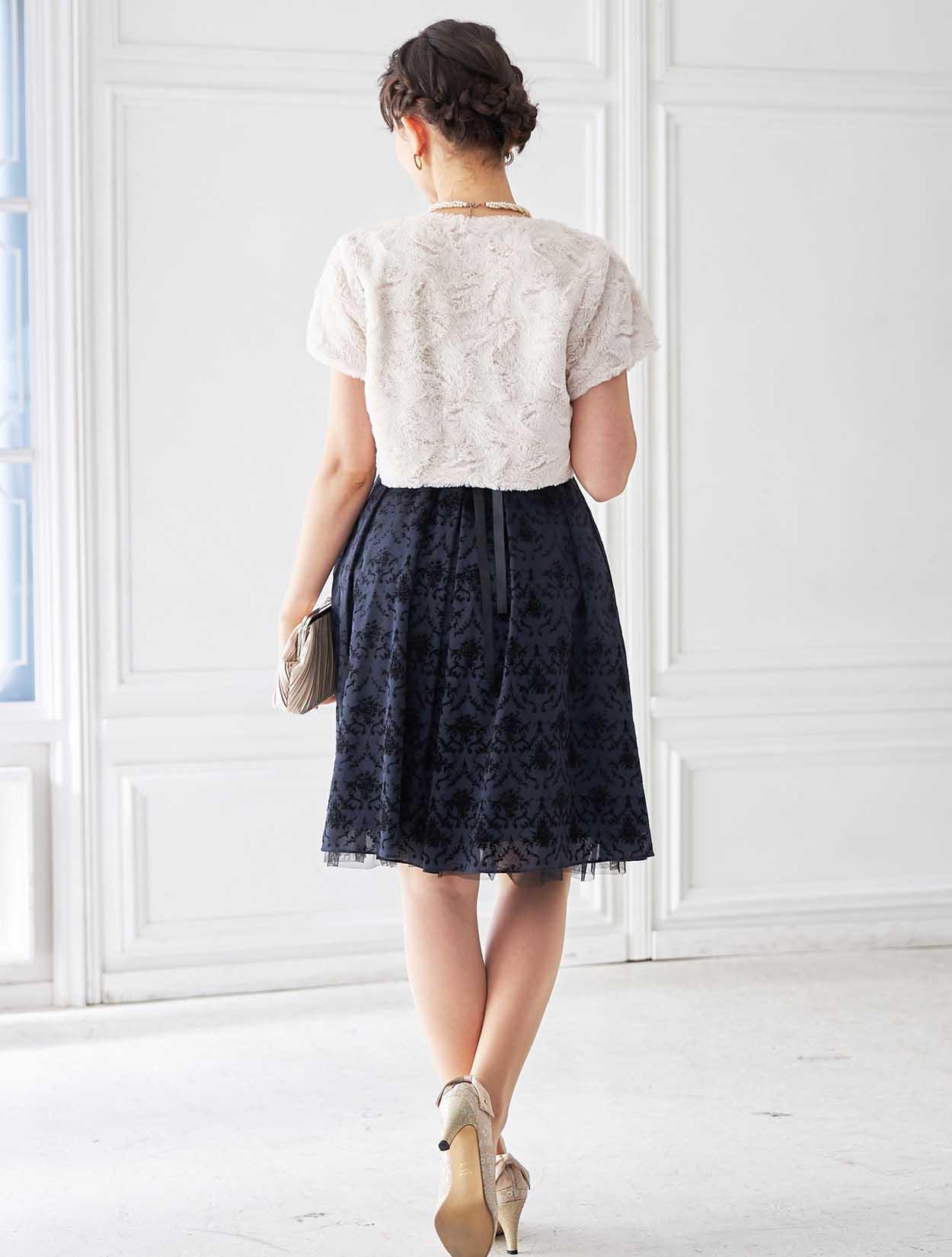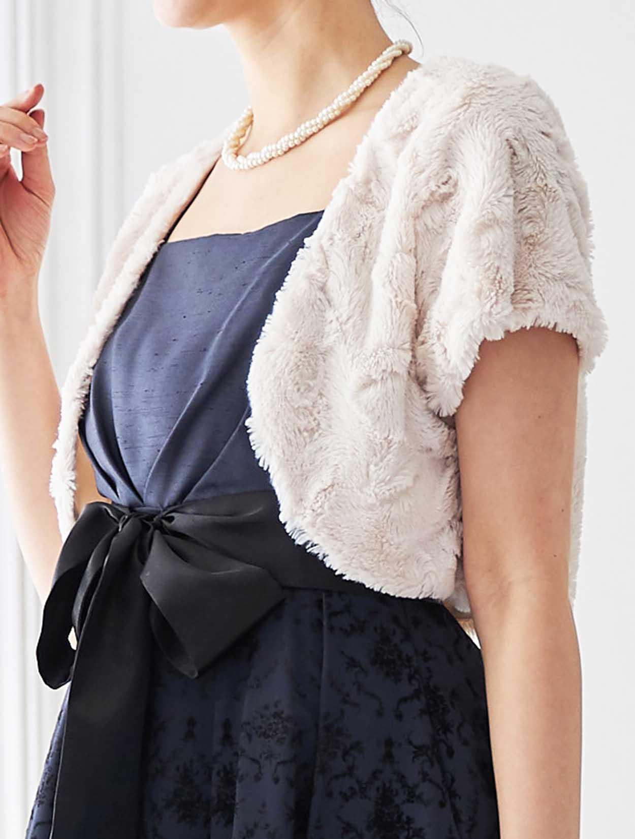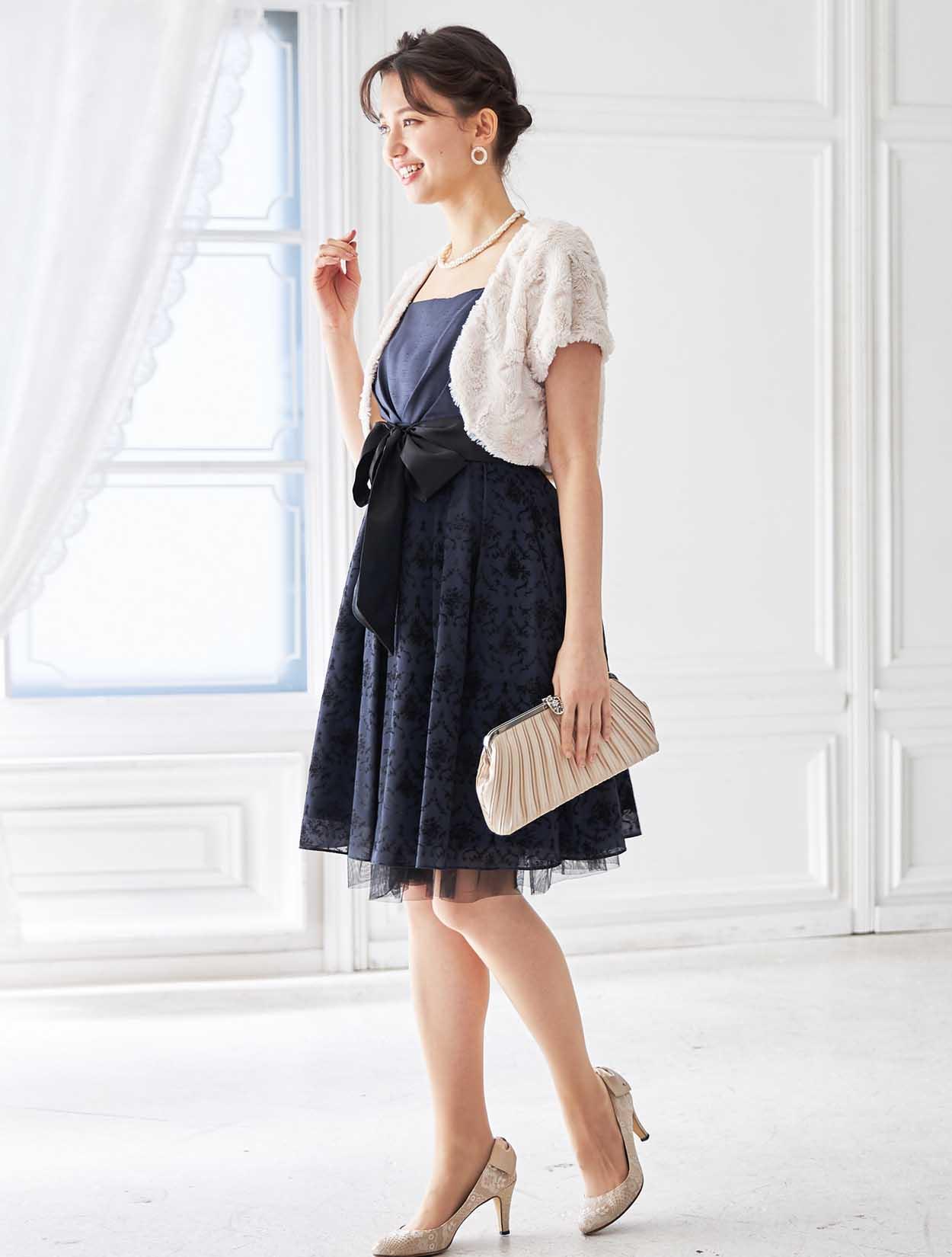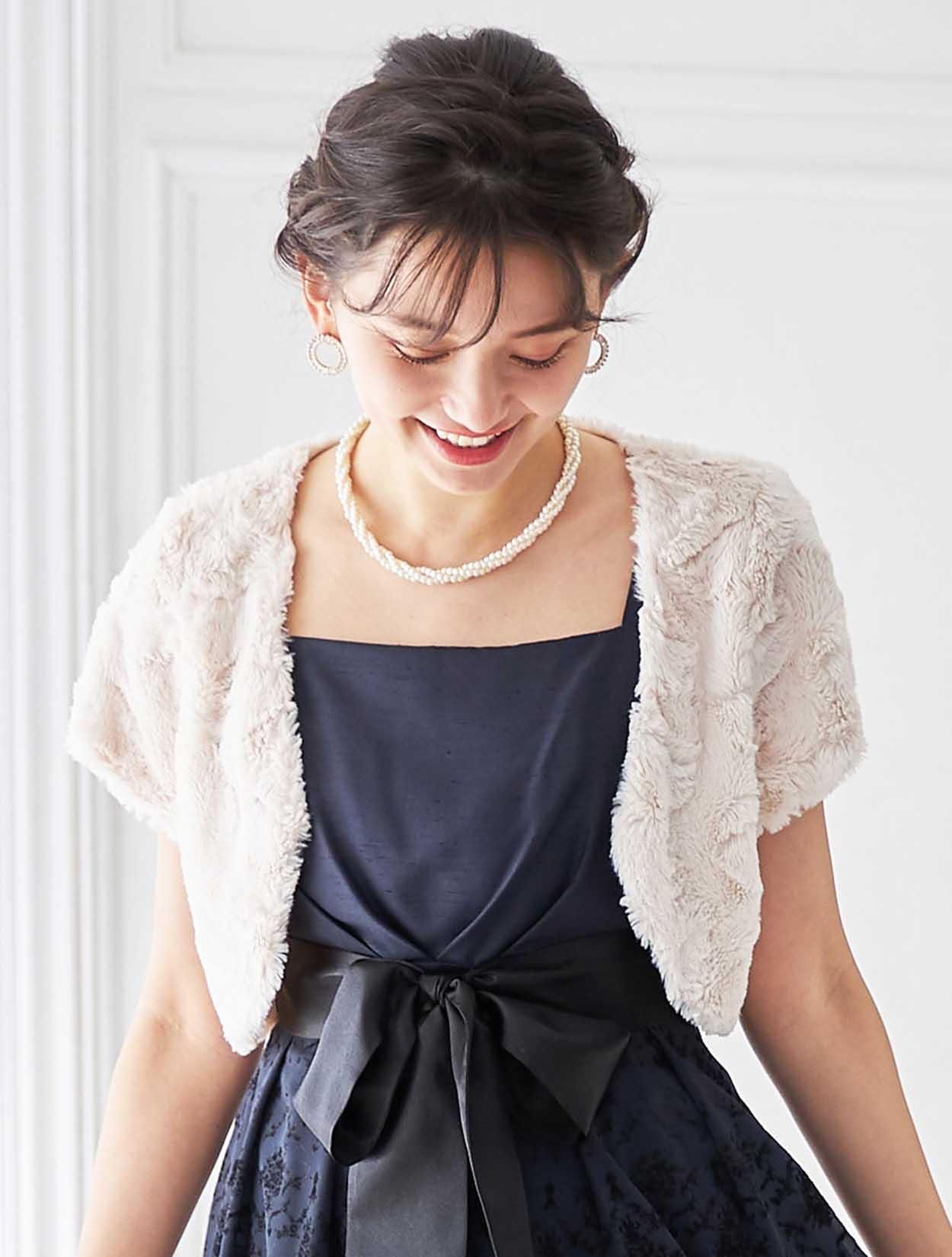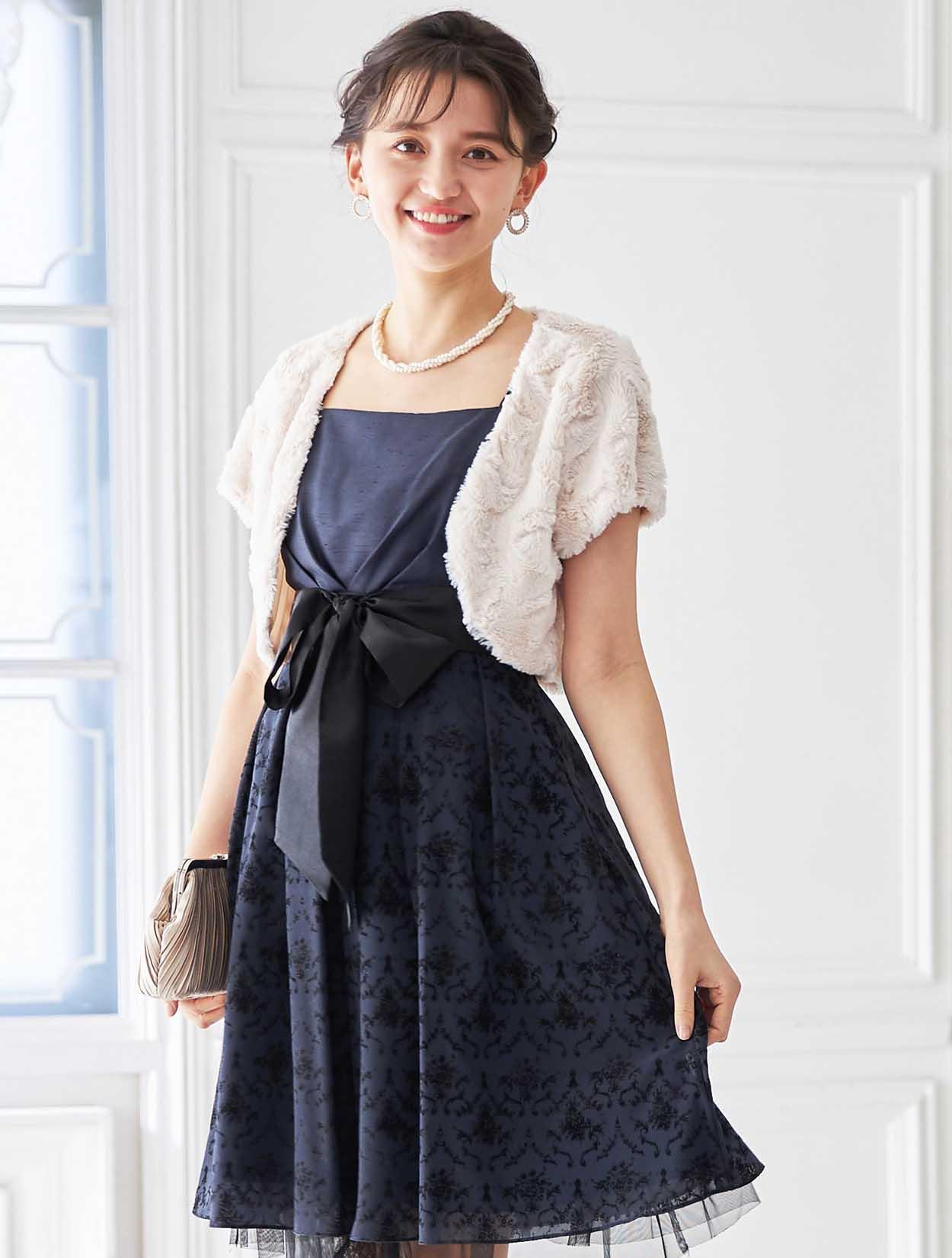 人気の可愛いフェイクファーボレロと、ふんわりとした膝丈ドレスが相性抜群の秋冬パーティースタイル。