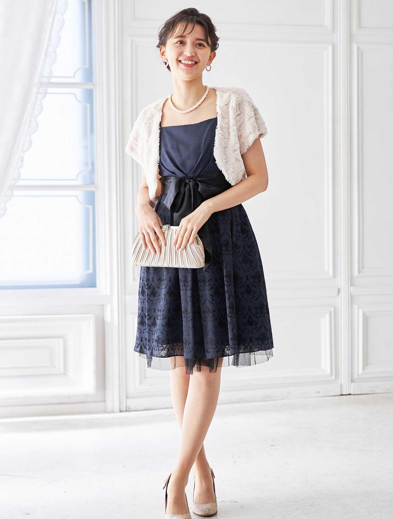 様々なシーンで人気のネイビーは初めてドレスを着る方にもおすすめのカラー。異素材をMIXした奥行きのある表情が華やかな印象をプラスしてくれます。