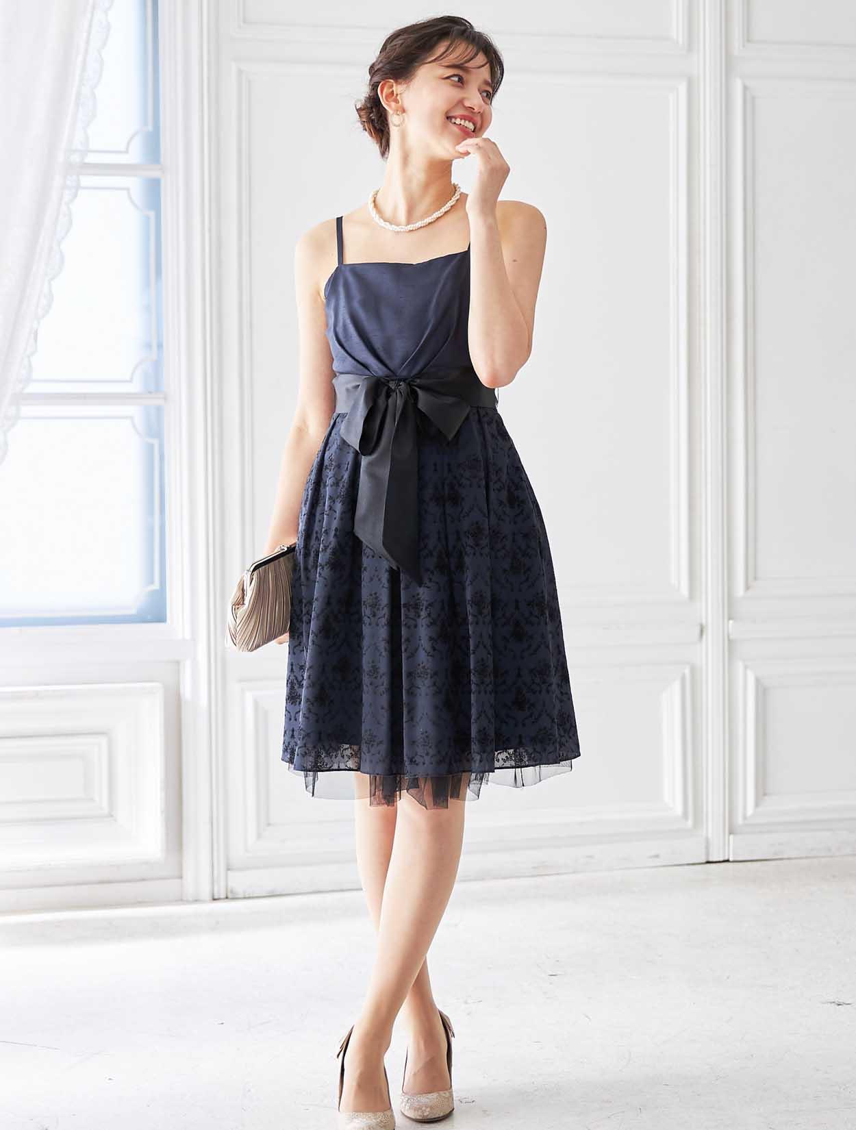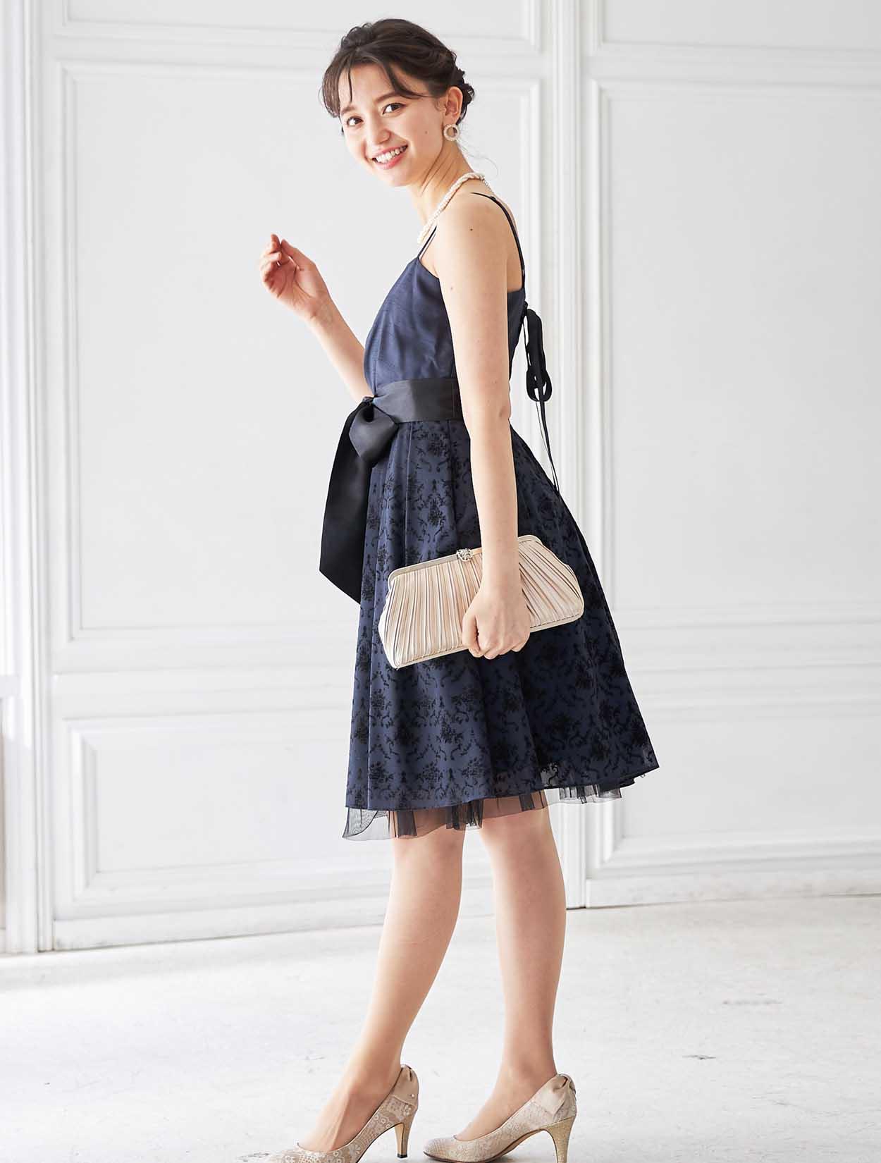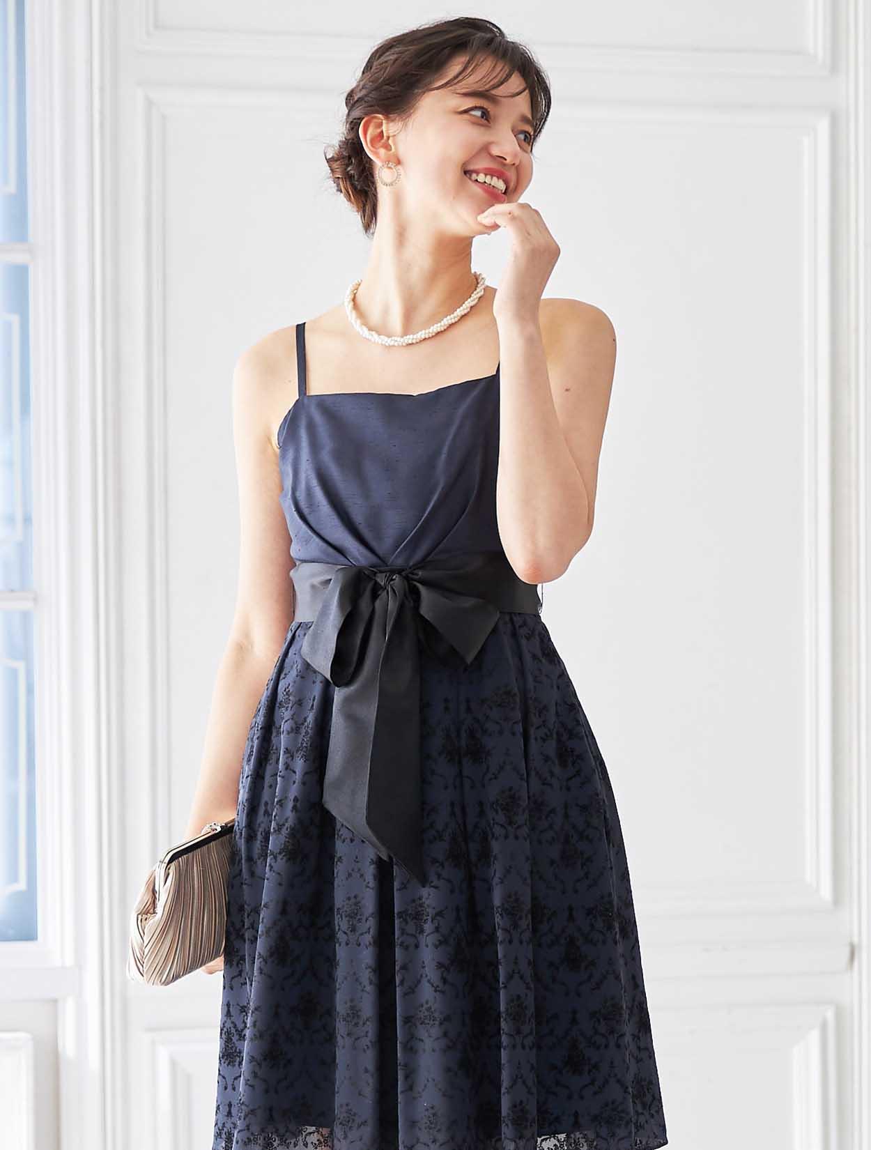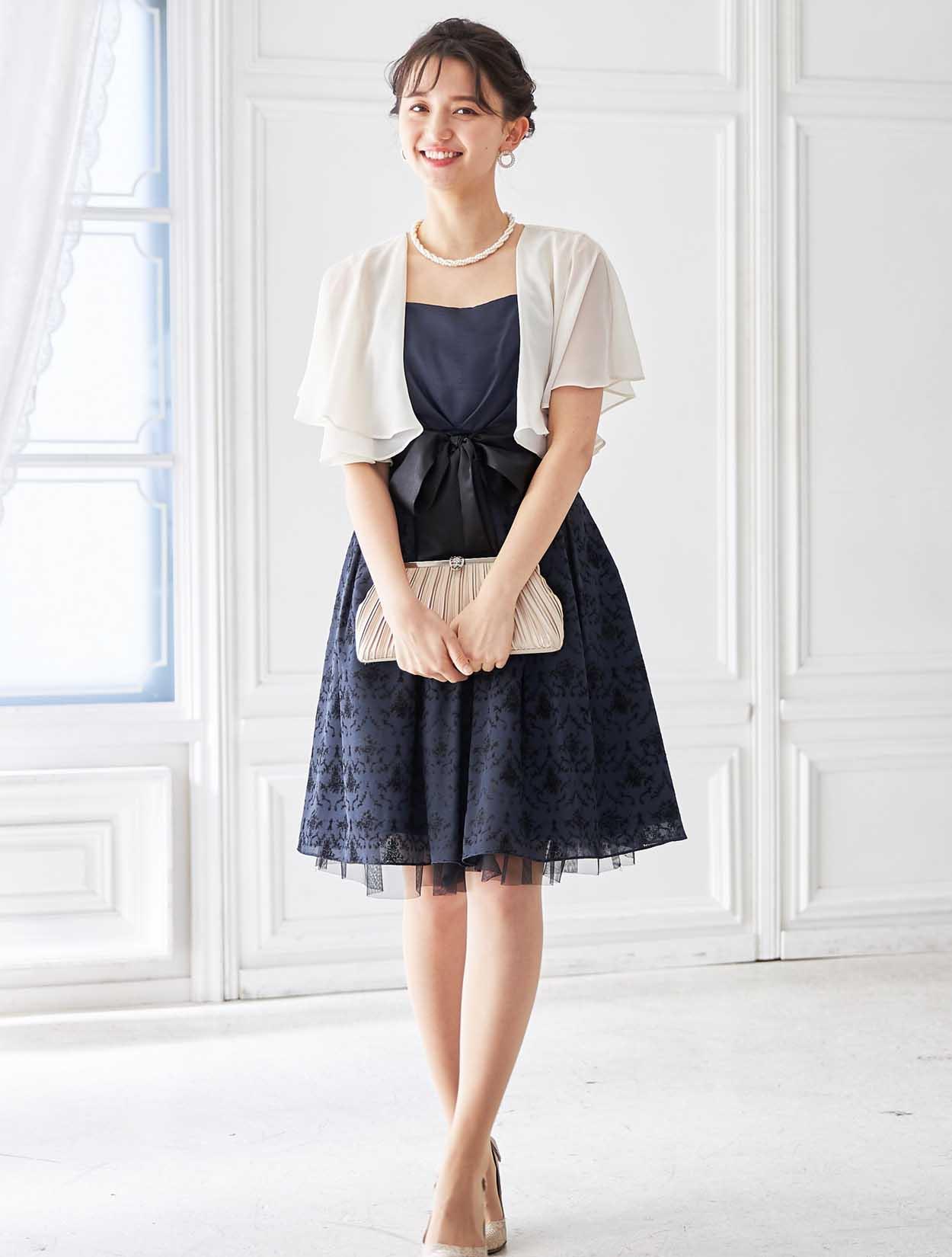 様々なシーンで人気のネイビーは初めてドレスを着る方にもおすすめのカラー。異素材をMIXした奥行きのある表情が華やかな印象をプラスしてくれます。
