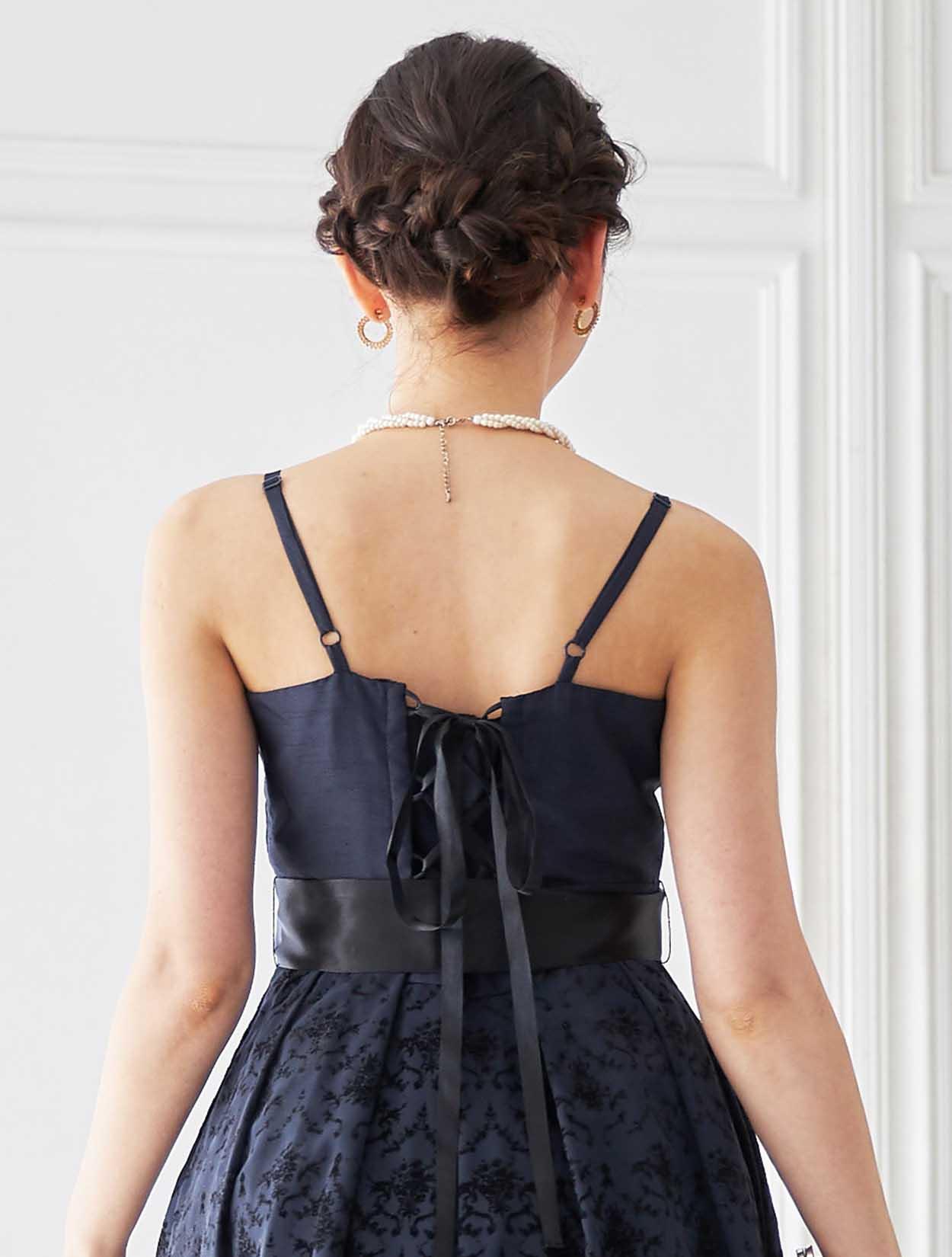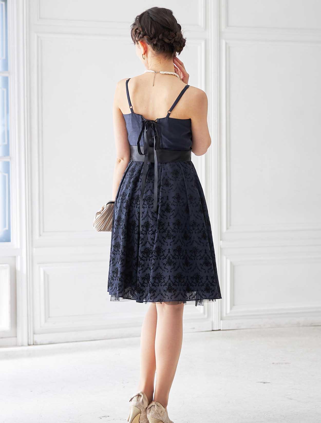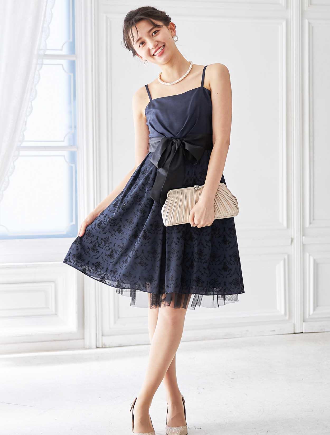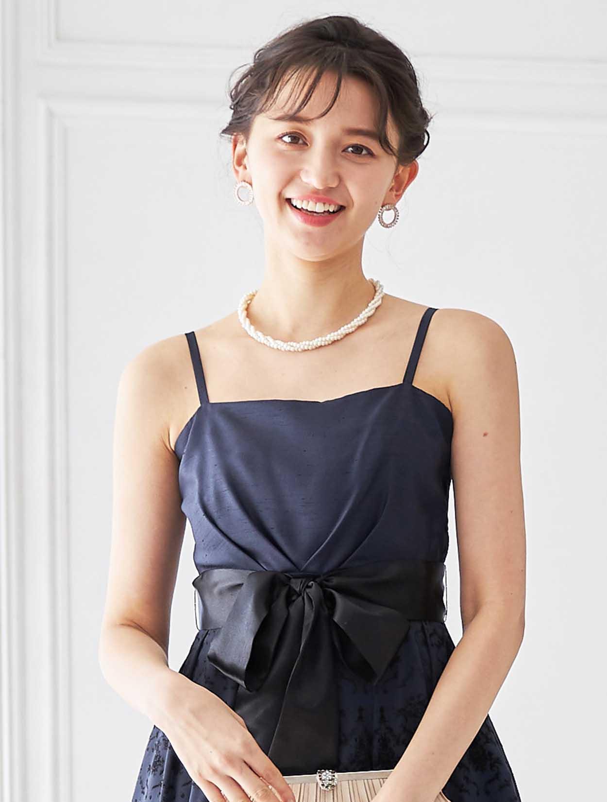 様々なシーンで人気のネイビーは初めてドレスを着る方にもおすすめのカラー。異素材をMIXした奥行きのある表情が華やかな印象をプラスしてくれます。