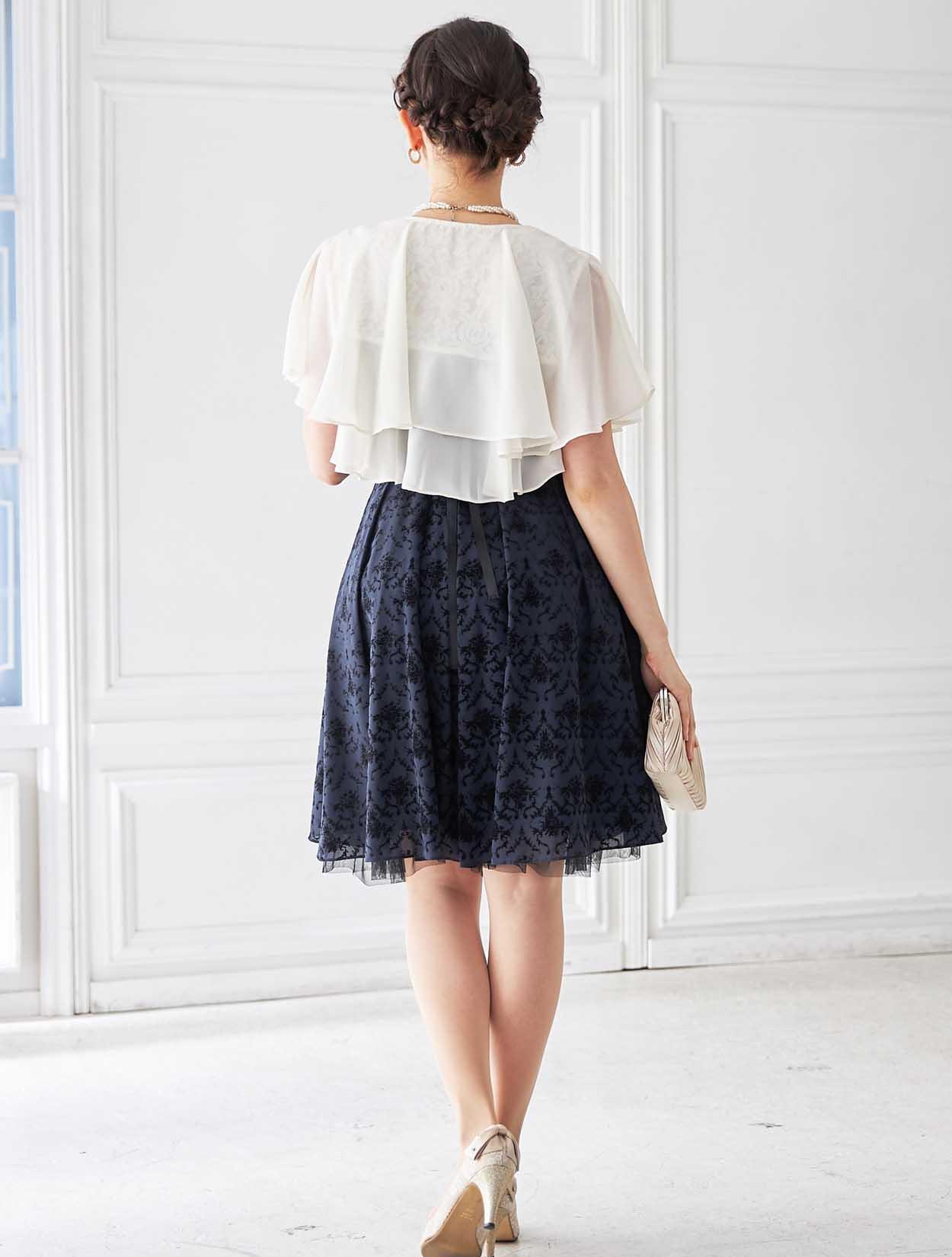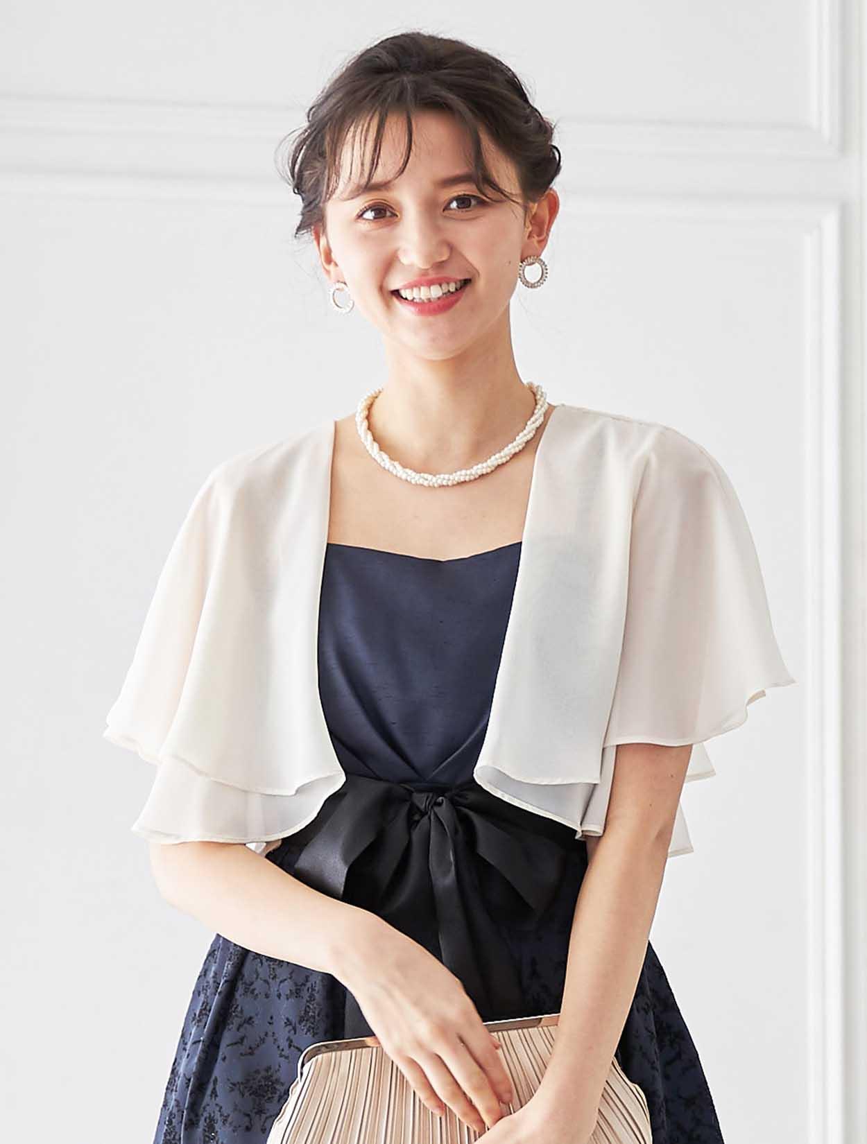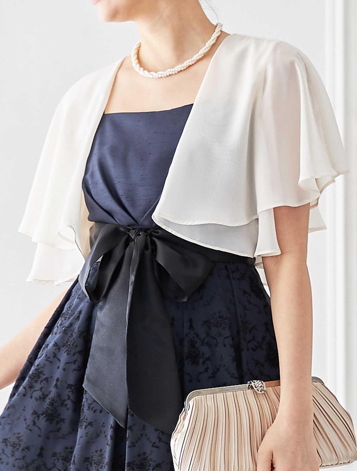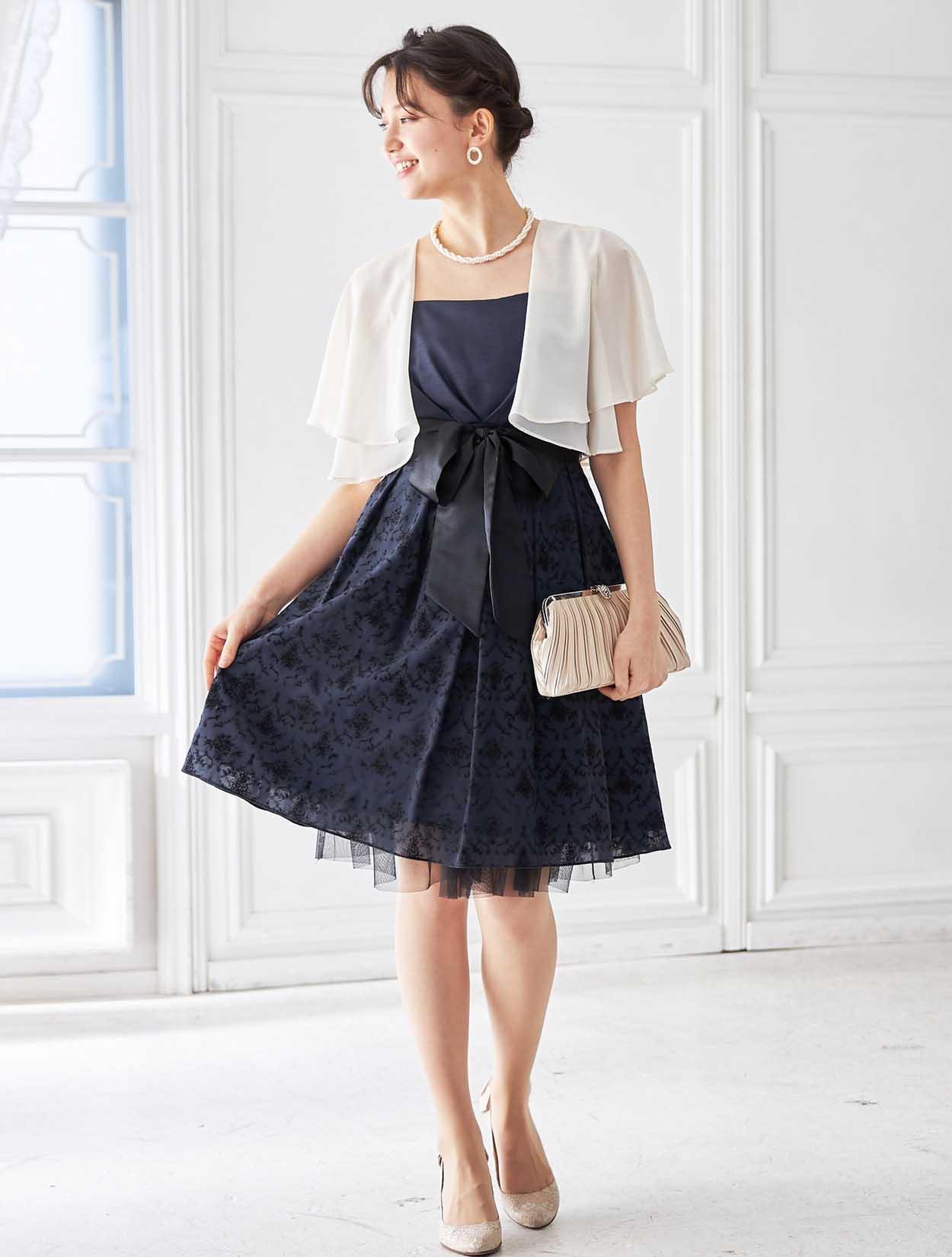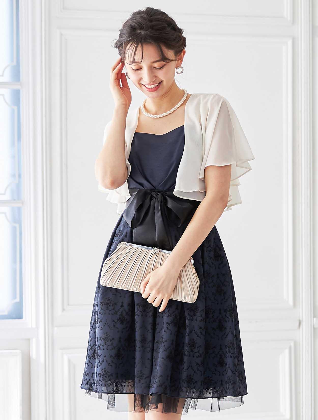 ふんわりとしたエアリー感のあるボレロが、秋冬向けのフロッキープリントドレスを軽やかにコーディネート。