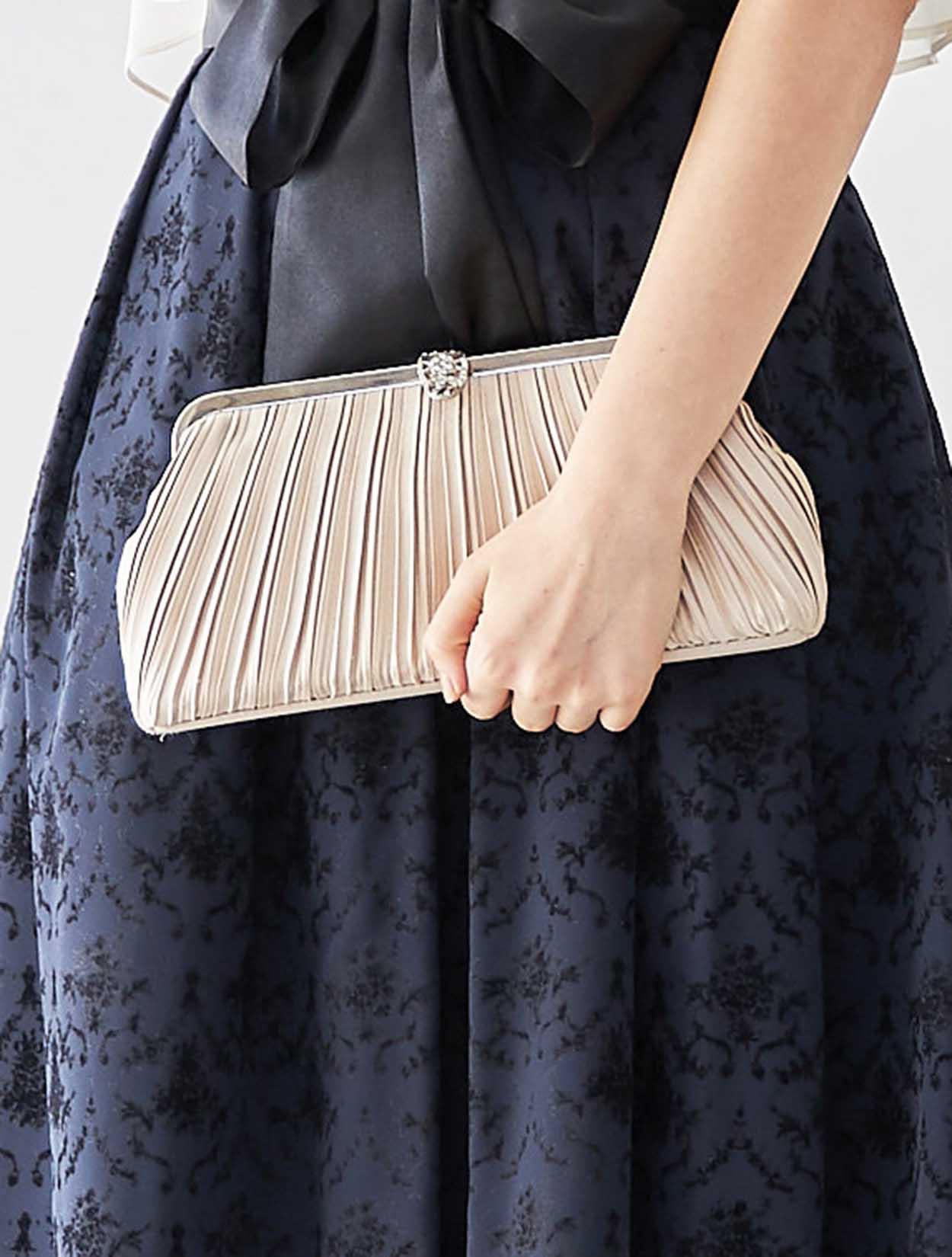 シンプルなネックレスとバッグがドレスのデザインを引き立てます。