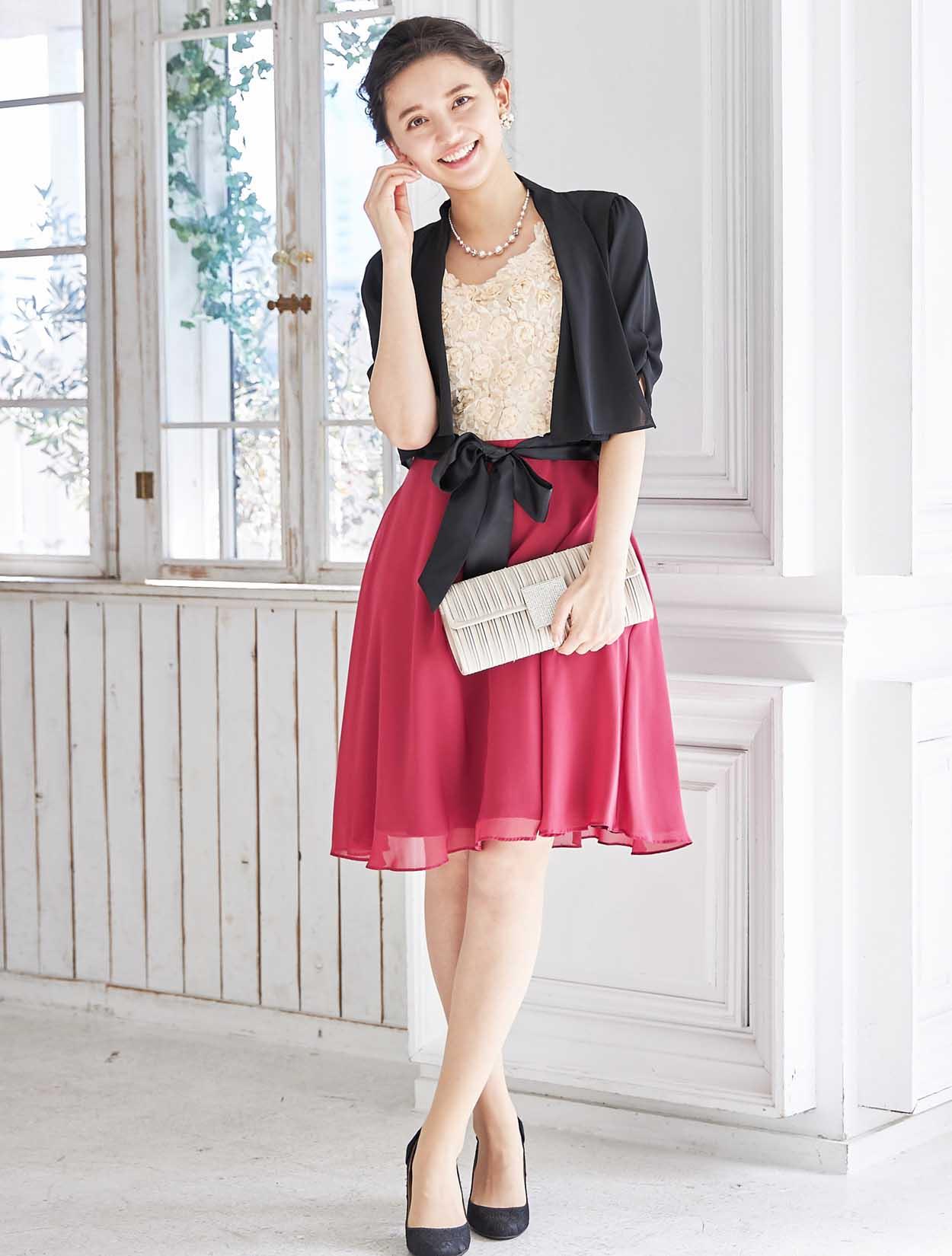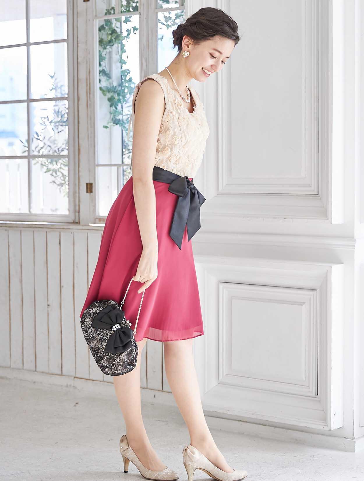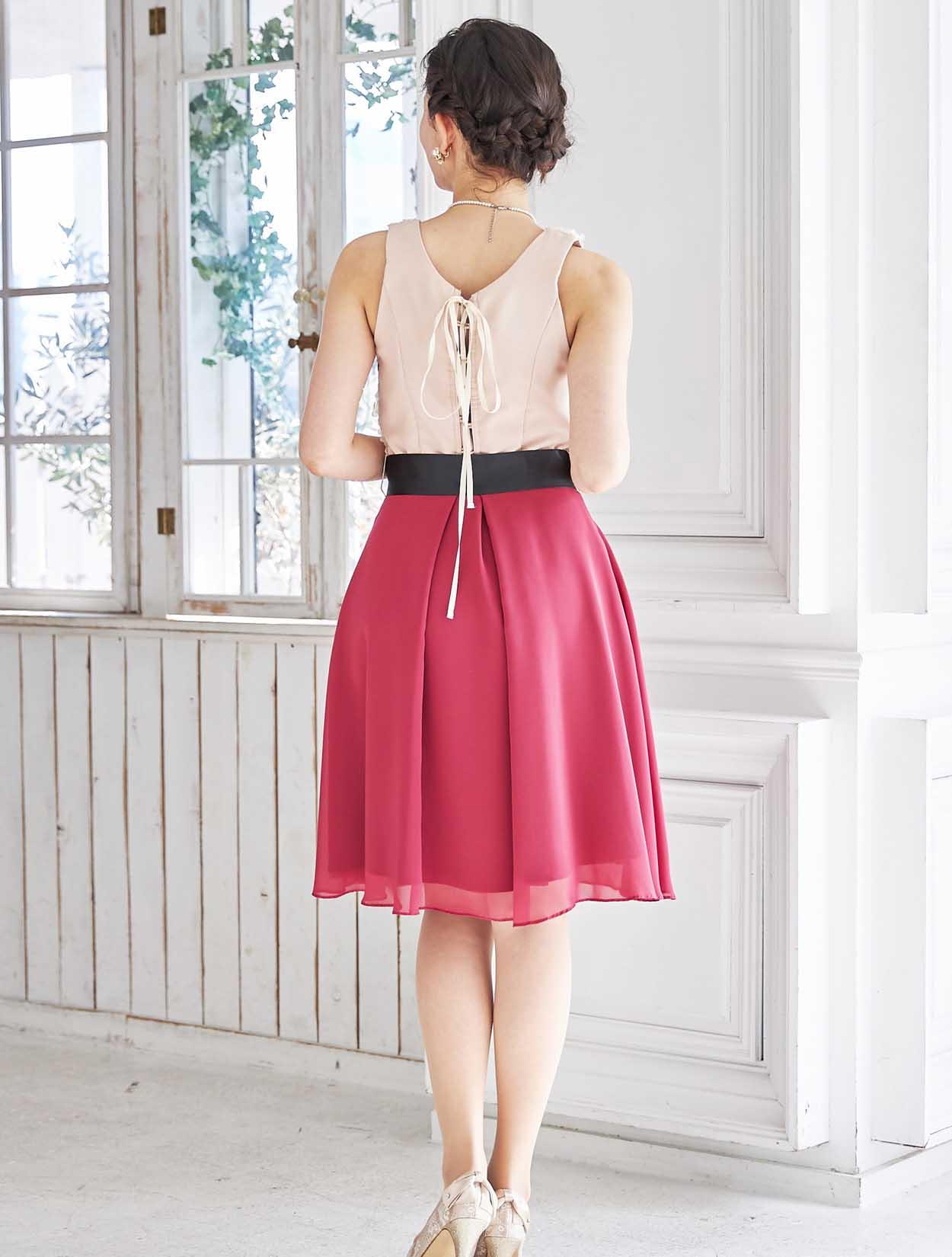 濃いめのピンクの様なレッドは周りをパッと明るくするカラー。ベージュとのバイカラーは初めてのカラードレスでも挑戦しやすい配色です。