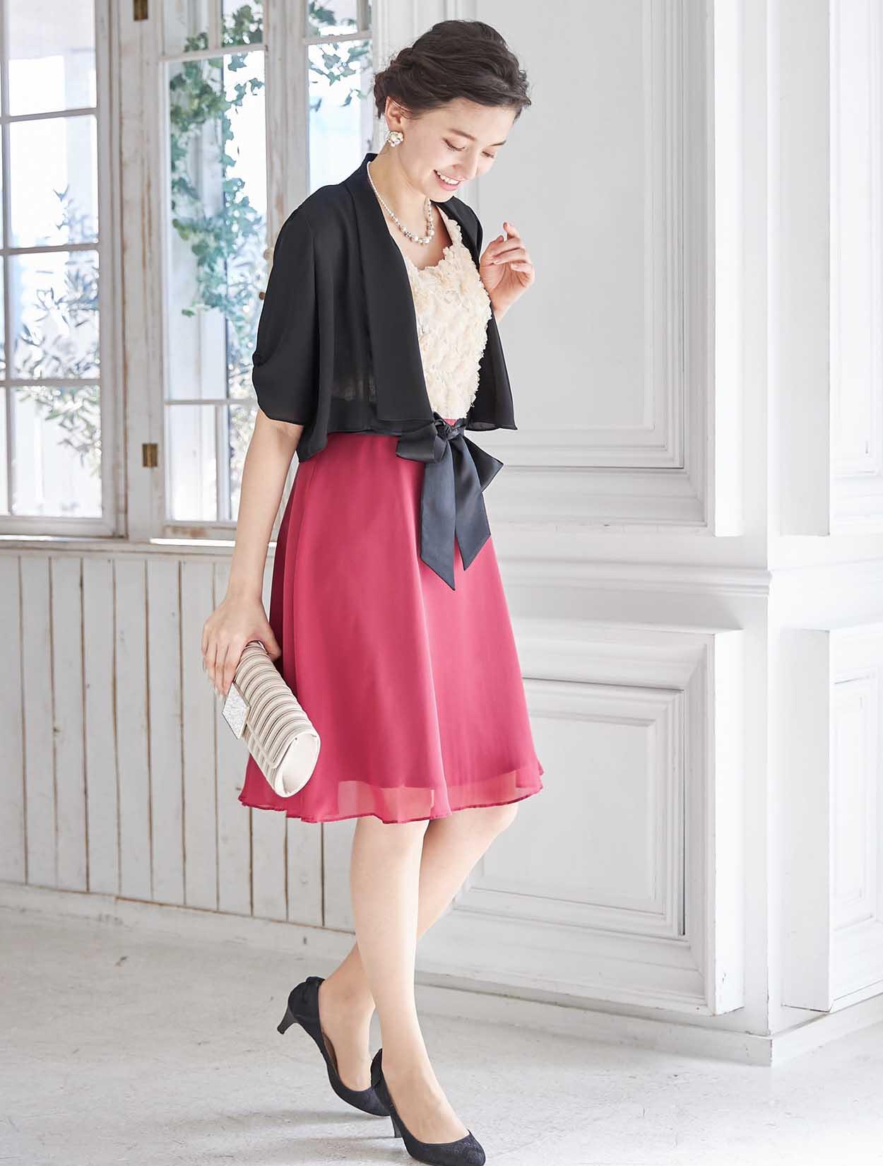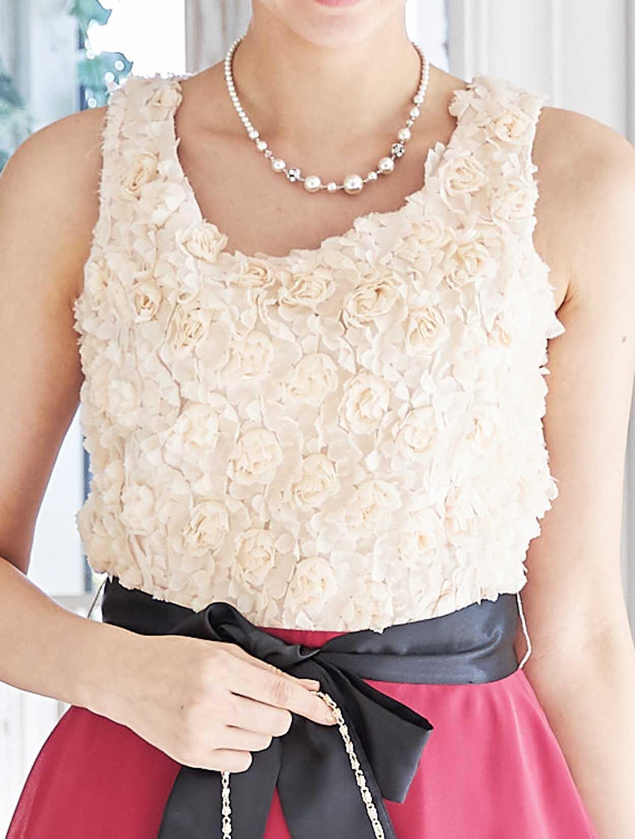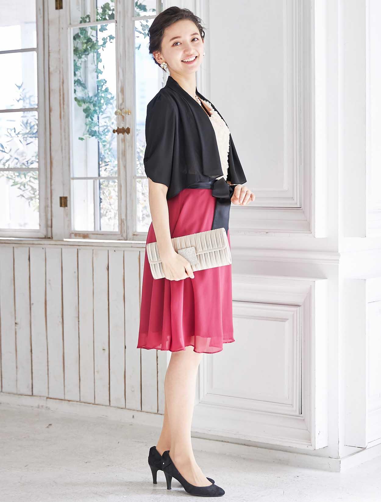 濃いめのピンクの様なレッドは周りをパッと明るくするカラー。ベージュとのバイカラーは初めてのカラードレスでも挑戦しやすい配色です。