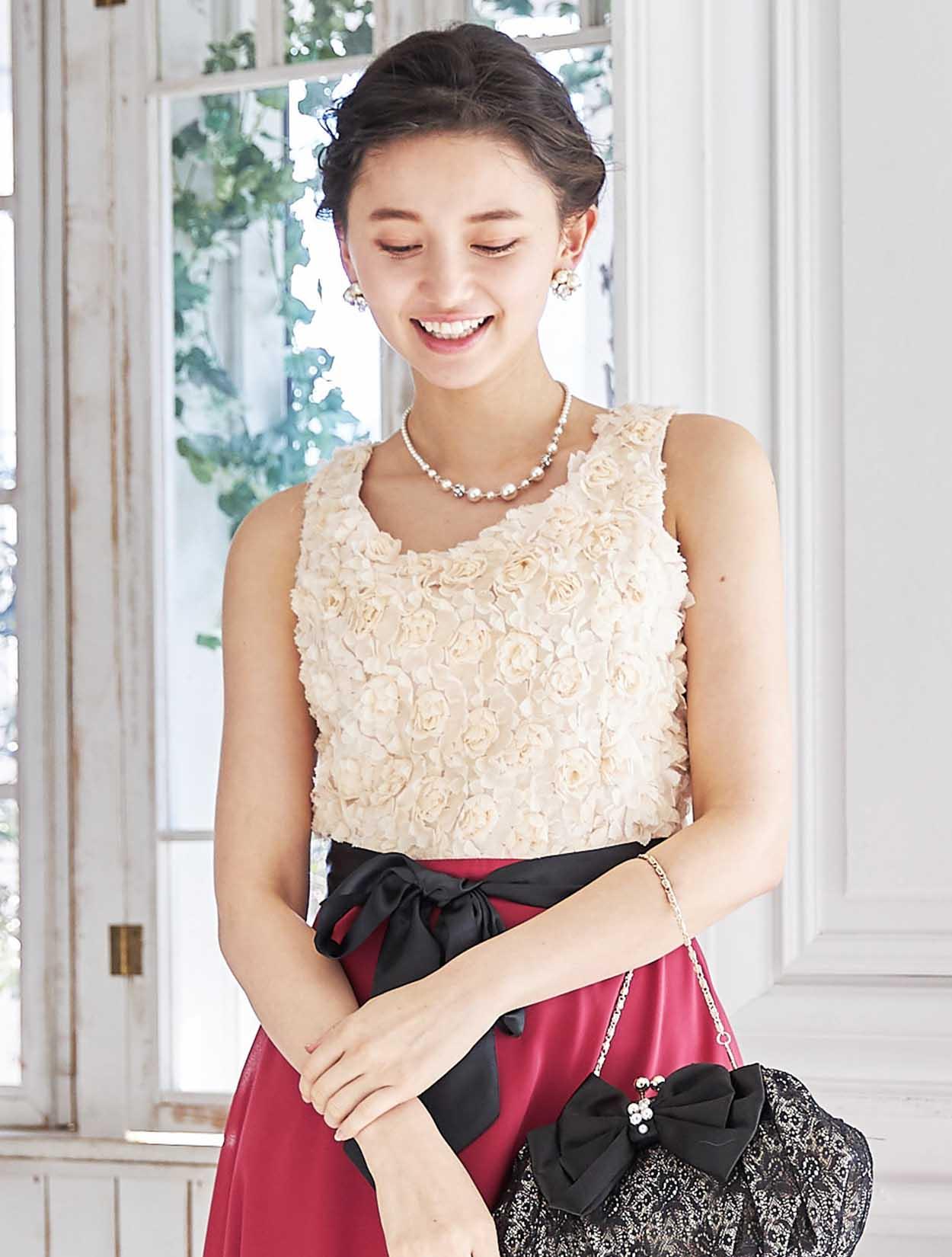 トップのバラモチーフデザインがフェイスラインをグッと華やかに。甘さを抑えた落ち感のあるスカートとのギャップがさり気ないポイント。
